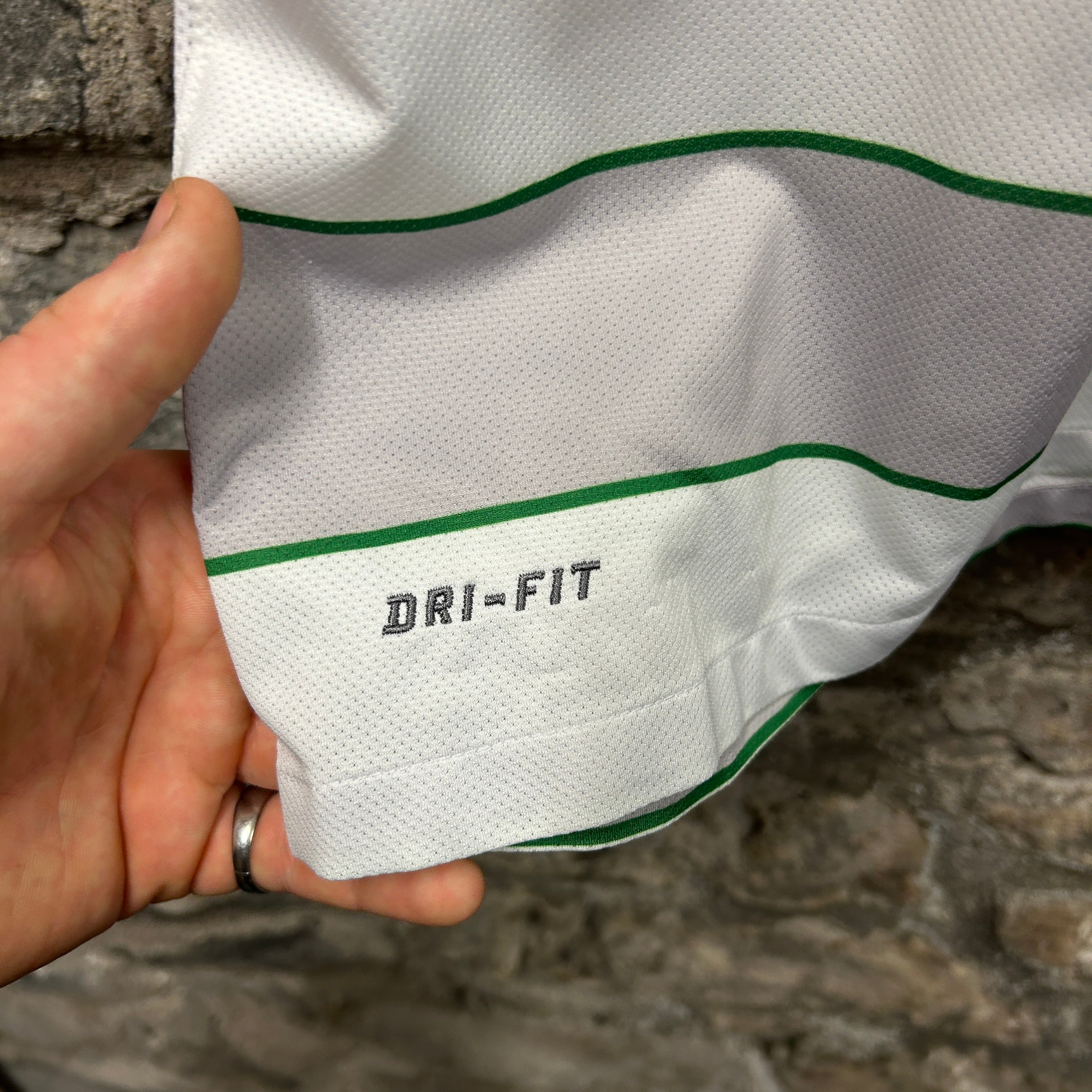 Product details: Nike Celtic FC home football shirt with classic hooped stripe design (white/grey base with thin green hoops), contrast green ribbed crewneck and green sleeves. Features embroidered Nike swoosh, embroidered Celtic crest with single star above, large "TENNENT'S" sponsor print across chest, "DRI-FIT" heat transfer at hem, "AUTHENTIC" jock tag with code 022246211, and sleeve detail band with "1888". Back neck has small "CELTIC" print. Mesh performance fabric typical of early 2010s Nike kits. Brand: Nike.| Label Size | |
