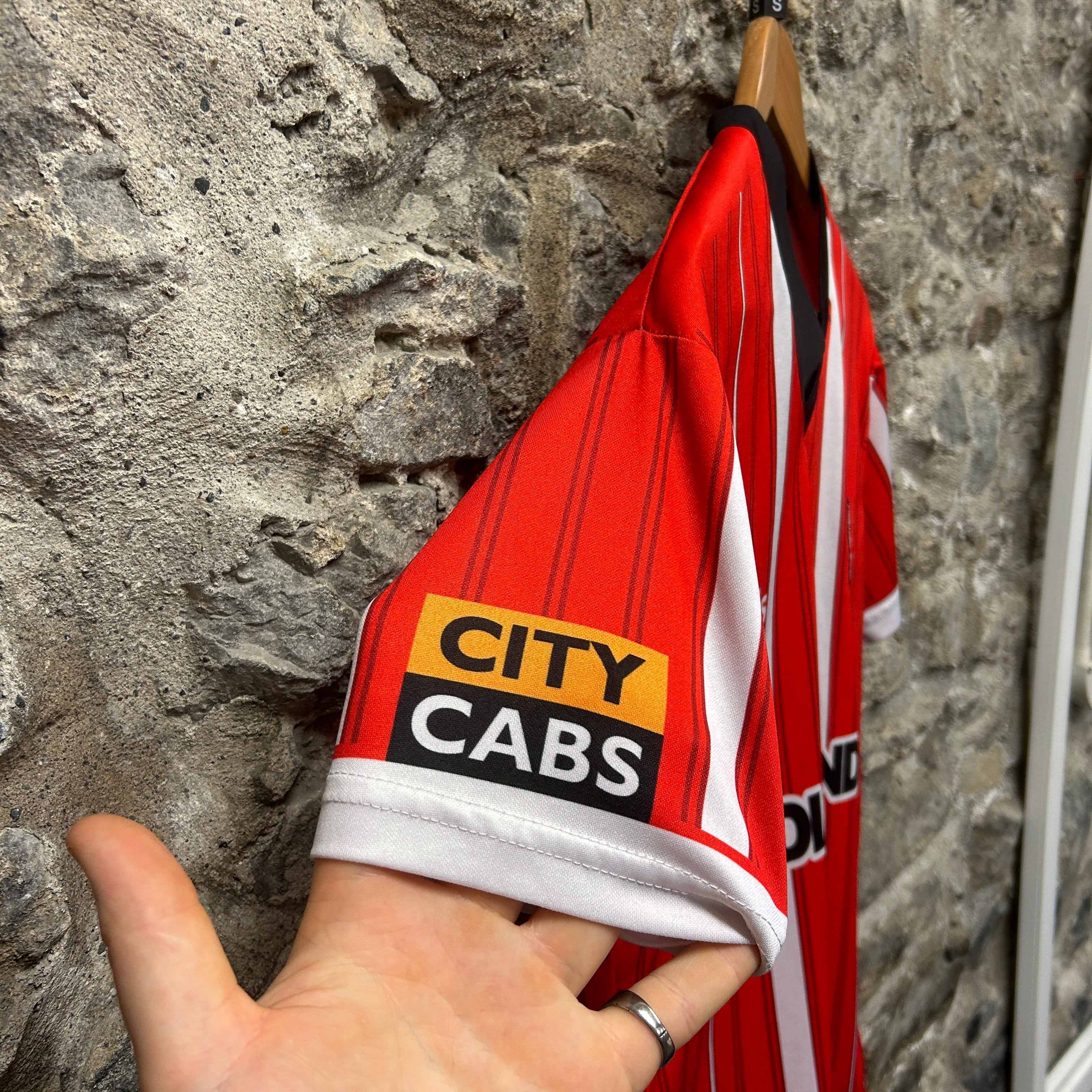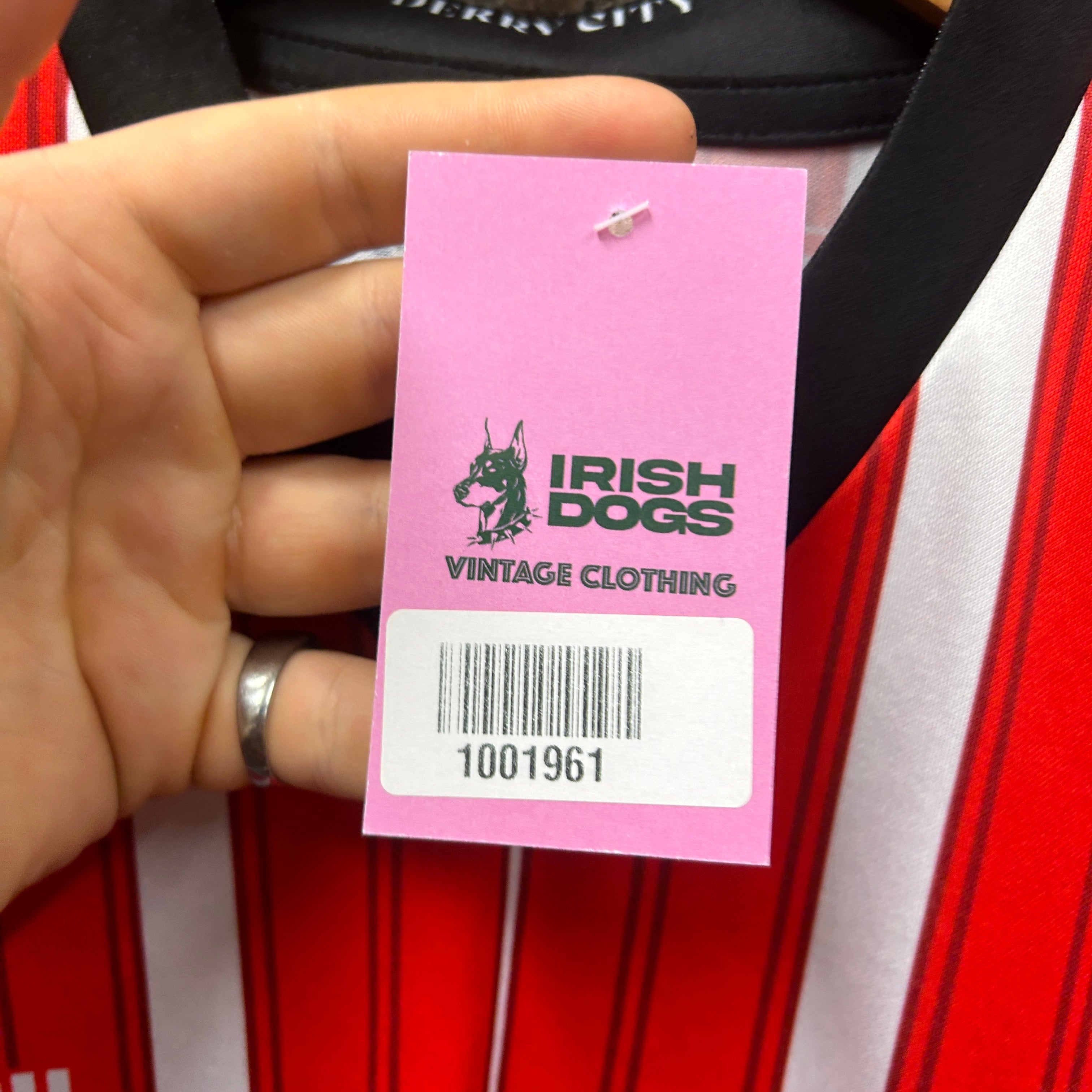 Product details: Derry City FC football shirt by O'Neills in bright red with vertical pinstripes and bold white stripe panels. Black V-neck collar with "DERRY CITY" text at inner neck, embroidered Derry City Football Club crest on chest, "oneills" logo, and large "DIAMOND" sponsor print across the front. Sleeve sponsor patch reads "CITY CABS". Back features "budgetenergy" sponsor and upper-back "GMK Gallagher & McKinney Ltd" logo. Small hem detail includes "1928" and "KOOLITE®" performance-fabric marking. Displayed on a wooden hanger against a stone wall; visible retail swing tags from Irish Dogs Vintage Clothing (barcode 1001961) and a handwritten price/size card. Brand: O'neills.| Label Size | |