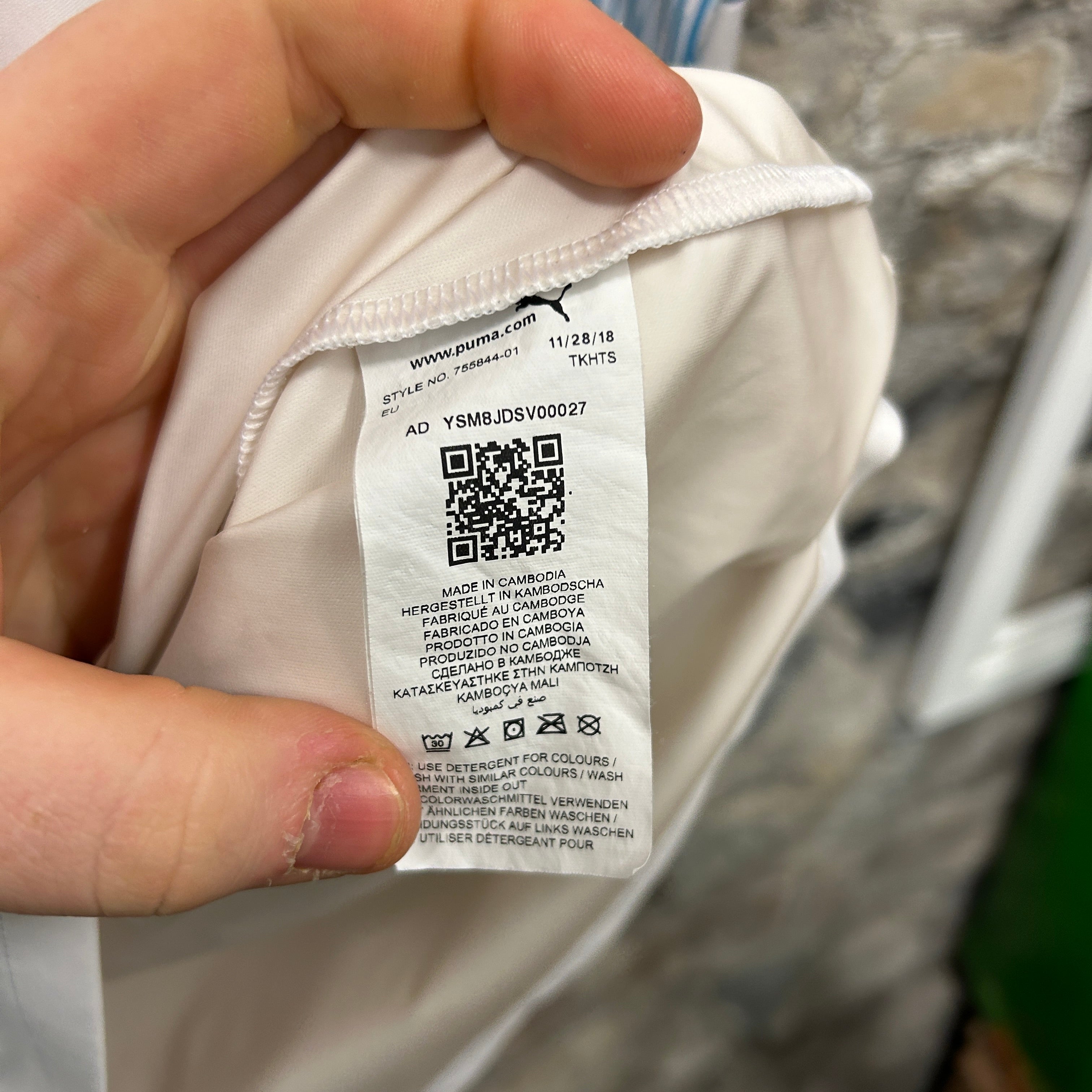 Product details: Puma Olympique de Marseille long-sleeve training/football top in white with sky/royal blue accent panels. Features striped graphic print across the shoulders and collar, raglan sleeves, printed Puma cat on chest and OM crest with gold star and "DROIT AU BUT" text. Technical performance fabric with "RAINCELL" marking near hem; curved drop-tail style hem. Interesting objects: Irish Dogs Vintage Clothing hangtag (barcode 1003813) and handwritten price/size tag (shows €40, size L, A=56cm, L=79cm). Brand: Puma.