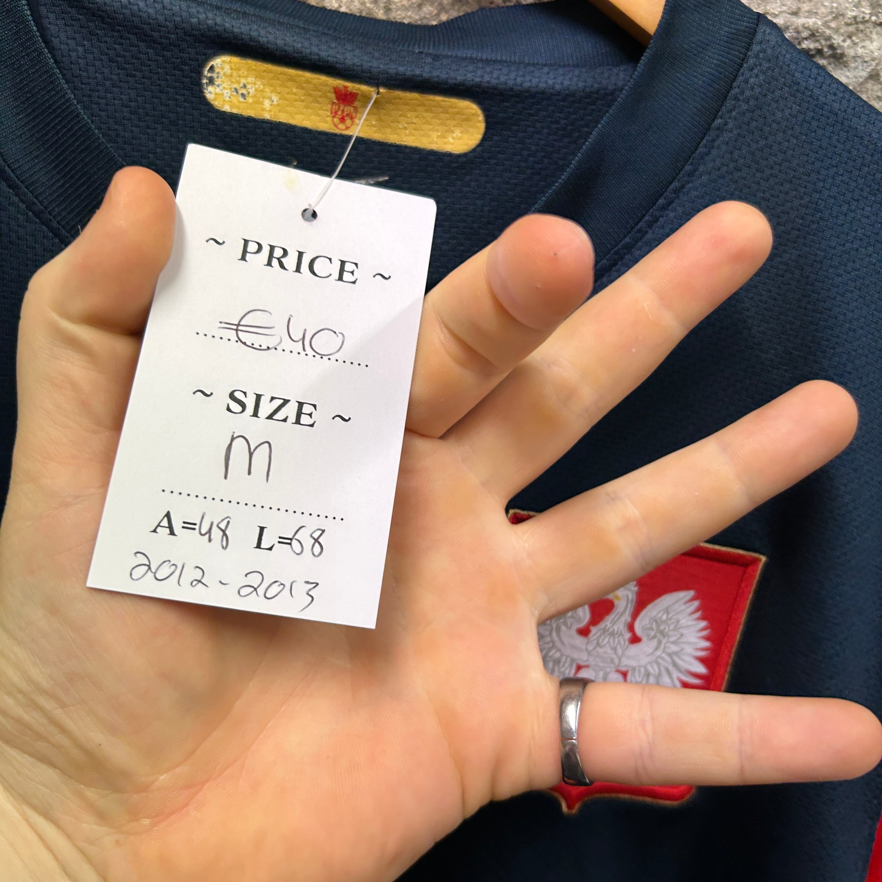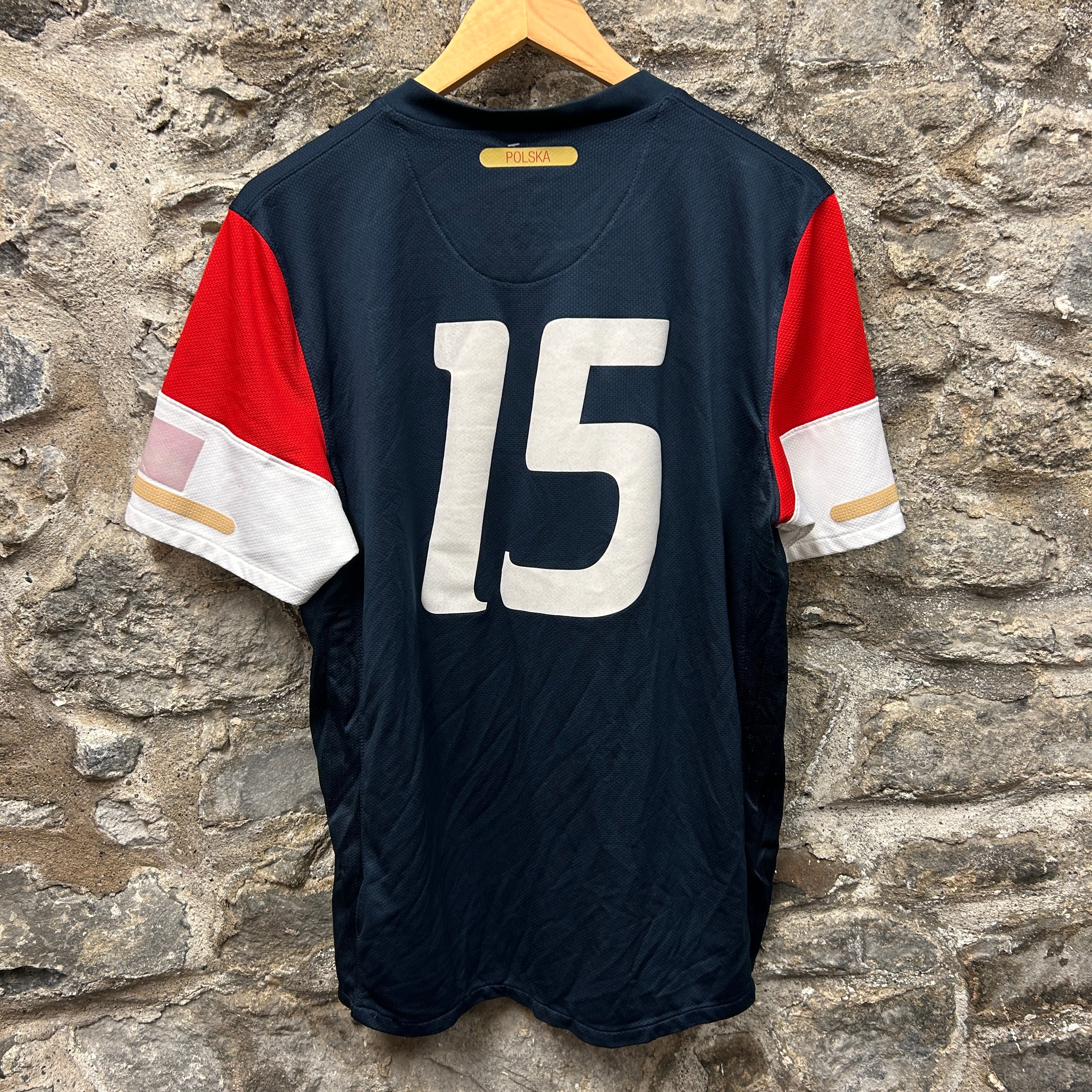 Product details: Nike Dri-FIT Poland (Polska) football shirt in dark navy with red/white color-block sleeves and gold accents. Features embroidered gold Nike swoosh, embroidered Poland eagle crest patch on chest, large flock/heat-pressed sponsor graphic 'Orange' across front, and large white back number '15'. 'AUTHENTIC' jock tag at hem and DRI-FIT embroidery near lower front; textured breathable mesh performance fabric. Brand: Nike.| Label Size | |