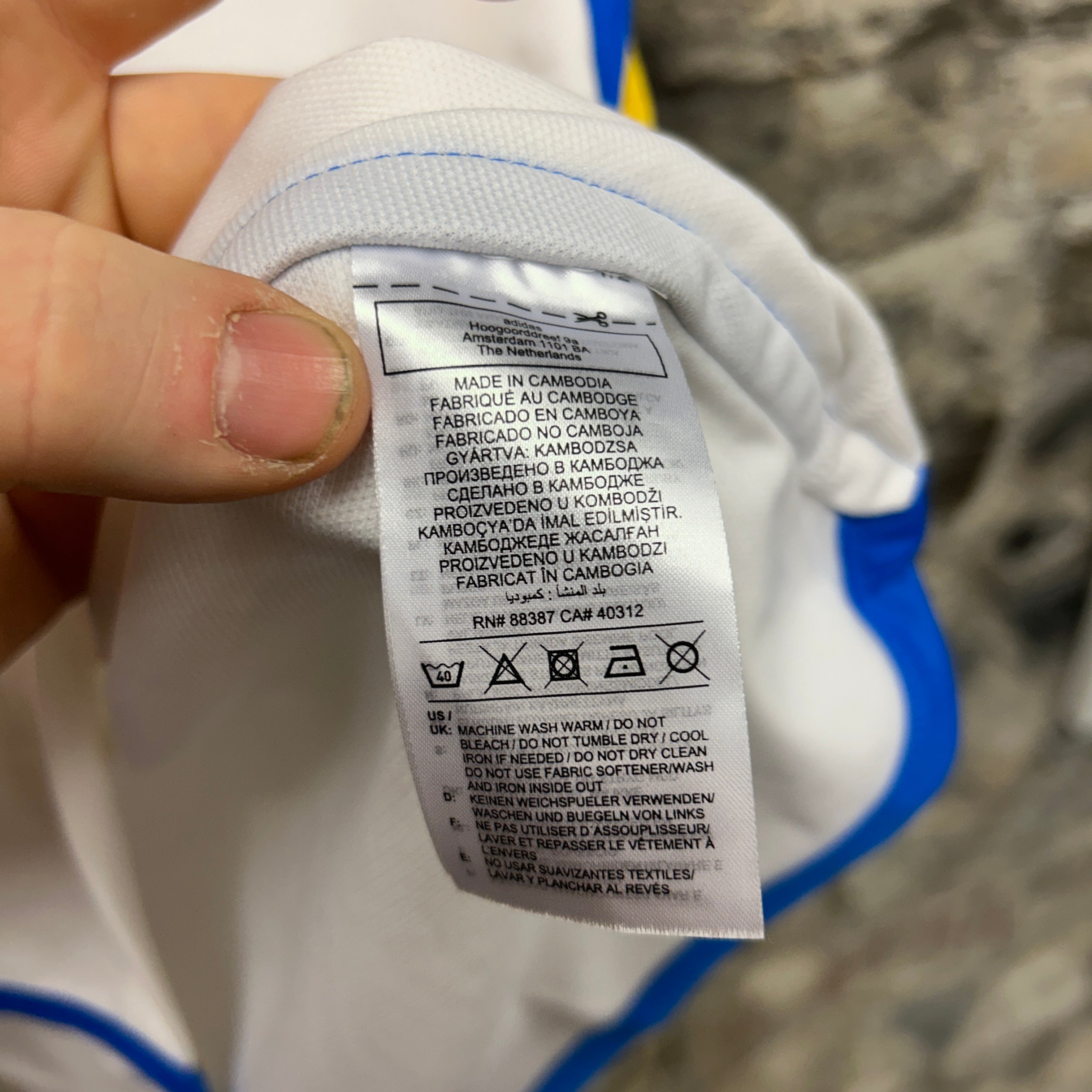 Product details: Adidas Sweden (Sverige) football shirt in white with blue/yellow trim. Features embroidered Adidas logo and Sweden crest on chest, ribbed V-neck and sleeve cuffs with striped detailing, blue shoulder stripes with a yellow accent stripe, and blue/yellow side panels. Breathable performance knit with AEROREADY branding at hem; 'SVERIGE' text on back neck. Brand: Adidas.| Label Size | |