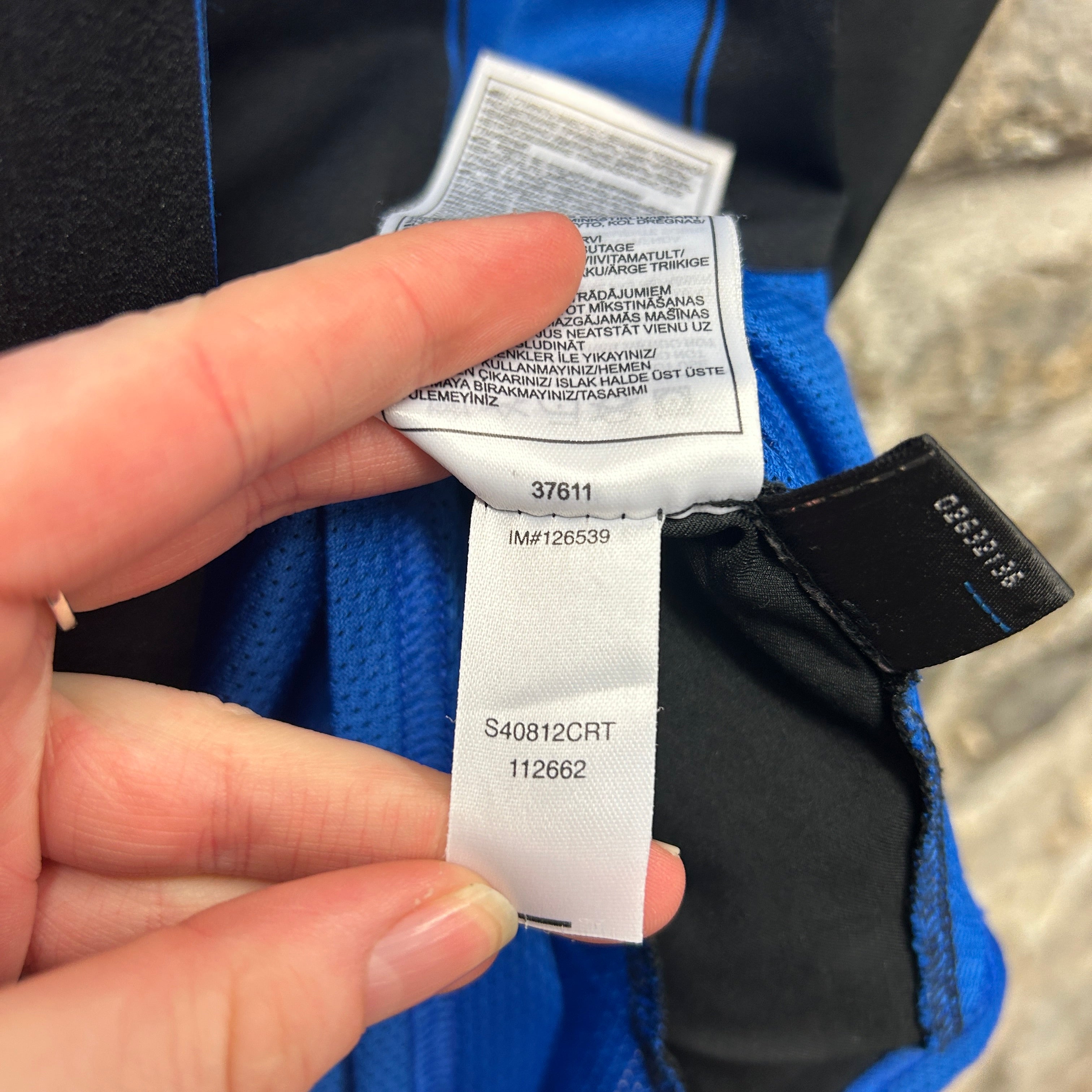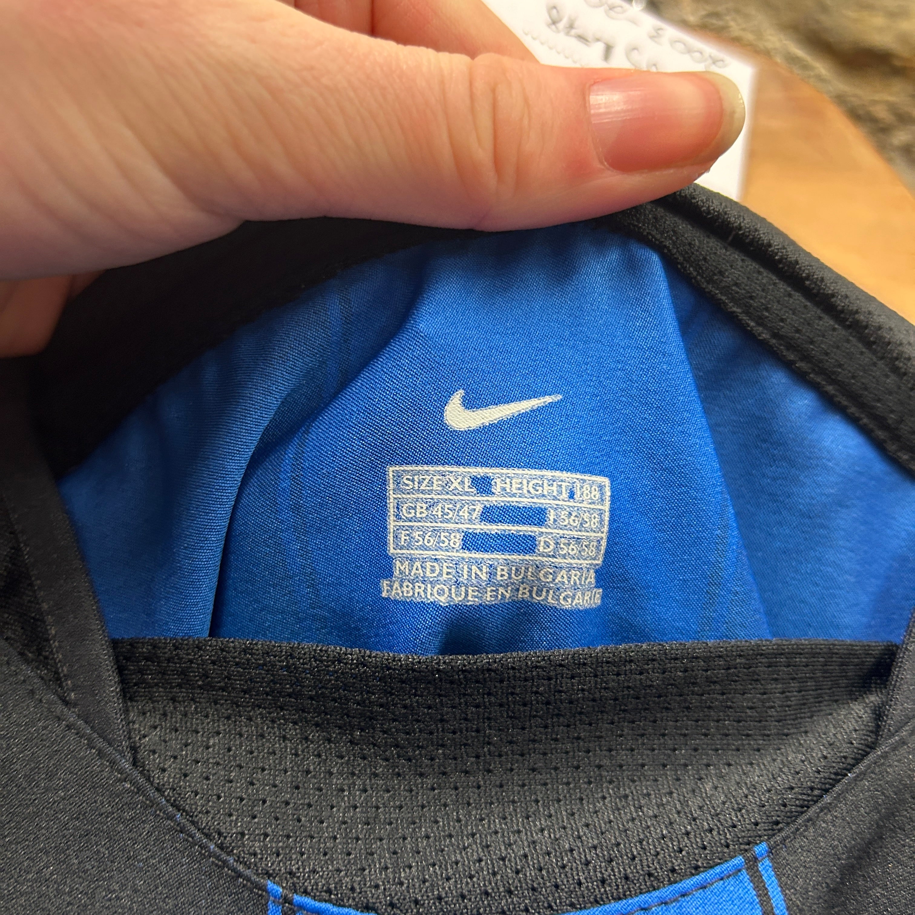 Product details: Nike Inter Milan home football shirt with classic blue/black vertical stripes, embroidered yellow Nike swoosh, embroidered Inter crest with gold star above, and large white Pirelli sponsor print across the chest. Athletic cut with black mesh vent paneling around the upper chest/shoulders and underarm area; lightweight performance knit. Tags show size XL and Made in Bulgaria; internal code label visible (37611 / S40812CRT). Brand: Nike.
