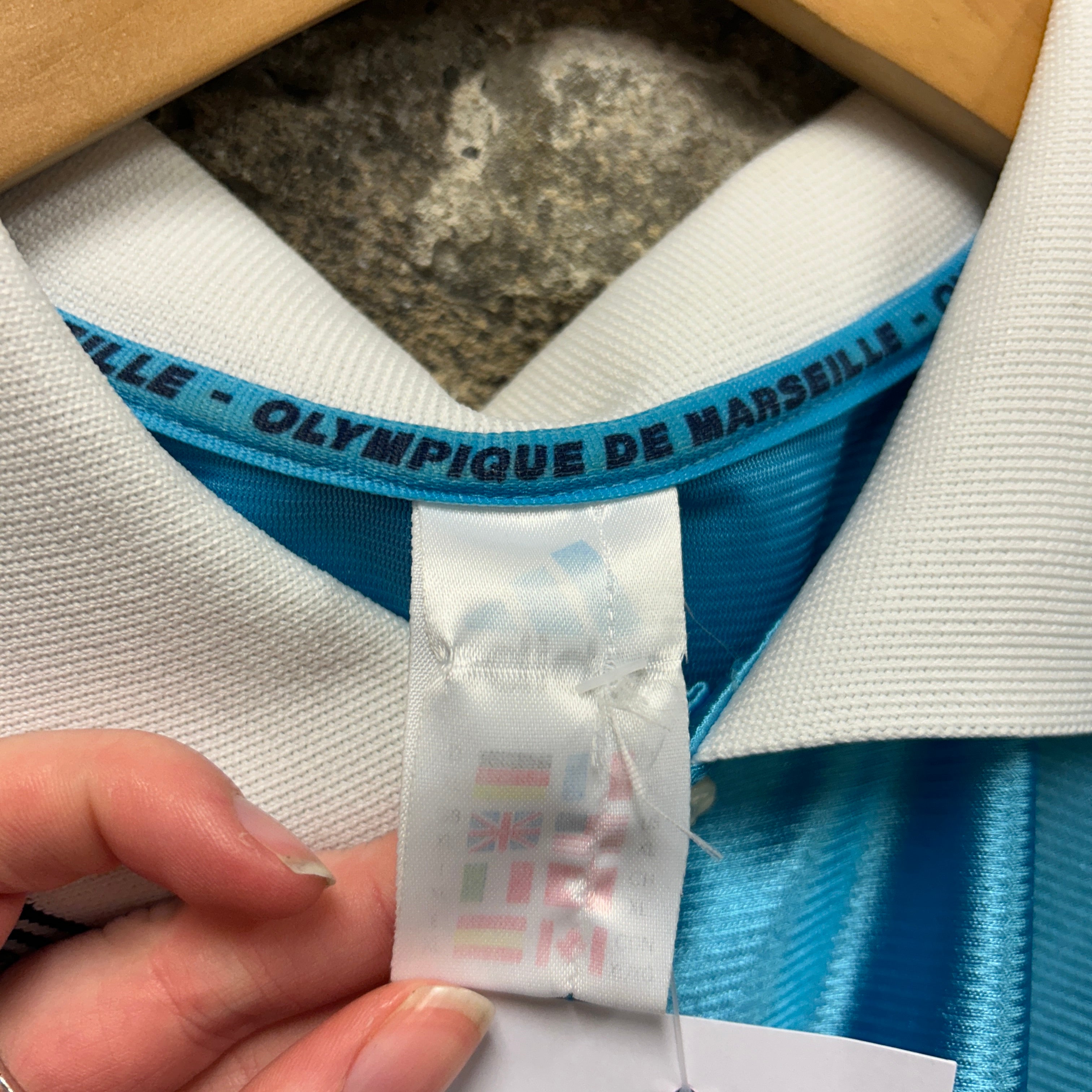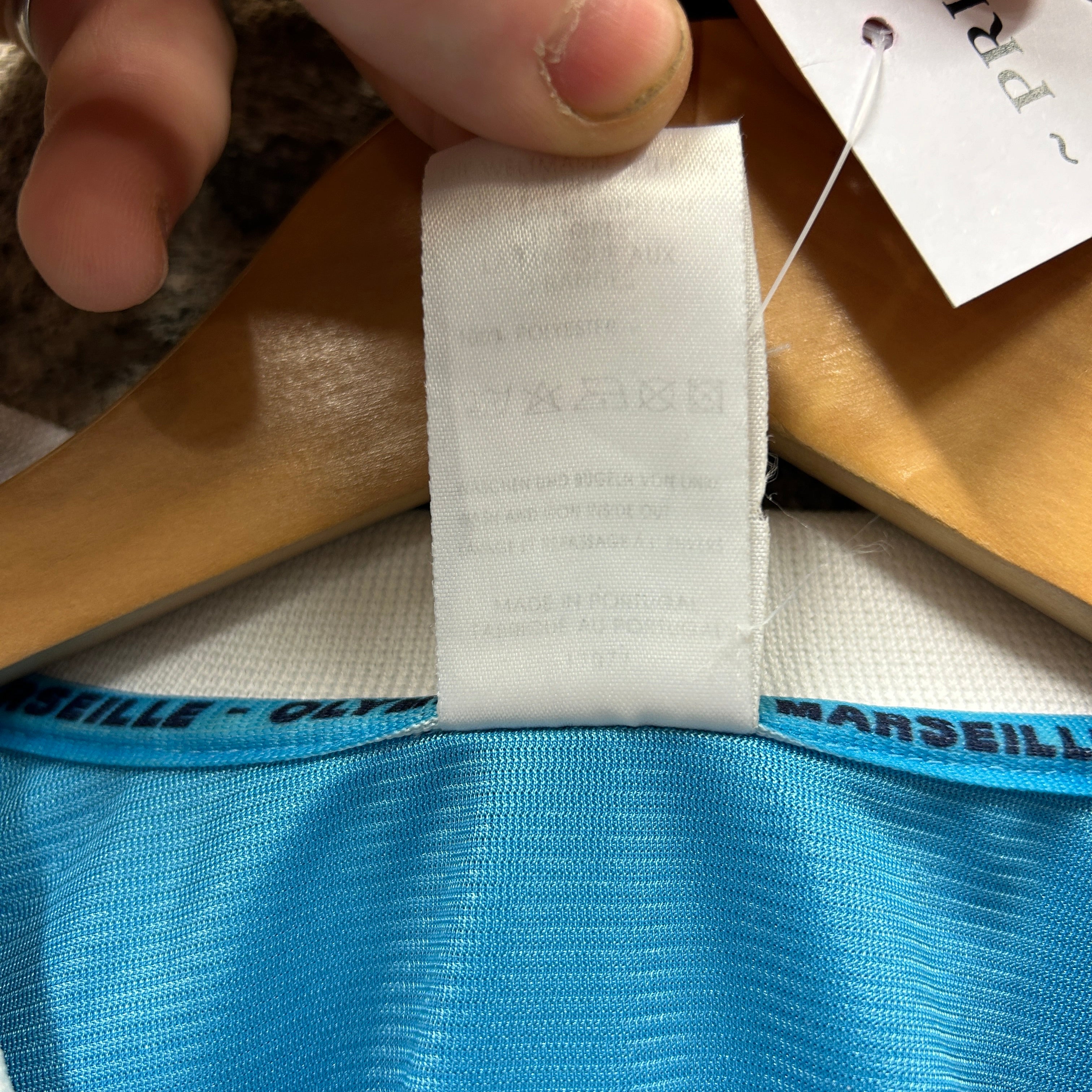 Product details: Olympique de Marseille centenary Adidas "Official Replica" football shirt in glossy sky-blue fabric. Features embroidered adidas logo and OM crest at chest, large felt/flocked "ERICSSON" sponsor across front, polo collar in white with navy tipping, classic Adidas 3-stripe shoulder taping, and bold white/blue band detailing on side panels/sleeves. Woven centenary badge reads "Centenary 1899-1999". Store swing tag visible (Irish Dogs Vintage Clothing) and handwritten tag notes size XL. Brand: Adidas.| Label Size | |