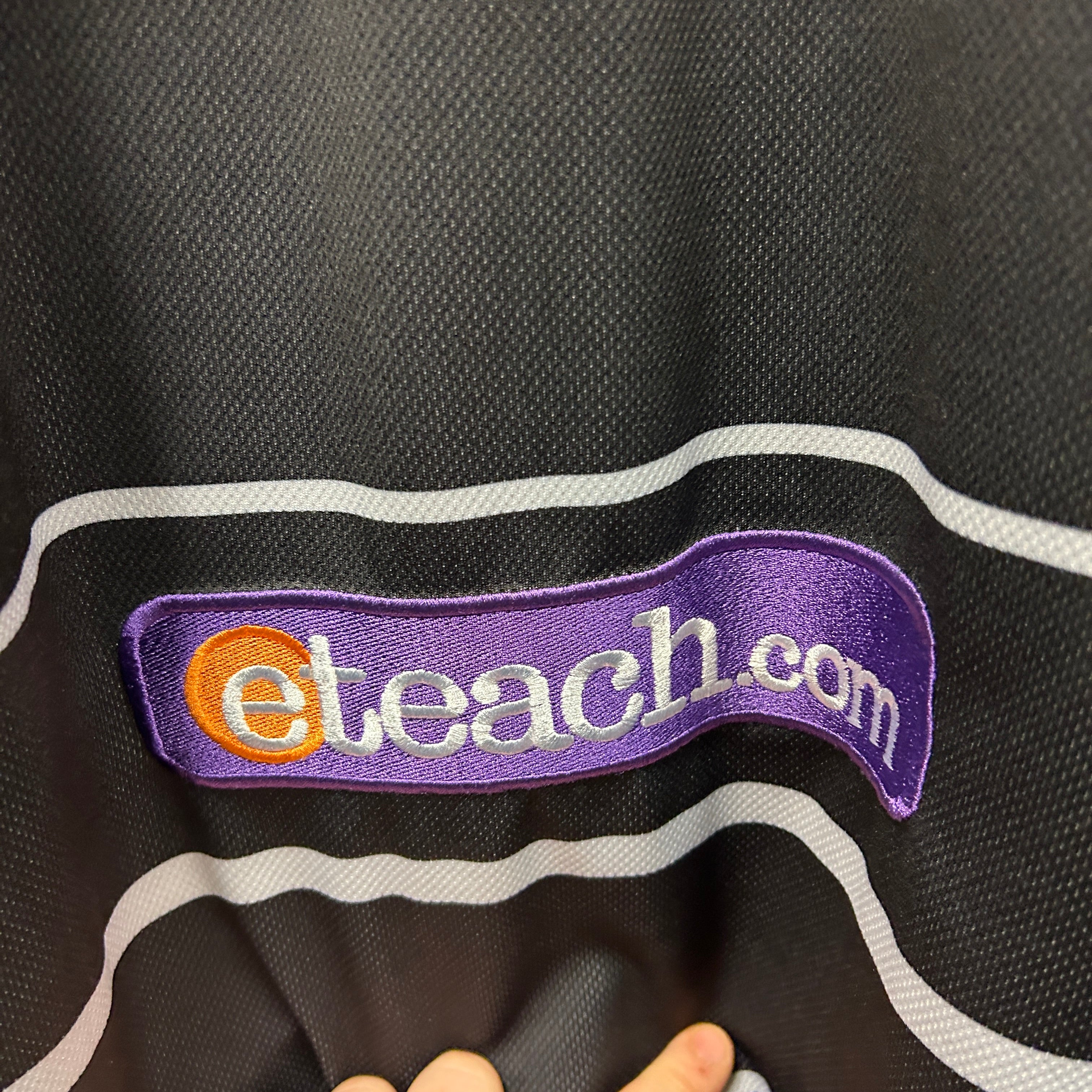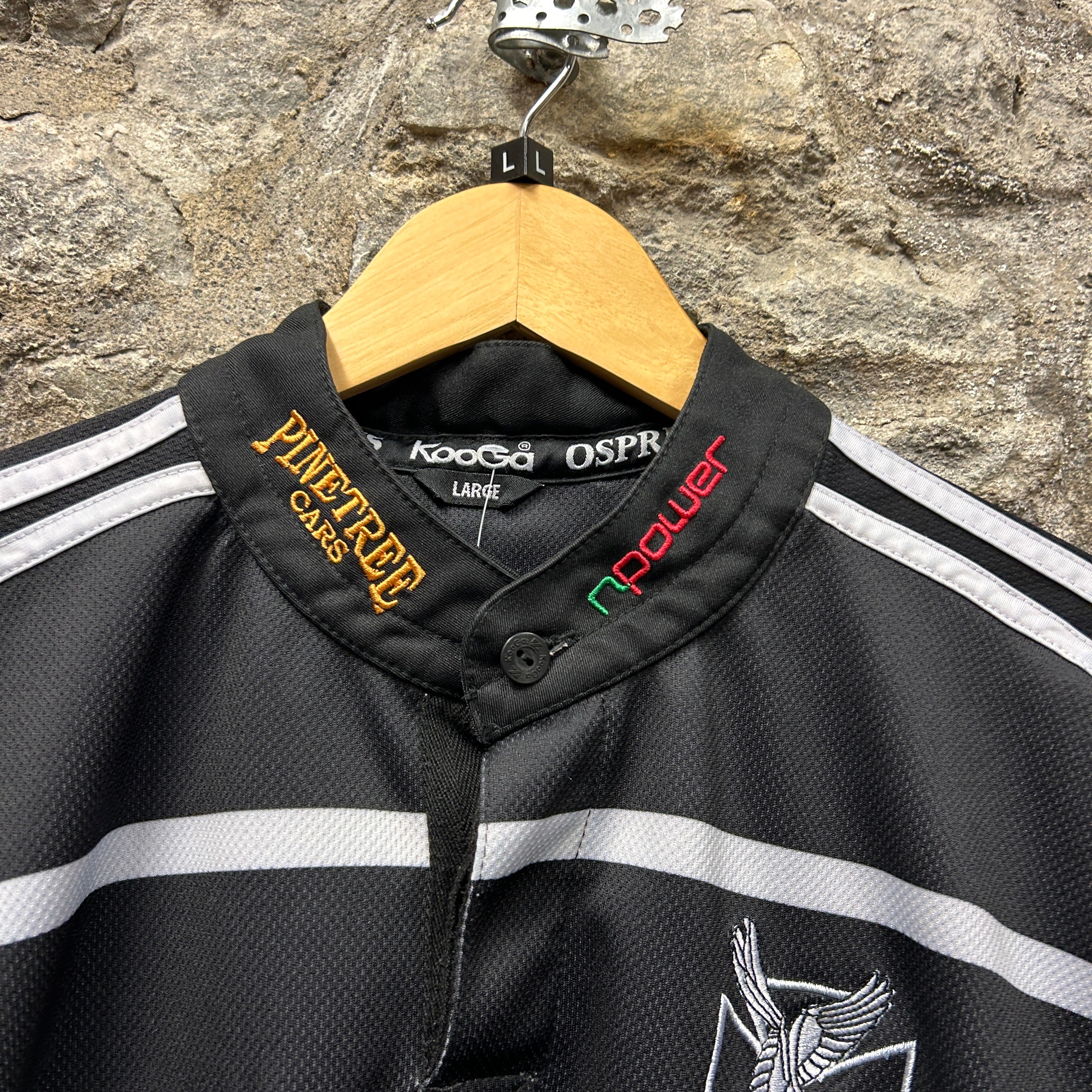 Product details: Ospreys rugby shirt by KooGa in black with light grey horizontal hoops and contrast grey mesh side panels. Heavy embroidery throughout: large front sponsor “npower renewables” (red/green), chest KooGa logo and Ospreys crest, embroidered collar sponsors “Pinetree Cars” (gold) and “npower”. Sleeve embroideries include “John West”, “ASDA”, and “The Trade Centre Wales” car graphic. Back features “cardiff-doors.com” embroidered on back neck, plus “Worthington’s” and “eteach.com” patches. Short-sleeve, button placket rugby collar; textured performance knit typical of mid-00s pro replicas. Brand: Kooga.| Label Size | |