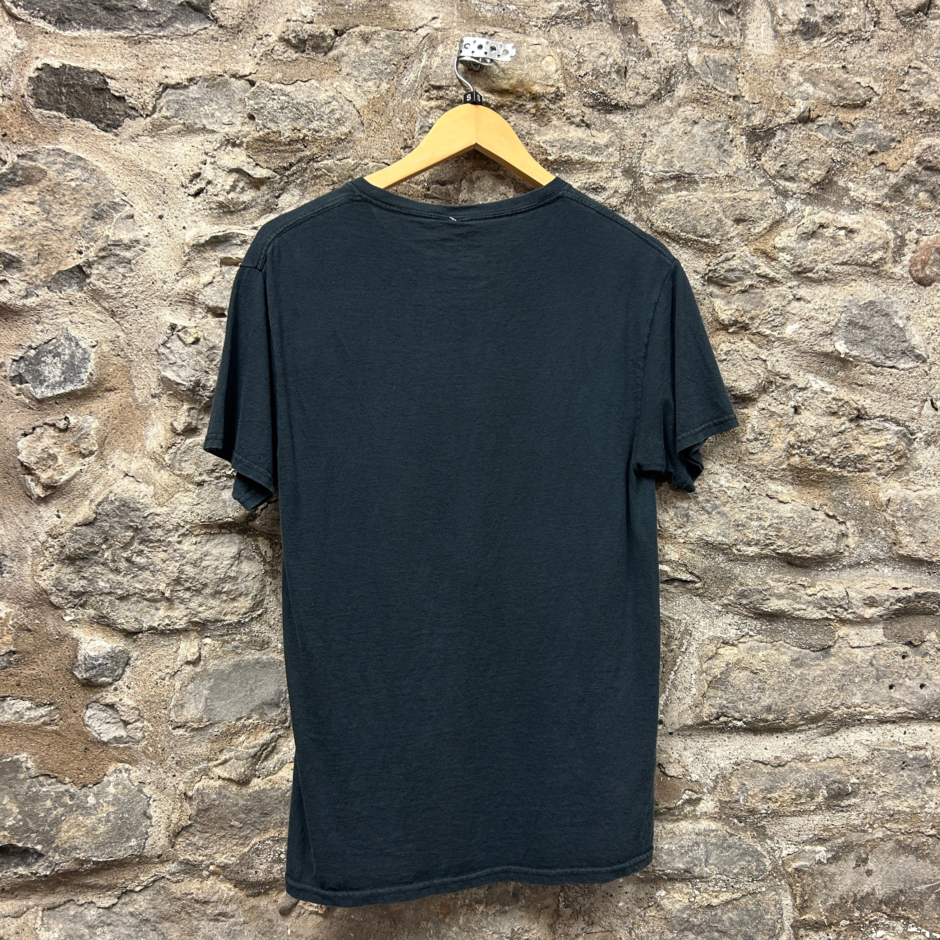 Product details: Black KISS band tee with large front graphic reading "KISS" and "WORLD TOUR '77"; distressed/vintage-style print featuring the band members. Crewneck, short sleeves, straight hem. Visible light wear/marks on one sleeve in close-up photos. Inner neck print tag shows size S, made in Mexico. Brand: Kiss.