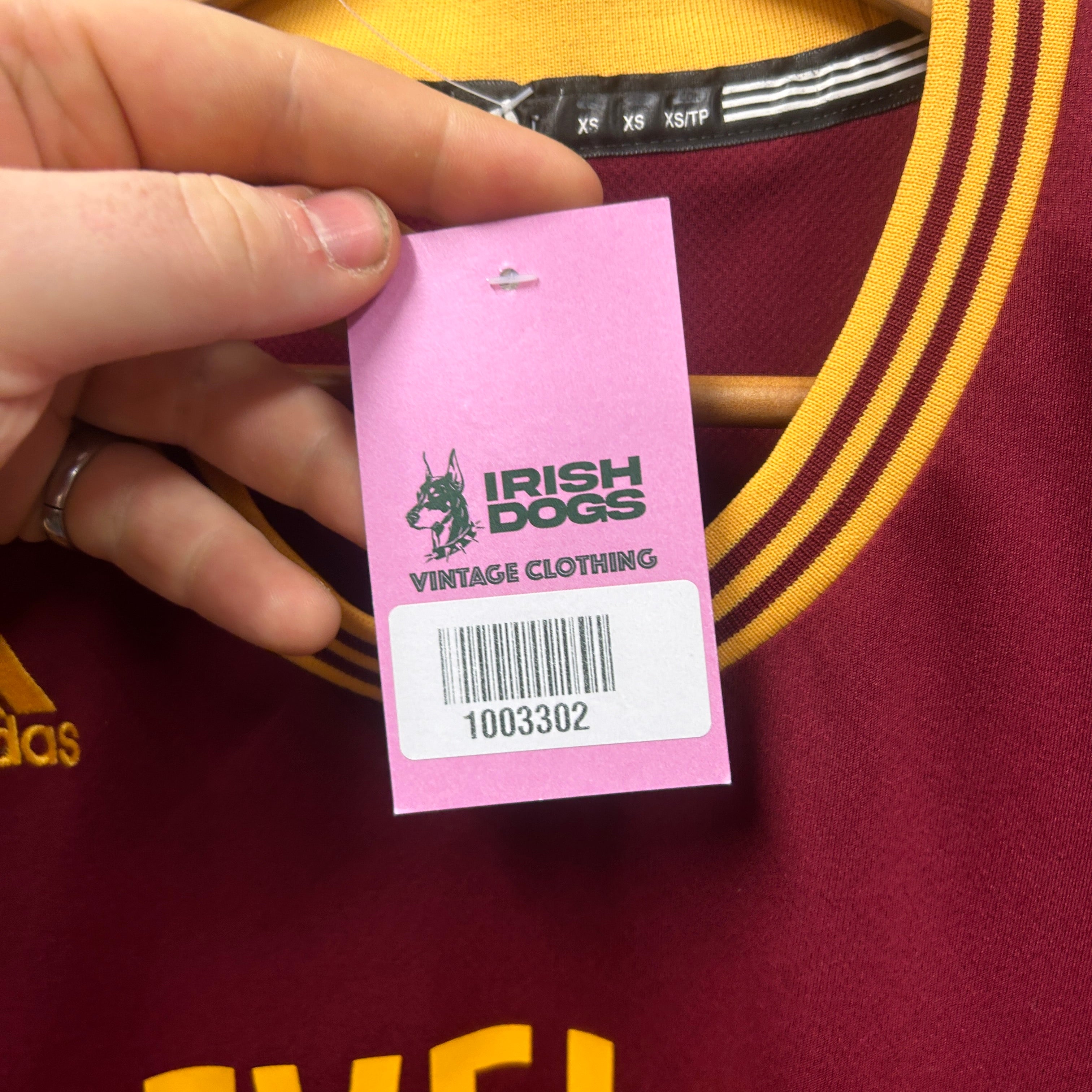 Product details: Adidas NBA Cleveland Cavaliers basketball jersey in wine/burgundy with gold/yellow arched "CLEVELAND" chest lettering and #2. Back reads "IRVING" with matching #2. Rib-knit collar and armholes with triple-stripe trim in gold and burgundy; embroidered Adidas logo on chest and NBA/adidas jocktag at hem. Tag shows size XS; made in Vietnam. Interesting objects: retail hang tag from Irish Dogs Vintage Clothing and handwritten size/measurements card. Brand: Adidas.| Label Size | |