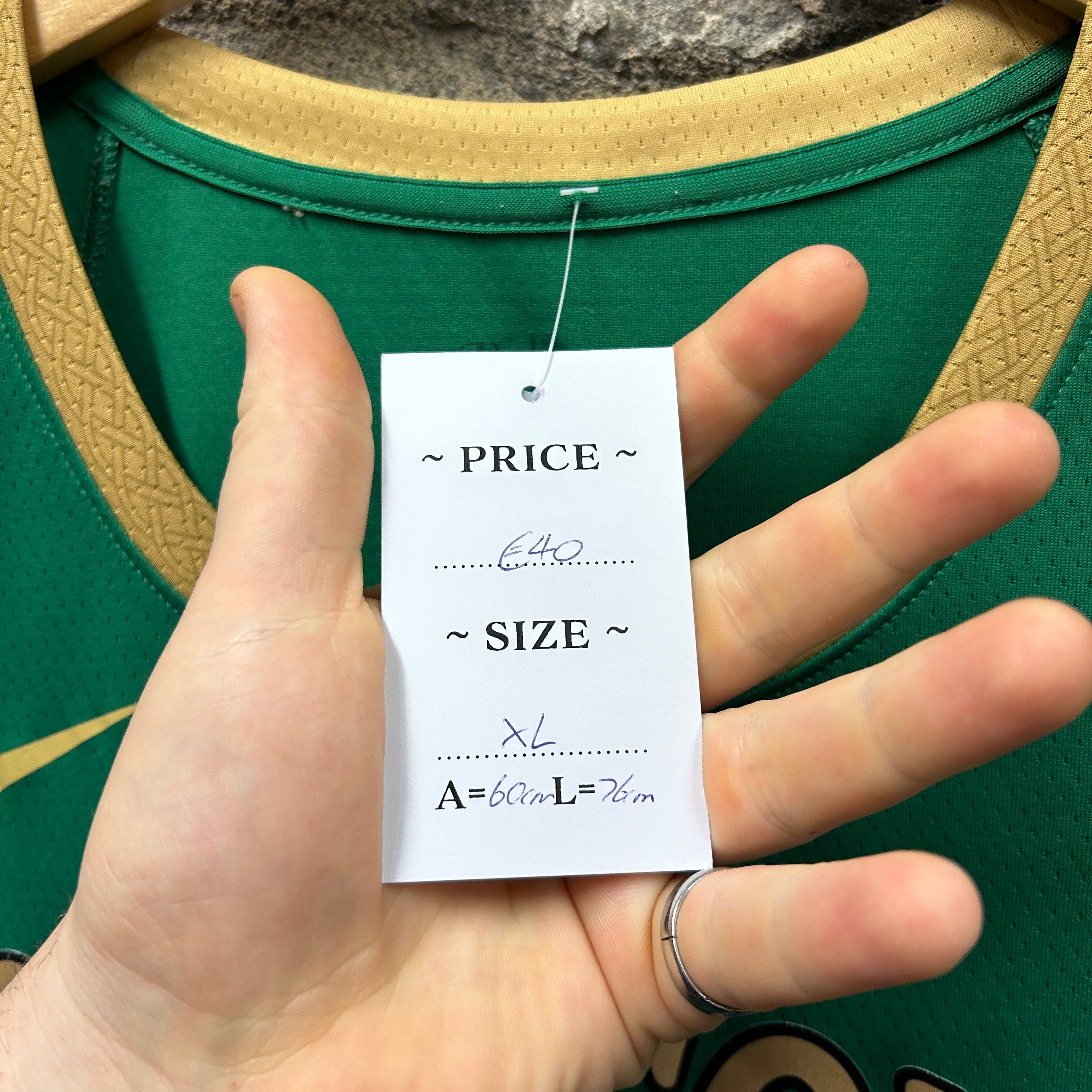 Product details: Nike NBA Boston Celtics #20 Gordon Hayward swingman jersey in green mesh with metallic gold tackle-twill style lettering/numbers. Features gold Celtic-knot patterned rib binding at neck/armholes, Nike Swoosh on chest, NBA logo at upper back, and NikeConnect/engineered jock tag at hem (size 52). Brand: Nike.| Label Size | |