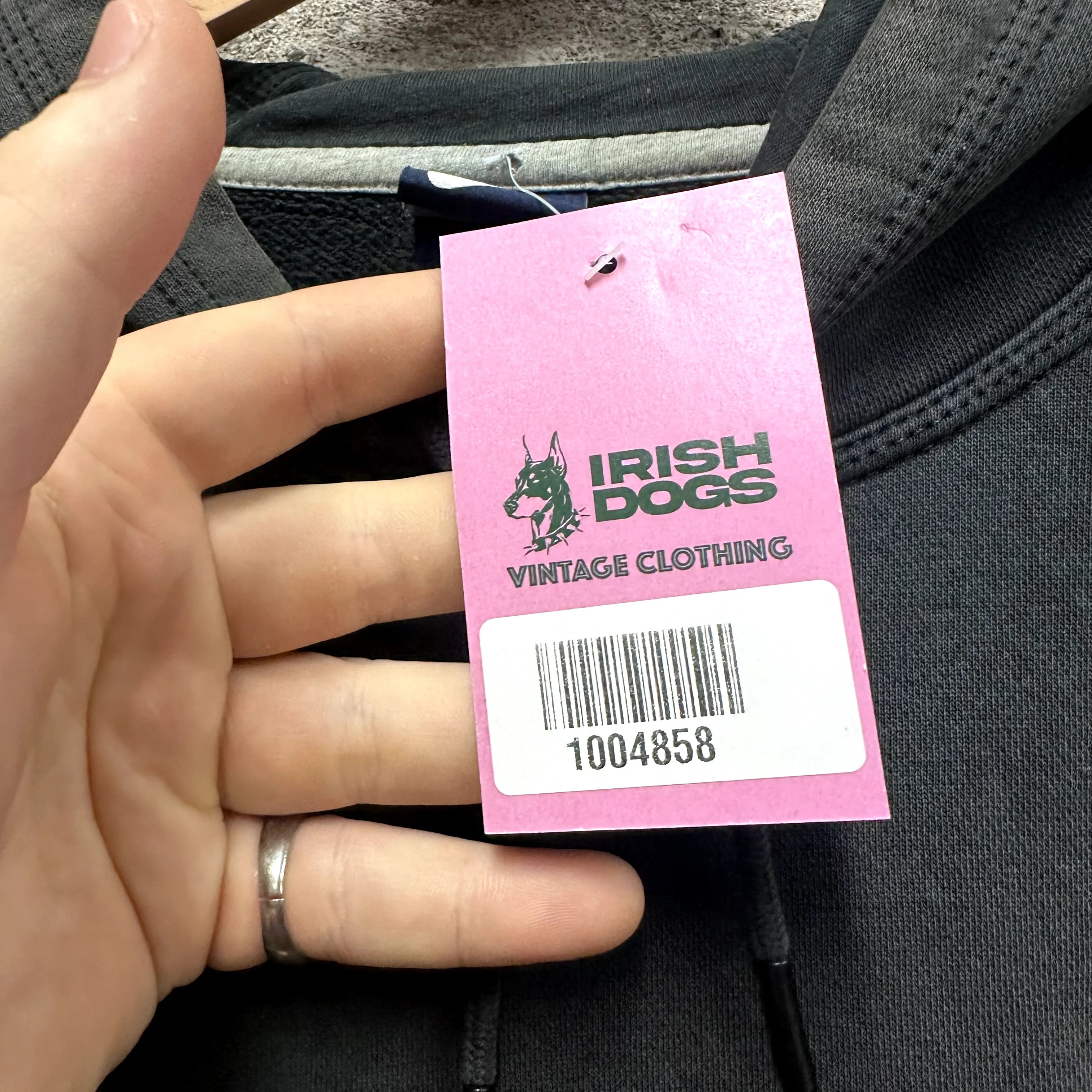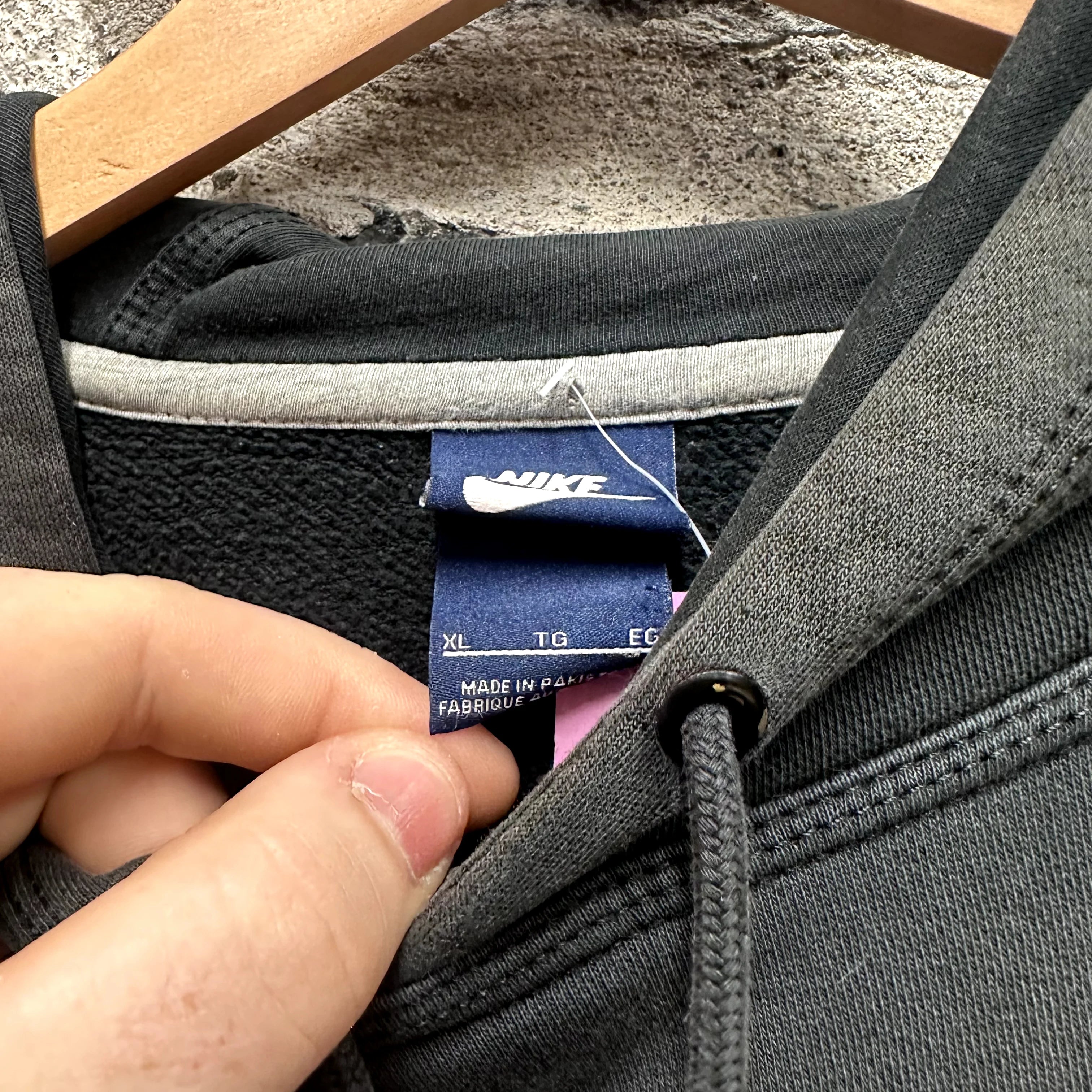 Product details: Black and yellow panel colorblock hoodie, classic Nike white embroidered swoosh, kangaroo pocket, drawstring hood, heavy-weight construction; label indicates XL sizing. Brand: Nike.| Label Size | |