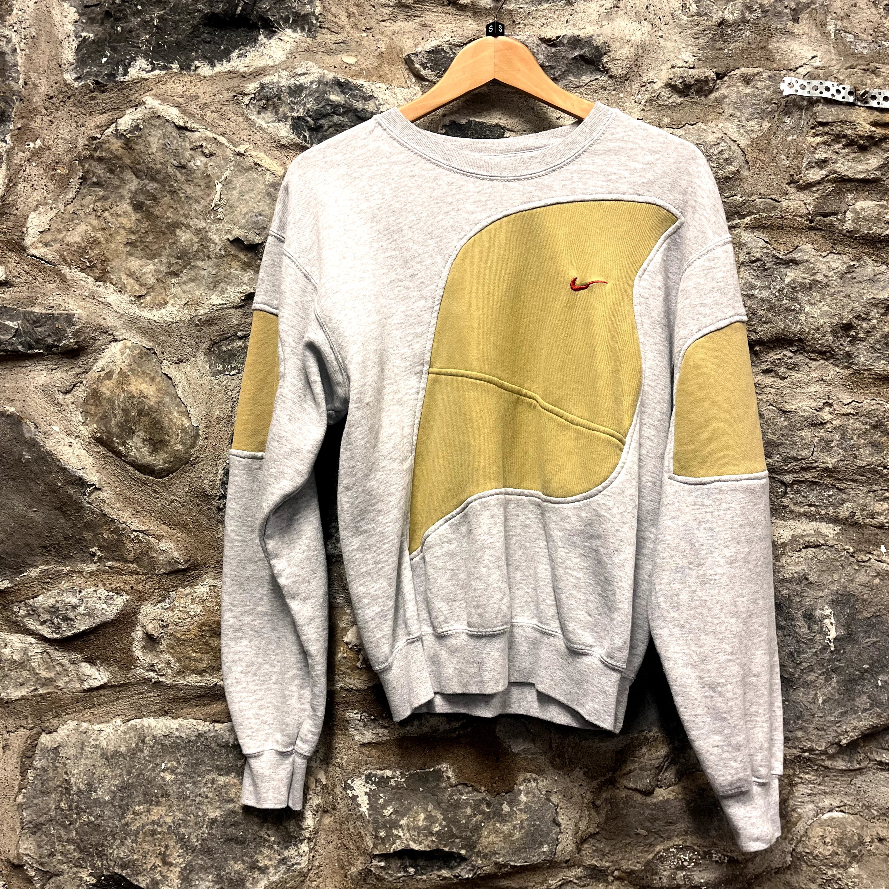 Product details: Ash gray base with yellow-mustard color-blocked panels, red embroidered Nike Swoosh, ribbed cuffs and hem, drop shoulder seams, classic crewneck cut, contrast panel construction. Sourced by Irish Dogs Vintage Clothing. Brand: Nike.| Label Size | |