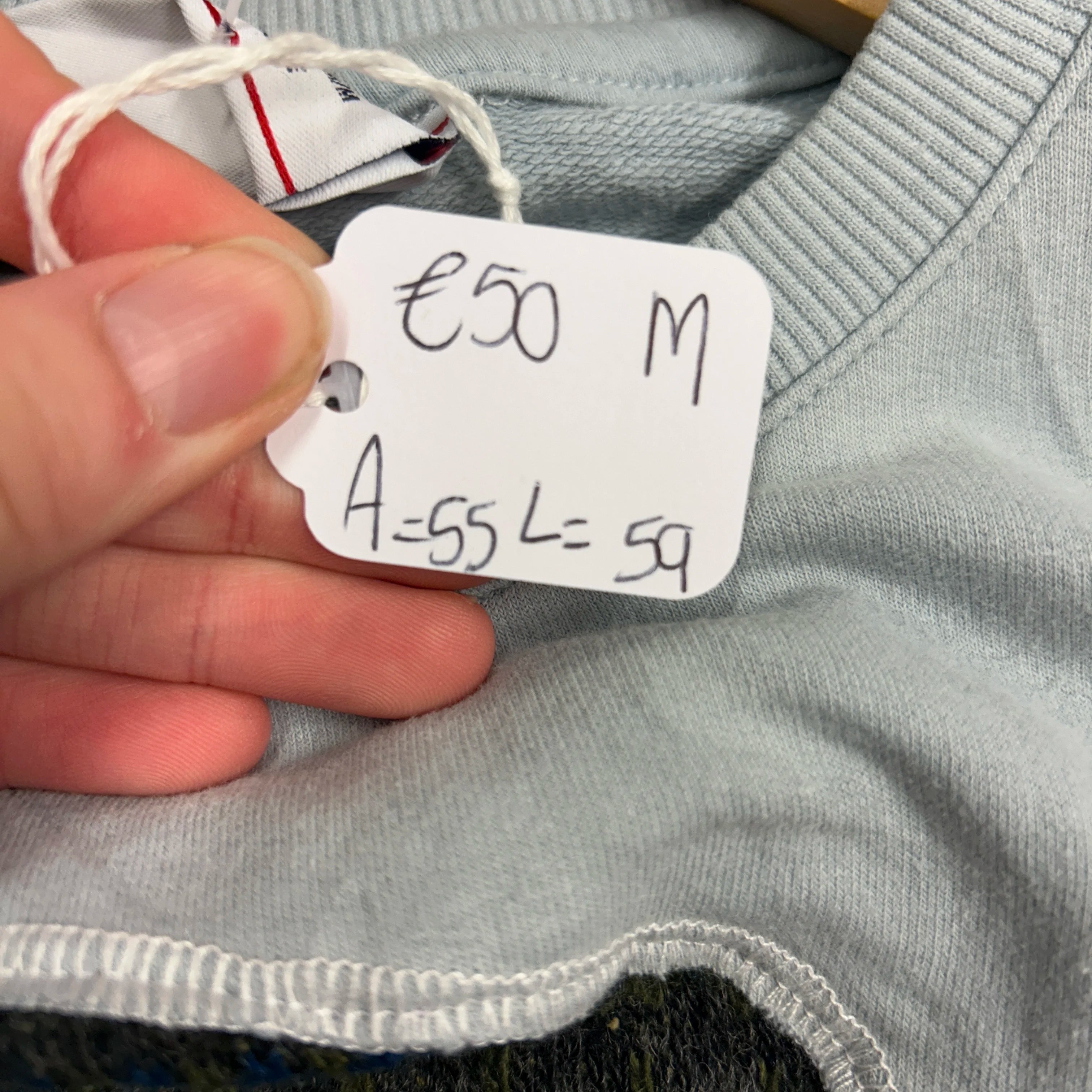 Product details: Light gray crewneck with one sleeve and partial front/back panel in multi-color geometric knit; small FILA logo on chest; wavy transitional seam; ribbed trims. Brand: Fila.| Label Size | |