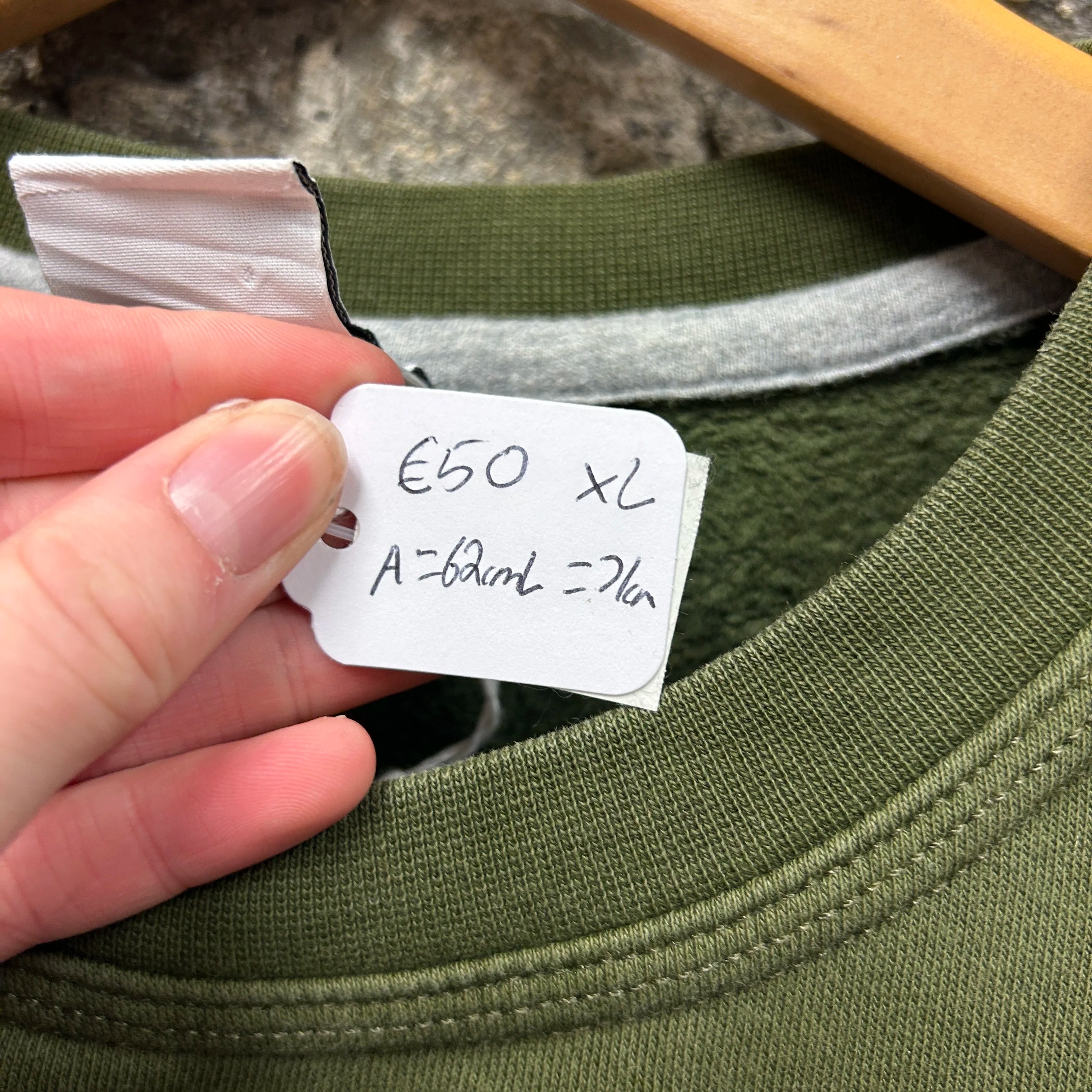 Product details: Olive green crewneck sweatshirt with off-center Fair Isle patterned chunky knit panel and sleeve. White Nike Swoosh chest embroidery. Unique reworked upcycled style. XL size. Brand: Nike.| Label Size | |