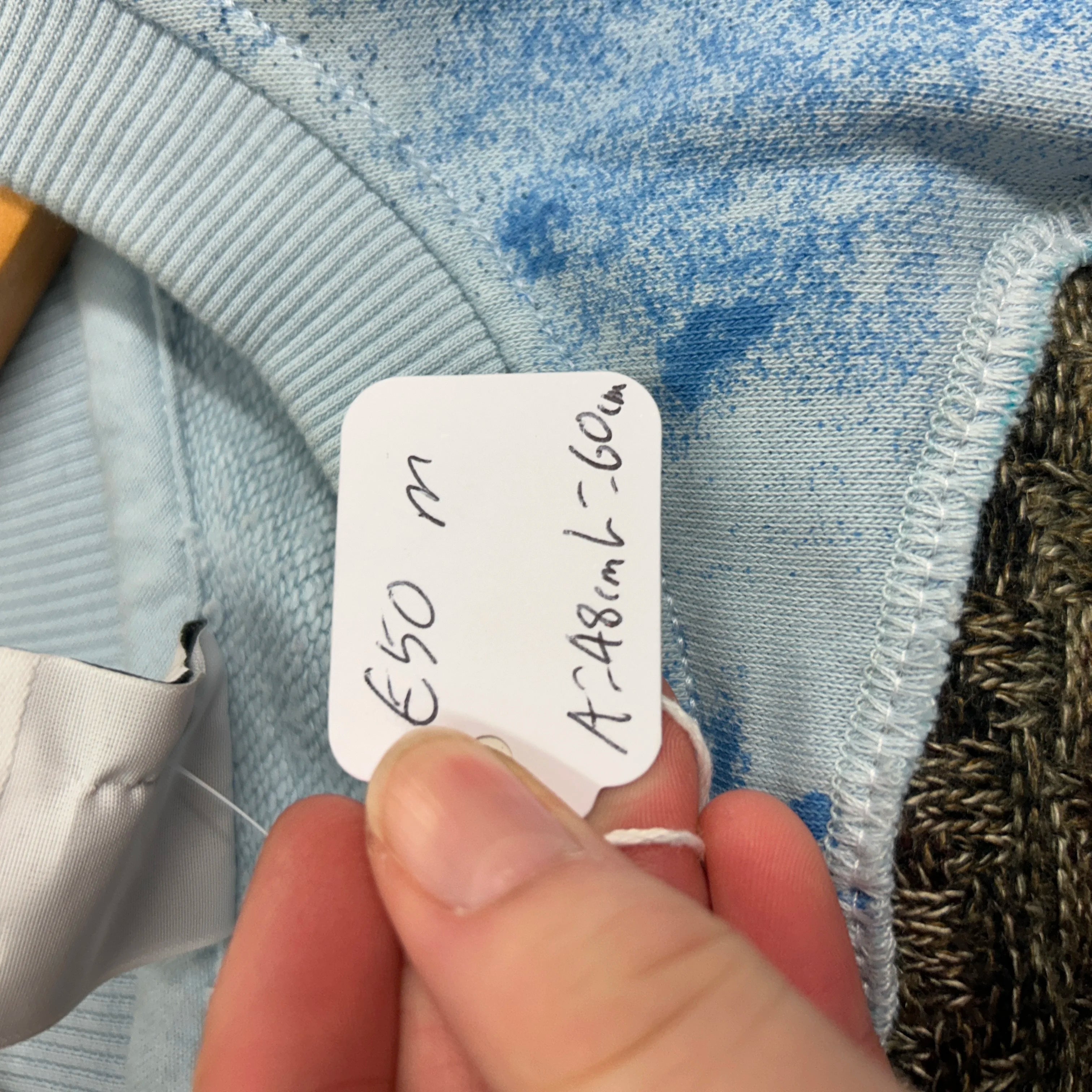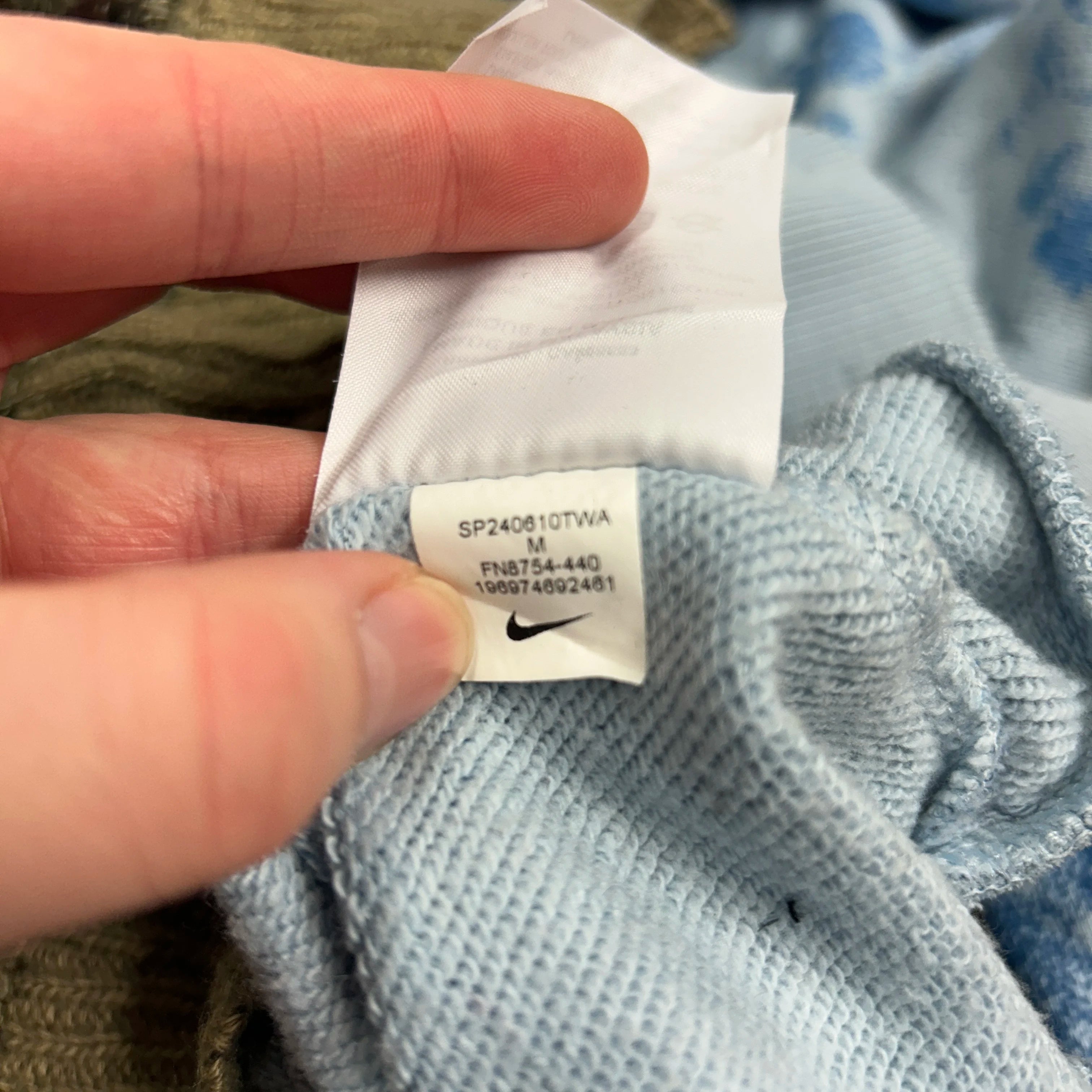 Product details: Dramatic blue/white washed fabric and brown textured knit patchwork, prominent wave-like seam detailing, embroidered Nike logo on chest, ribbed trims, mixed fabric construction. Brand: Nike.| Label Size | |