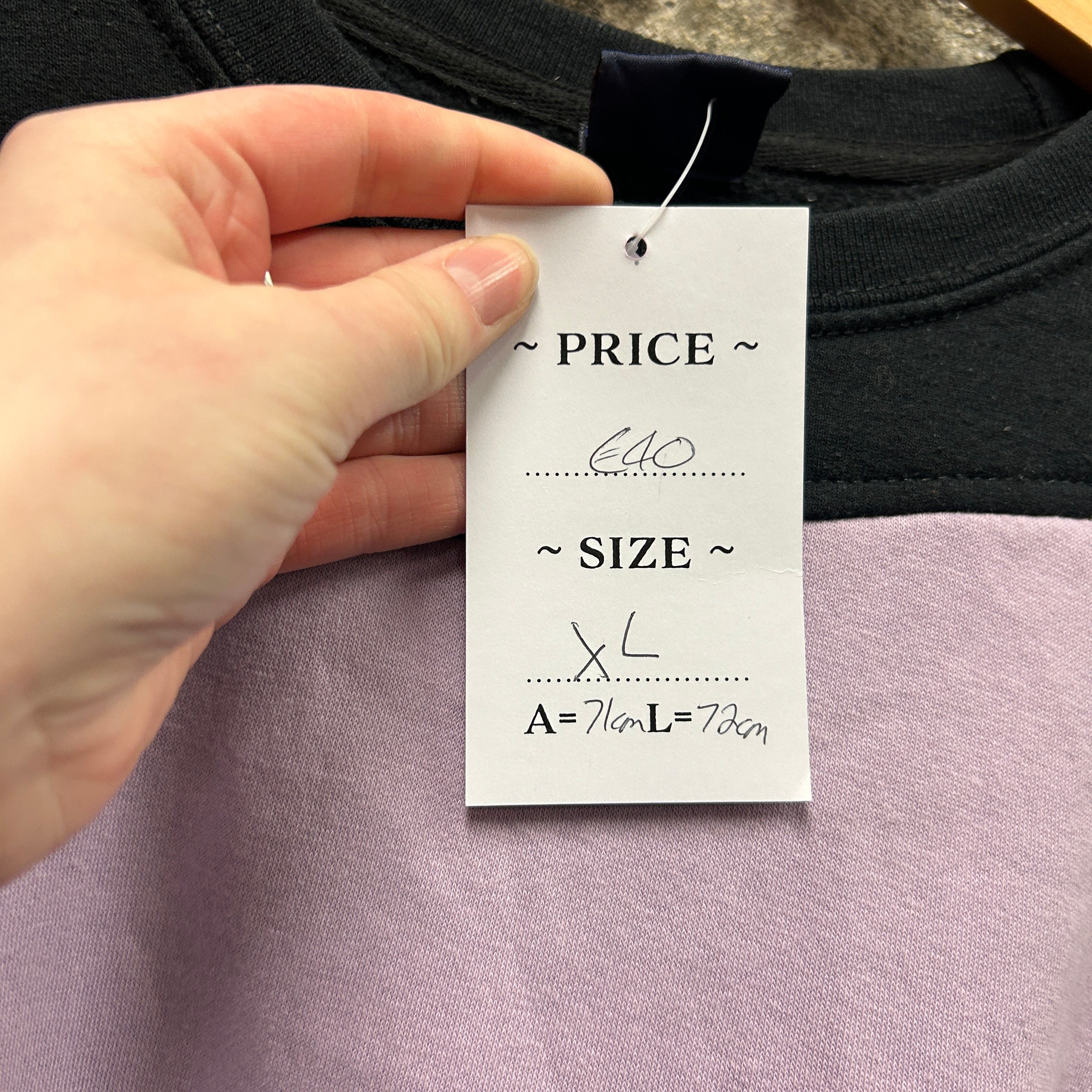 Product details: Tommy Hilfiger crewneck sweatshirt with lilac/pastel purple geometric colour-block panels and small embroidered flag logo on chest; ribbed collar/cuffs/hem and a relaxed, slightly dropped-shoulder fit. Brand: Tommy Hilfiger.| Label Size | |