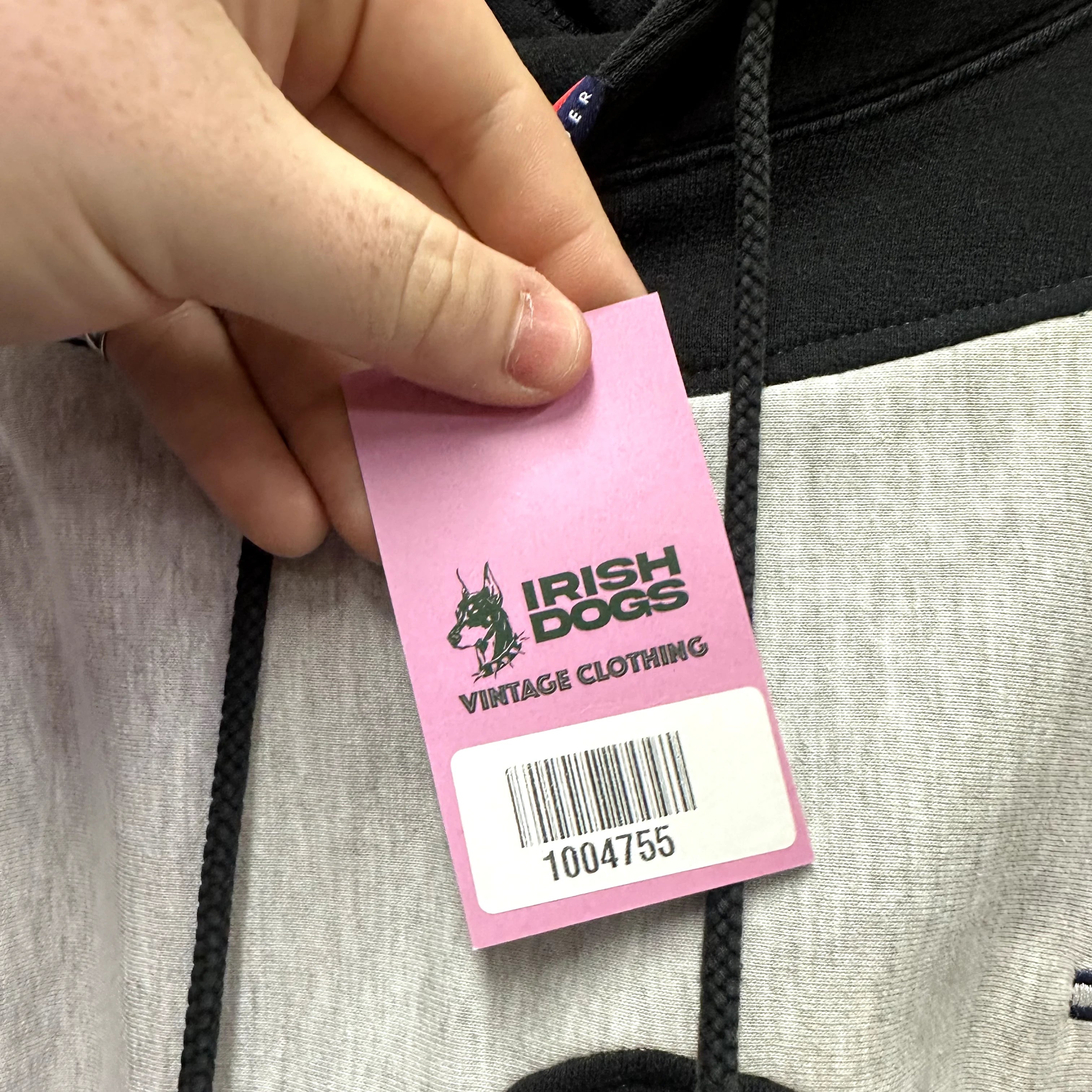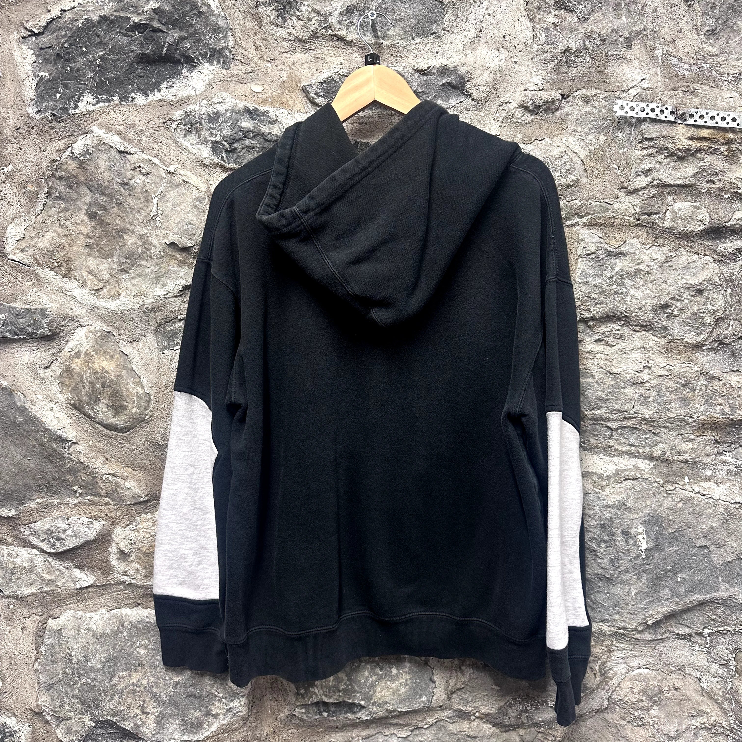 Product details: Black and grey hoodie with asymmetrical geometric paneling, embroidered Tommy Hilfiger flag logo, kangaroo pocket, drawstring hood, and a visible discoloration on right sleeve. Brand: Tommy Hilfiger.