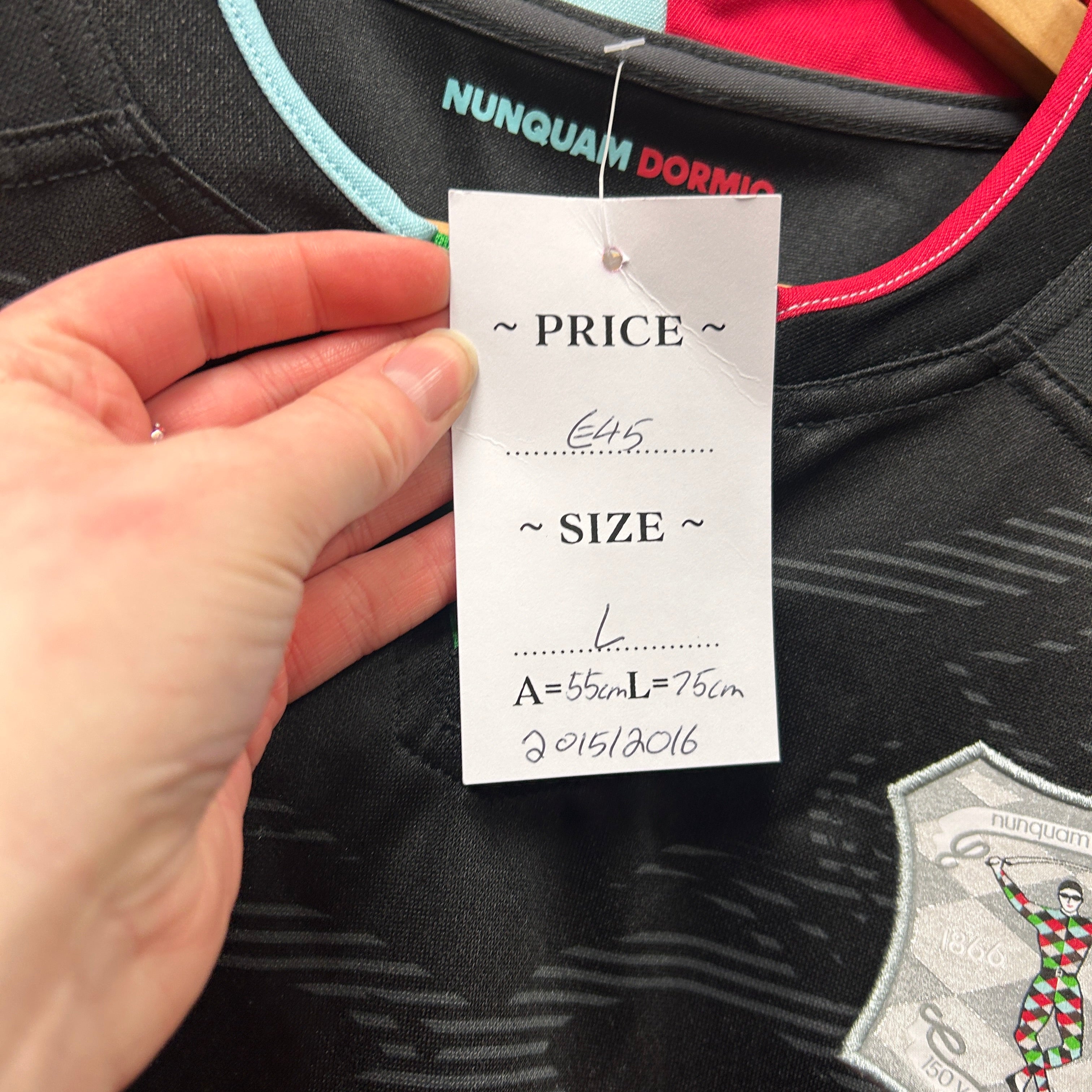 Product details: Adidas Harlequins rugby jersey in black with tonal grey graphic print across the front. Features 3-stripe shoulder detailing, split V-neck insert in bright green, and contrast collar binding in light blue and red. Green sleeve cuff accents, grey side panels, large red/white "IG" sponsor block on chest, and embroidered/printed Harlequins 150 years anniversary crest (1866–2016) with "Nunquam Dormio" motto. Athletic polyester performance fabric; made in China. Style/code tag shows 05/16, suggesting 2015/2016 season issue. Brand: Adidas.| Label Size | |