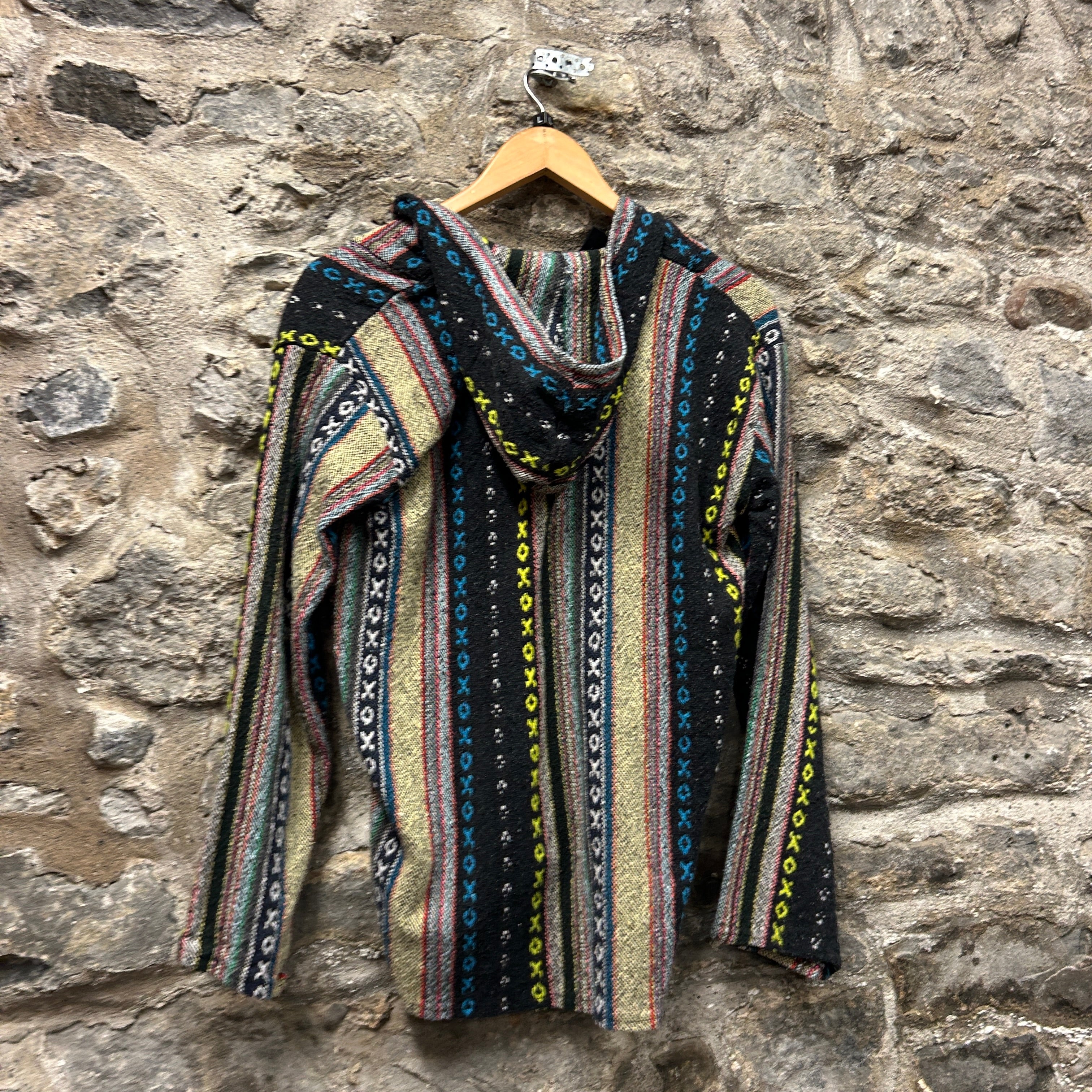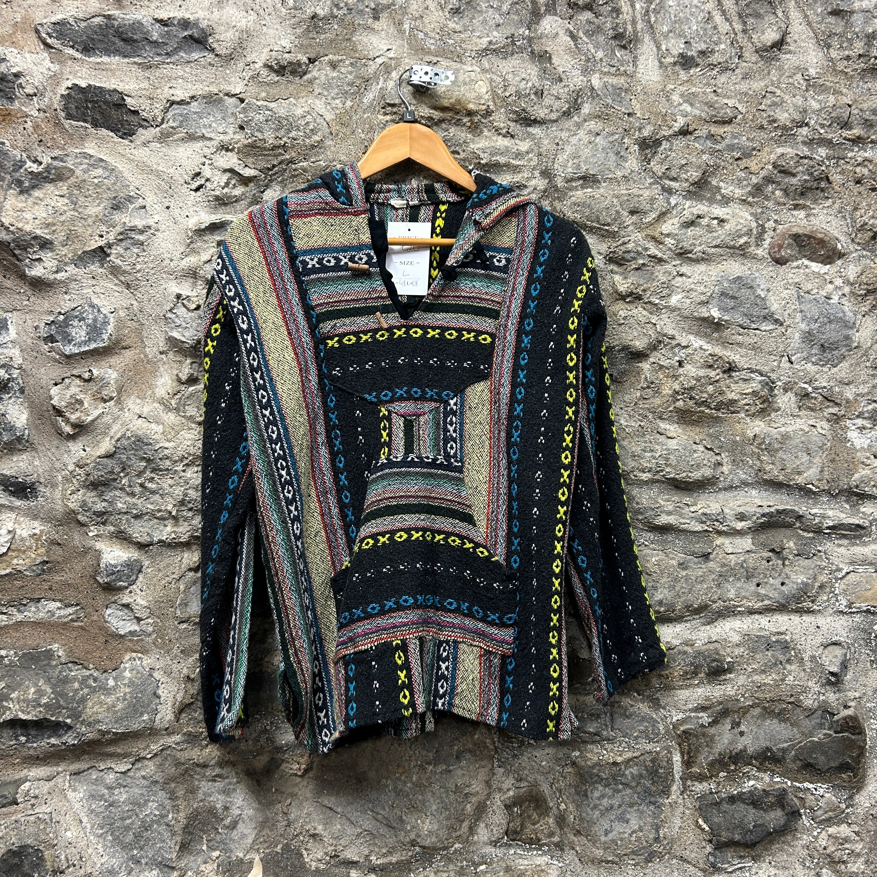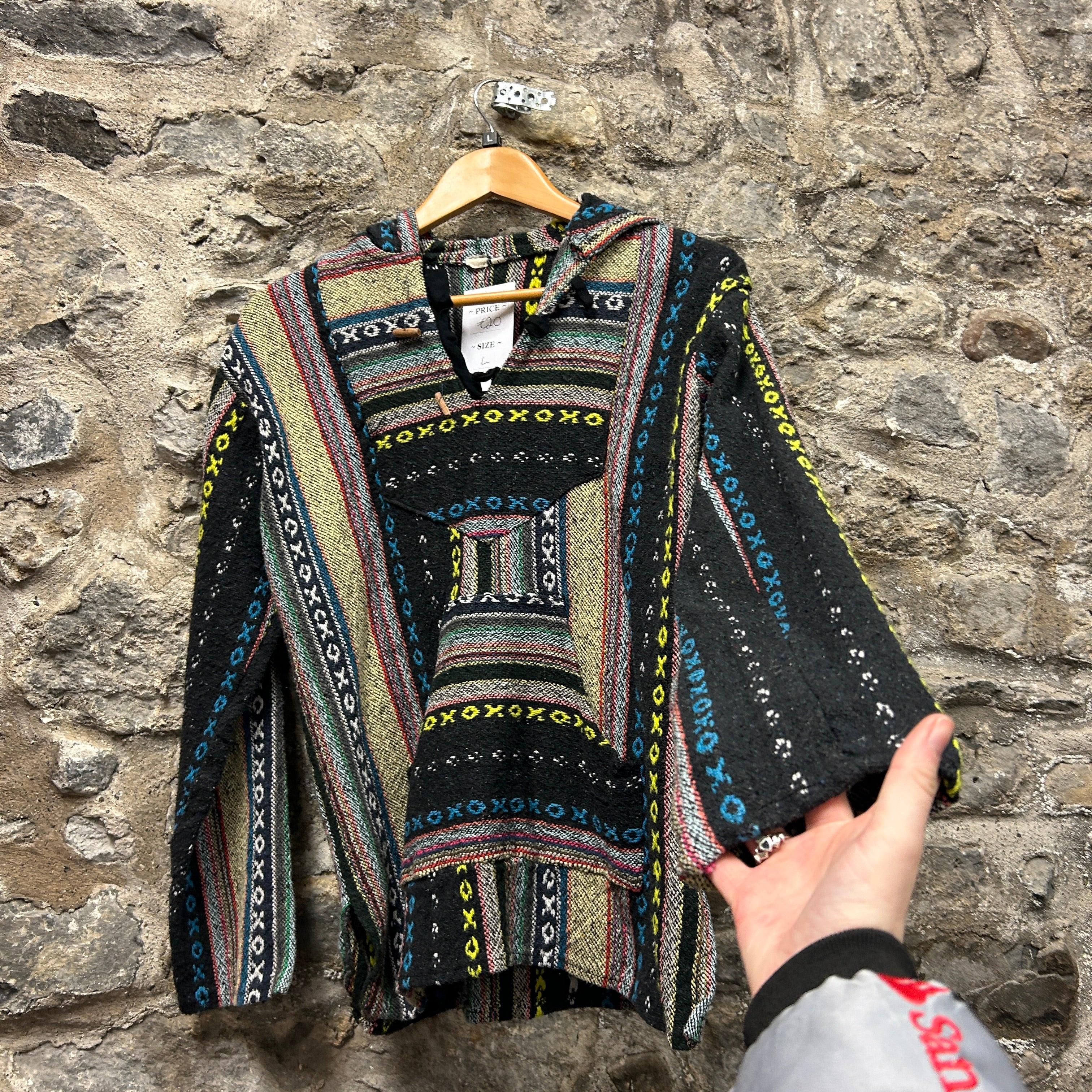 Product details: Woven Baja/jerga-style pullover hoodie in a black base with multicolor vertical stripe and geometric/XO motifs throughout. Features a V-notch neckline with drawstring hood, front kangaroo pocket, and relaxed, boxy fit. Textured, blanket-like weave typical of surf/skater Baja hoodies. Brand: Baja.| Label Size | |