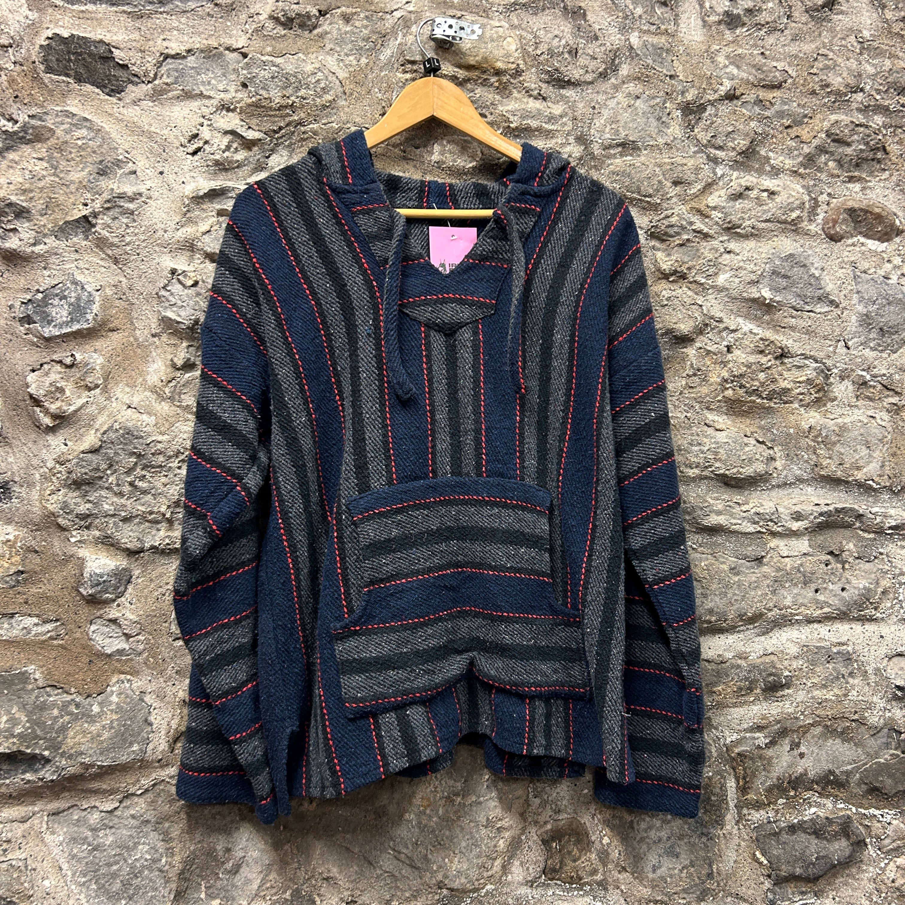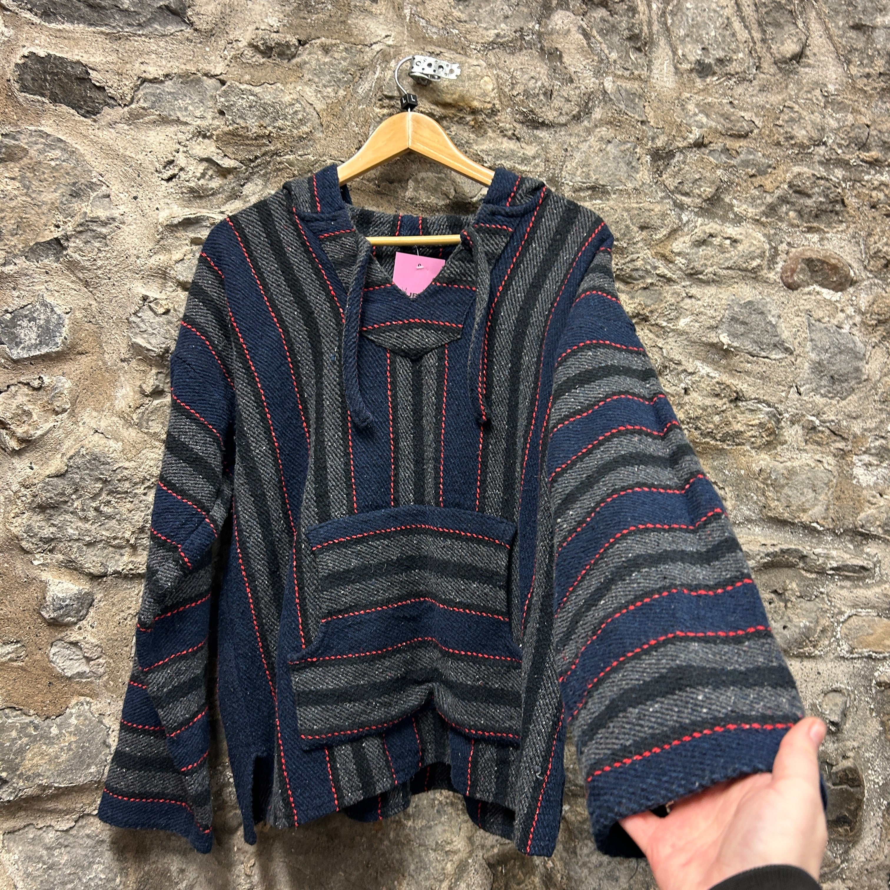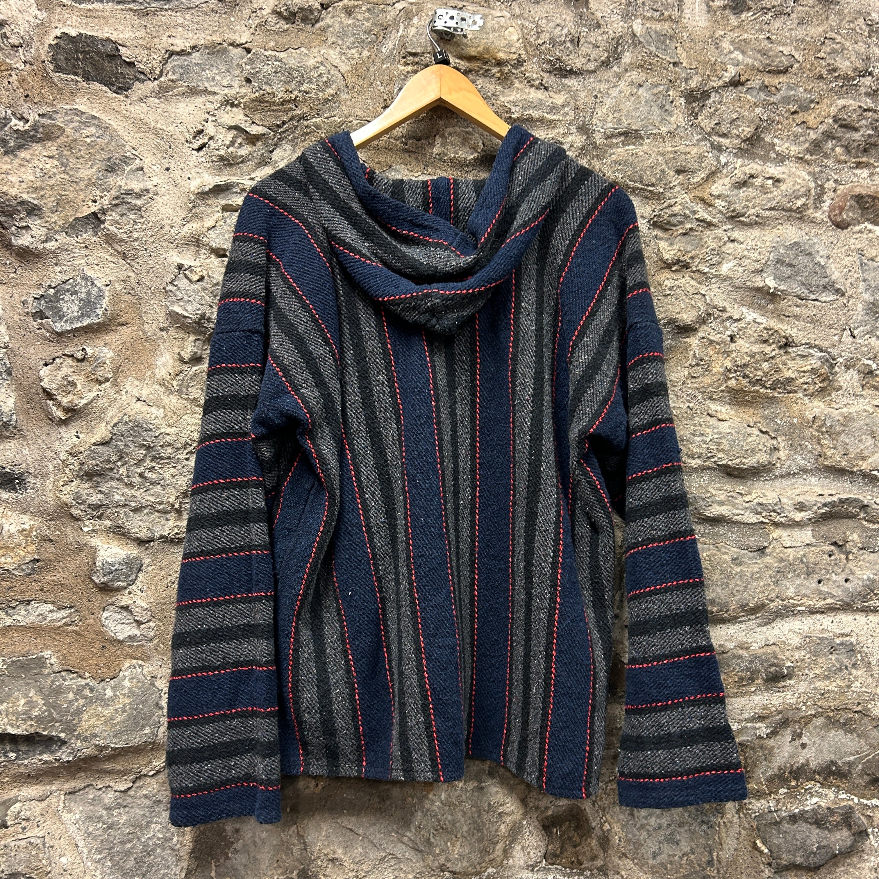 Product details: Woven baja/jerga-style hoodie in navy and charcoal grey with thin red stitched stripe pattern throughout. Features a hood with fabric drawstrings, V-notch neckline with faux placket detail, and a classic front kangaroo pocket; textured, blanket-like weave with a relaxed fit. Brand: Baja.| Label Size | |