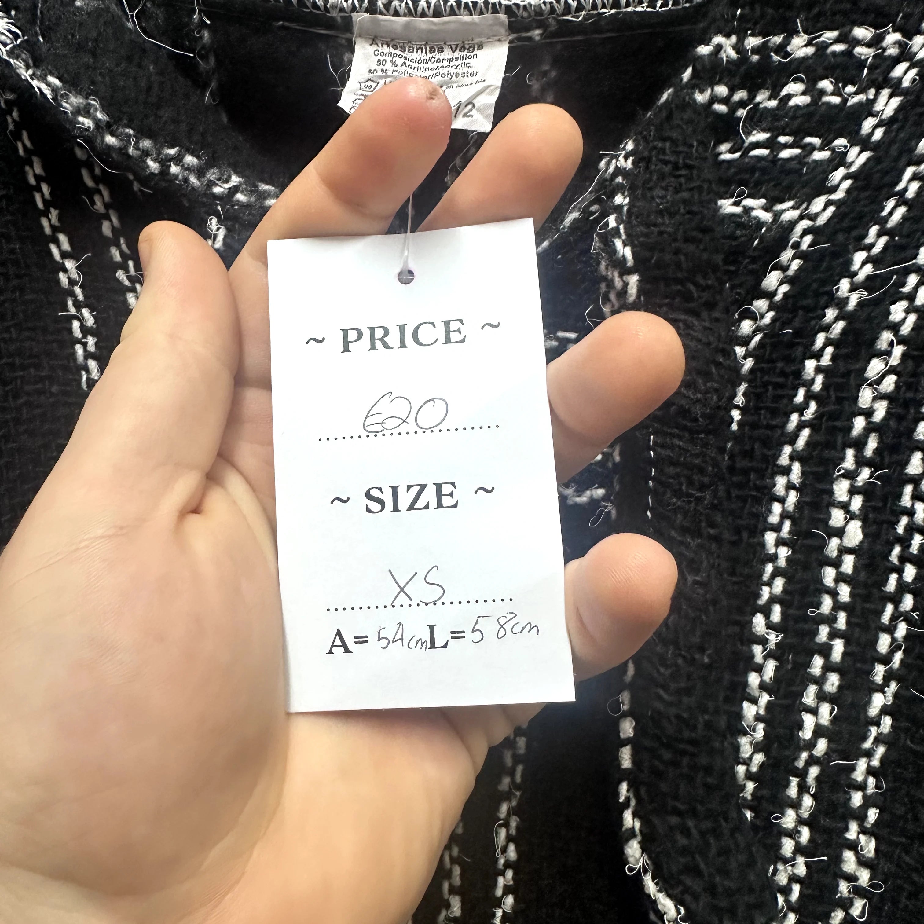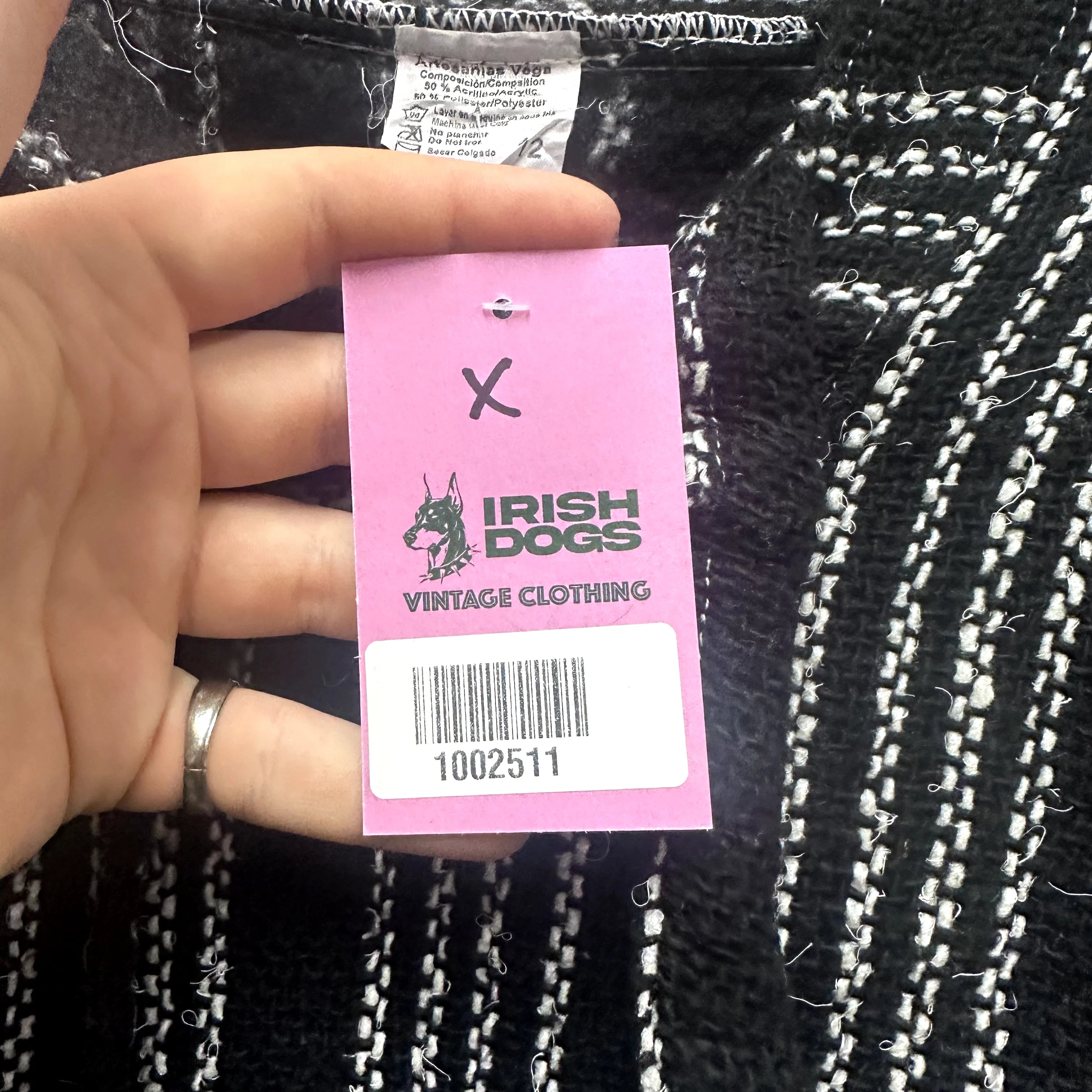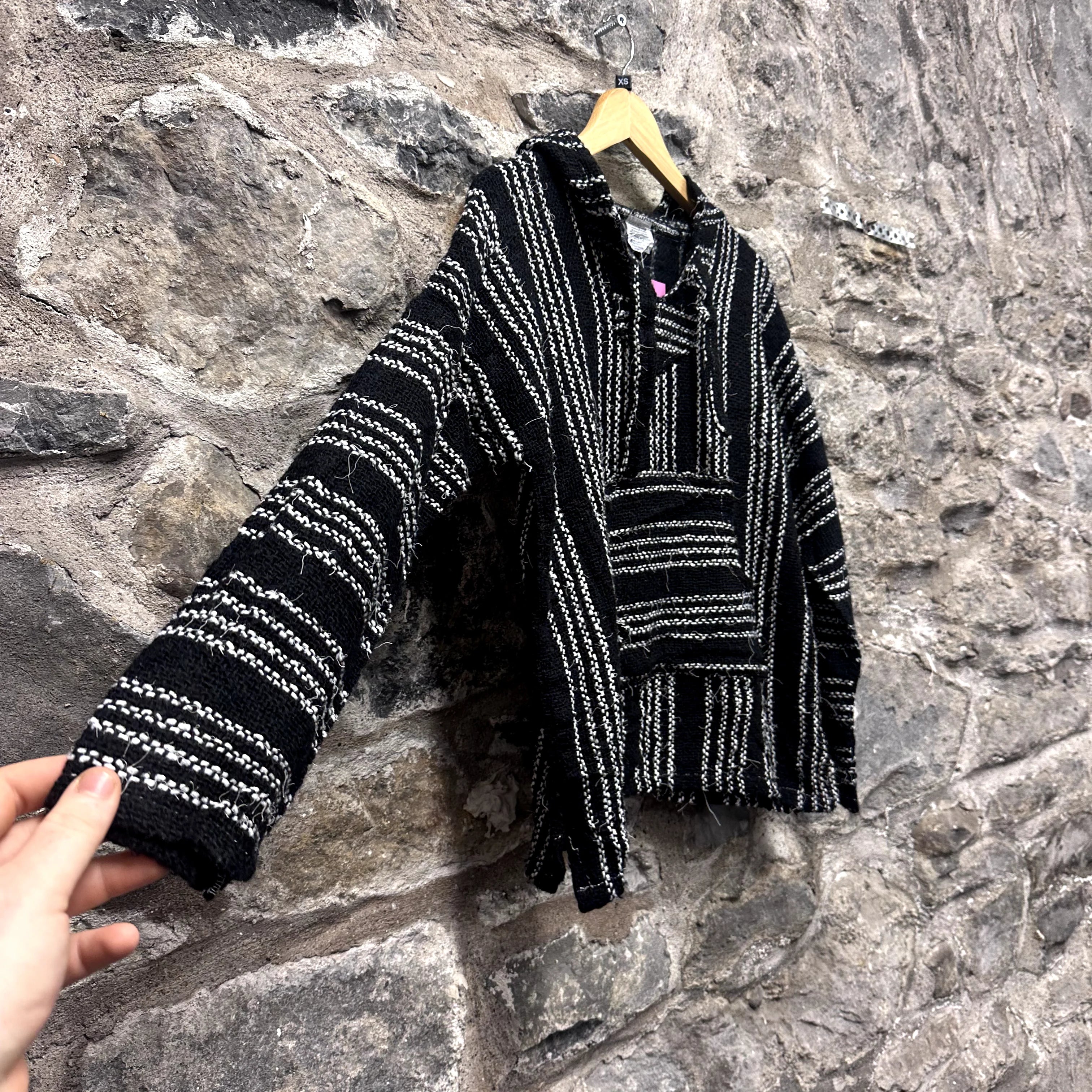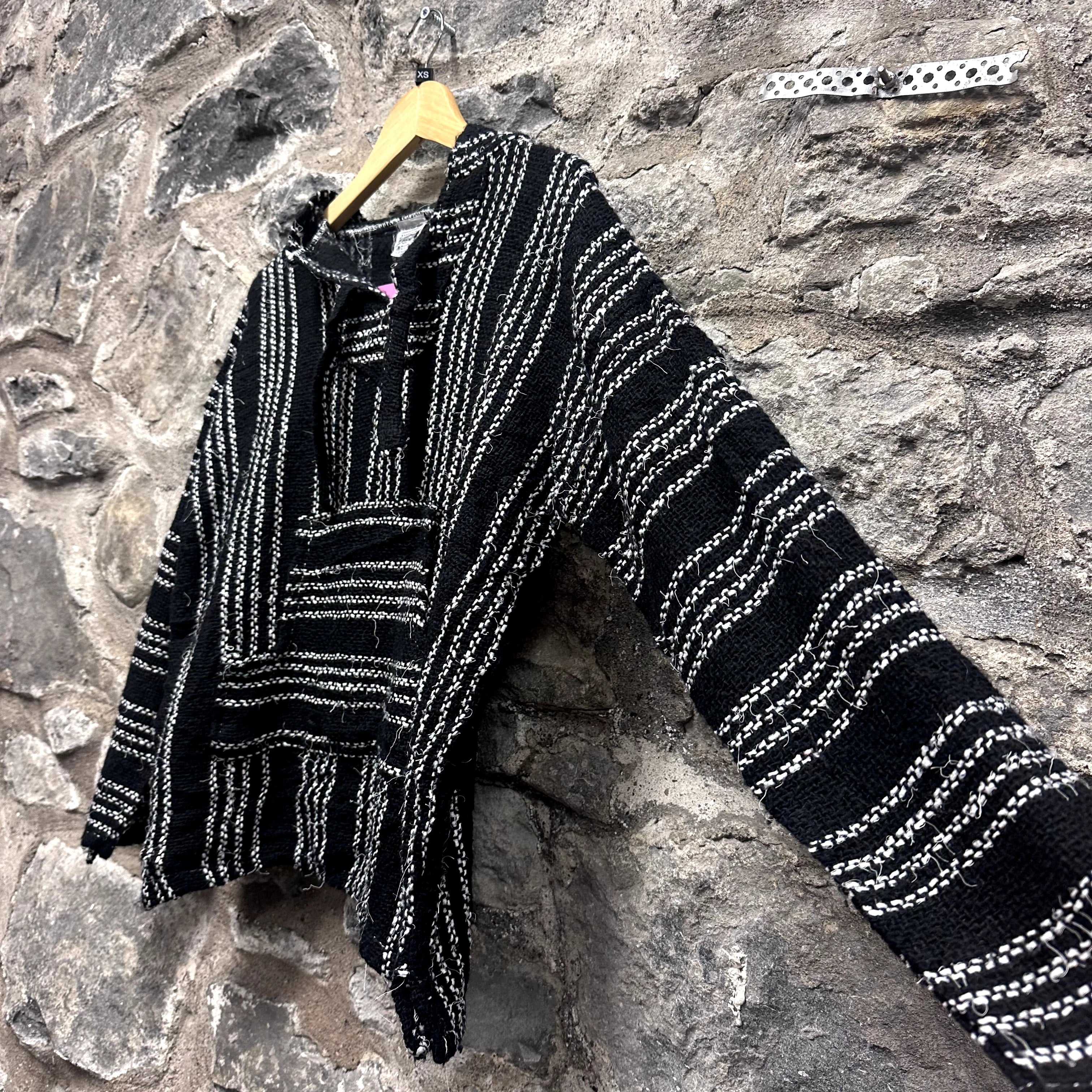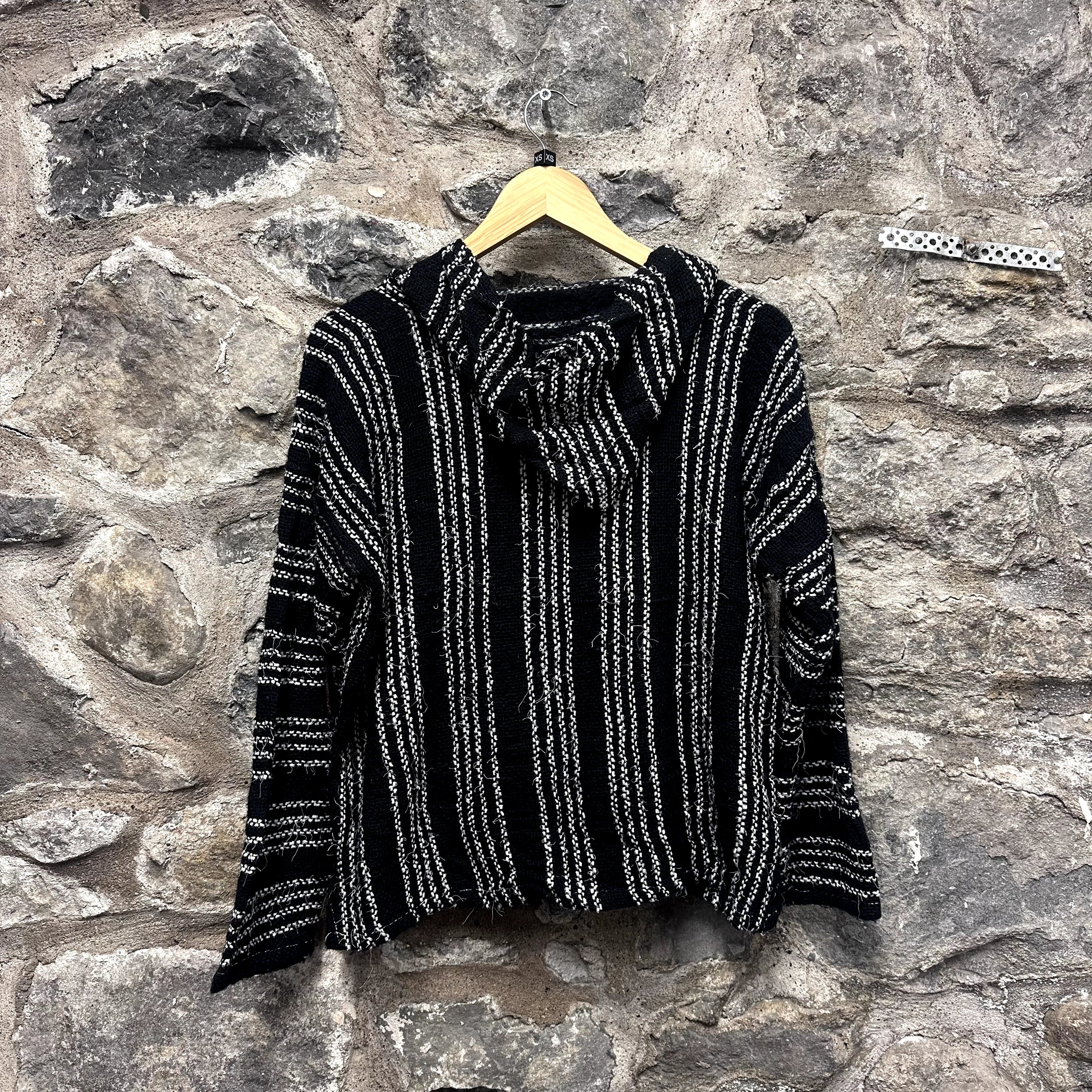 Product details: Black and white thick woven stripes, kangaroo pocket, drawstring hood, signature Baja hoodie texture, authentic vintage wear. Brand: Irish Dogs Vintage Clothing.| Label Size | |