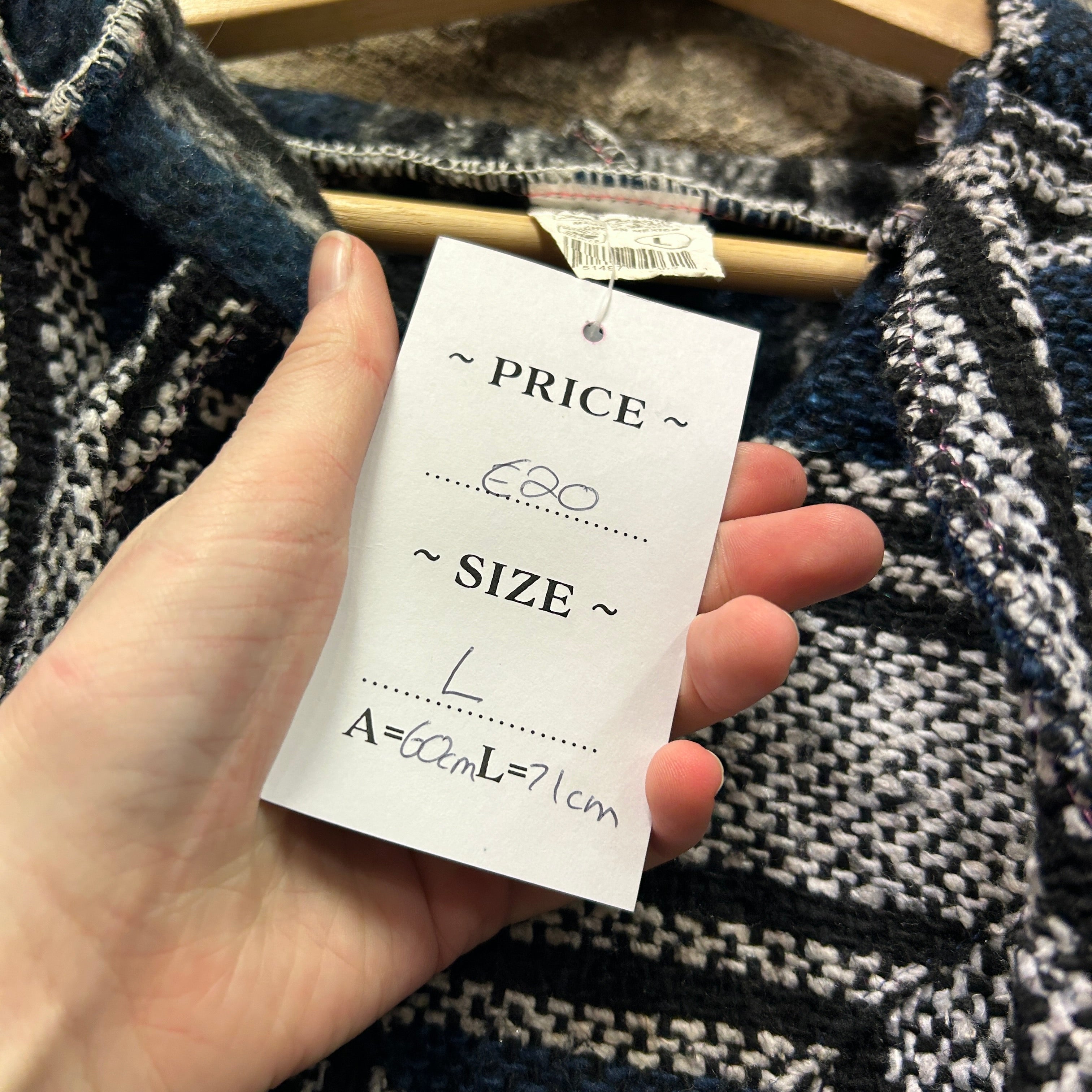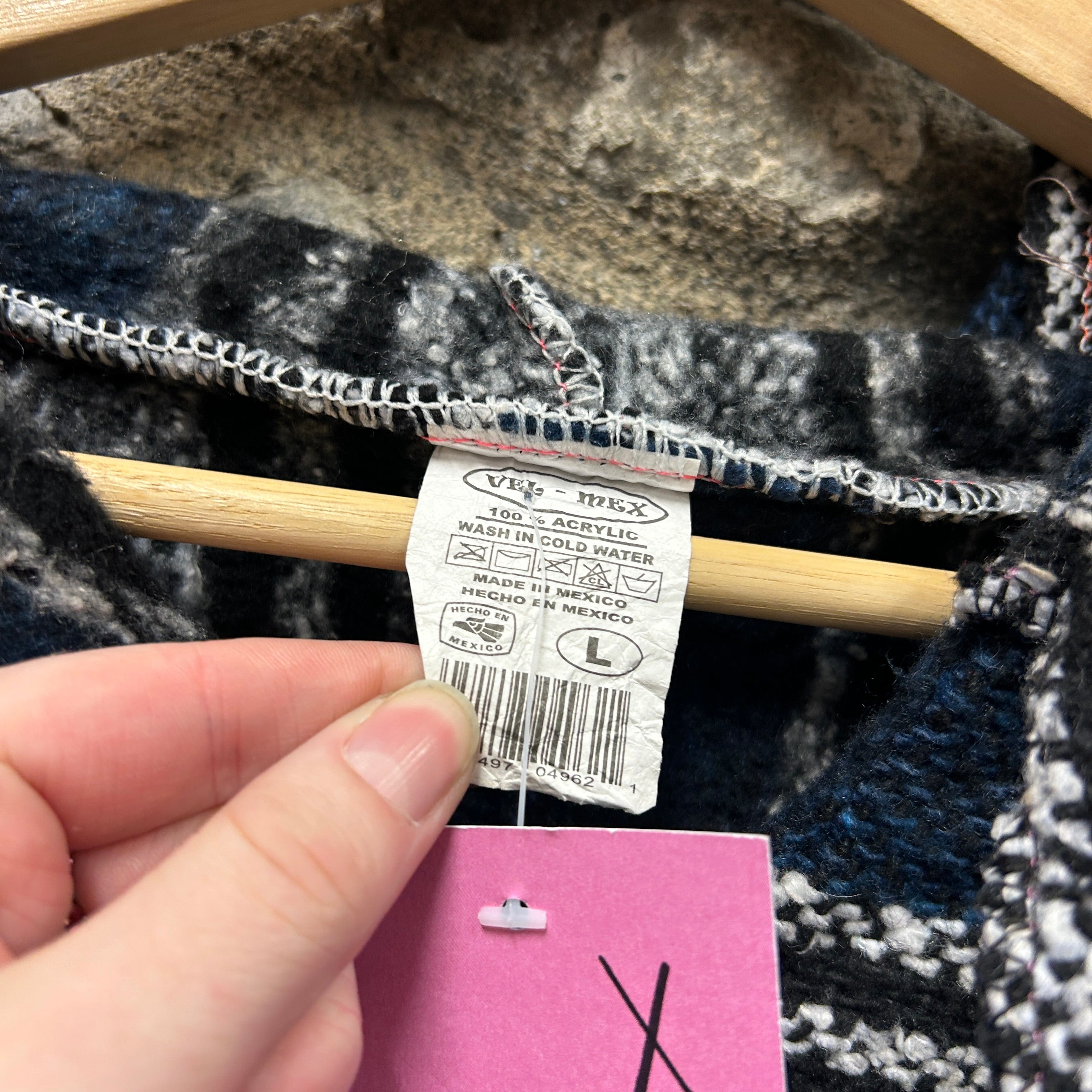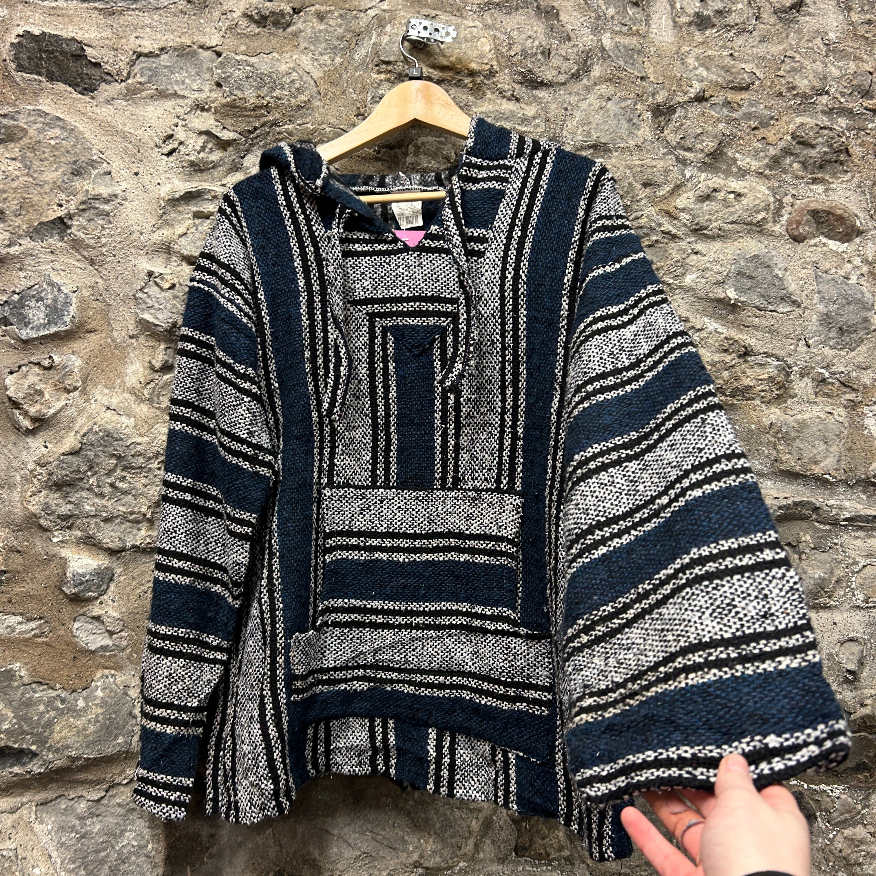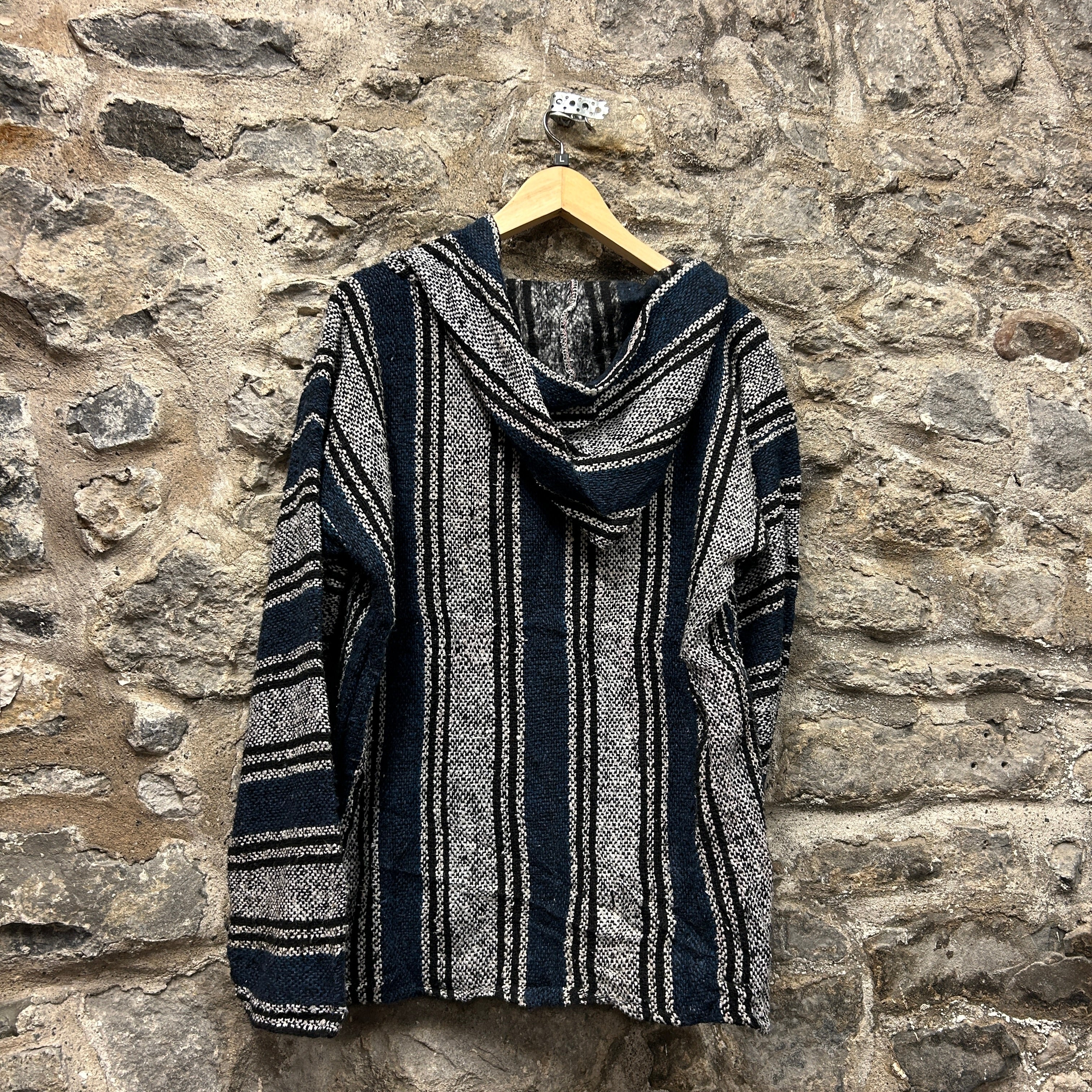 Product details: Classic woven Baja (drug rug) hoodie with striped blanket-style pattern in navy, black, and white. Features a roomy fit, V-notch neckline with drawstring hood, and large front kangaroo pocket. Textured heavyweight weave typical of surf/skater styling. Brand: .| Label Size | |
