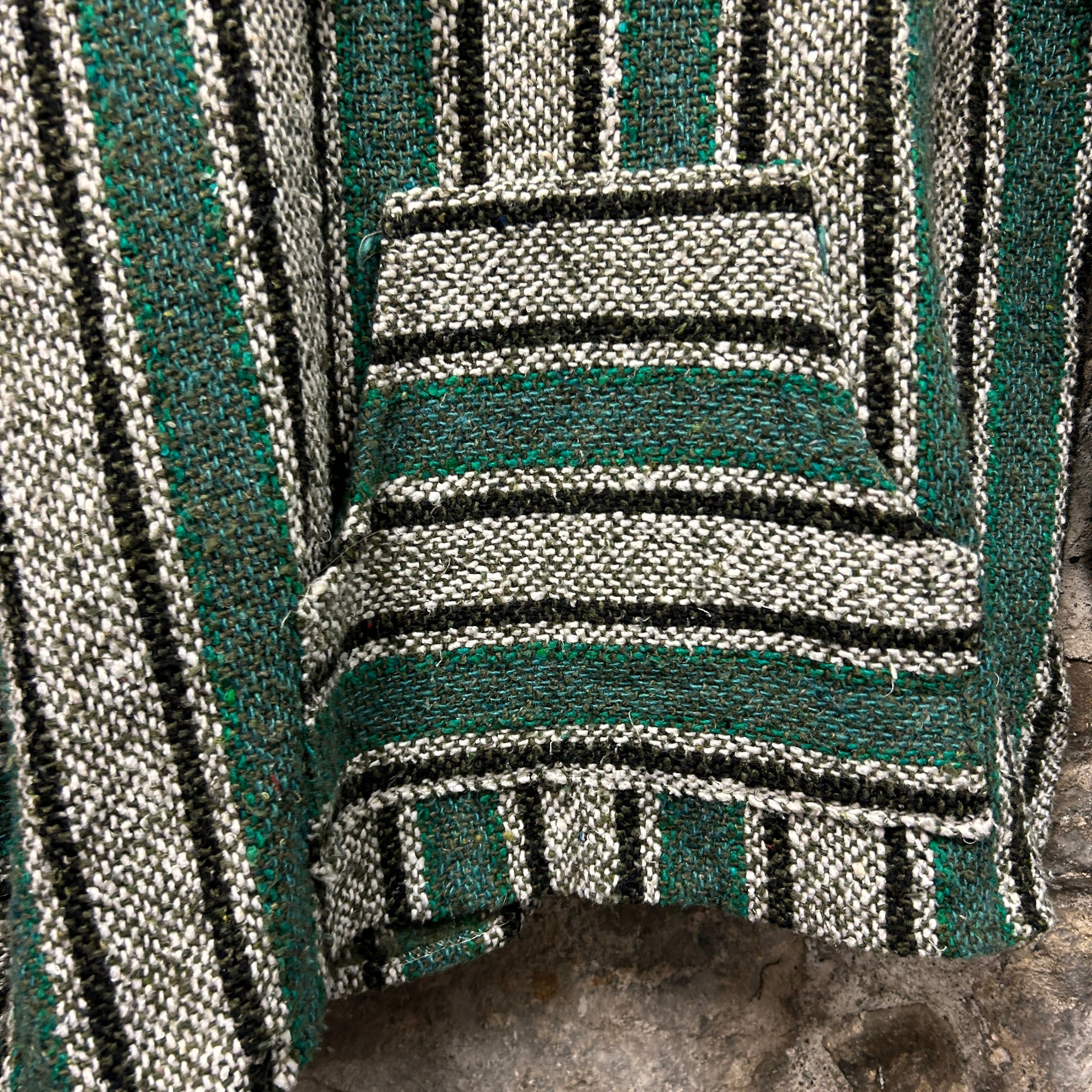 Product details: Mexican baja-style pullover hoodie in a chunky woven blanket fabric with vertical striped pattern in forest green/grey/black. Features a lace-up V-notch neckline, roomy kangaroo pouch pocket, and relaxed boxy fit; raw/overlocked seams visible at collar/hood edge. Brand: .| Label Size | |