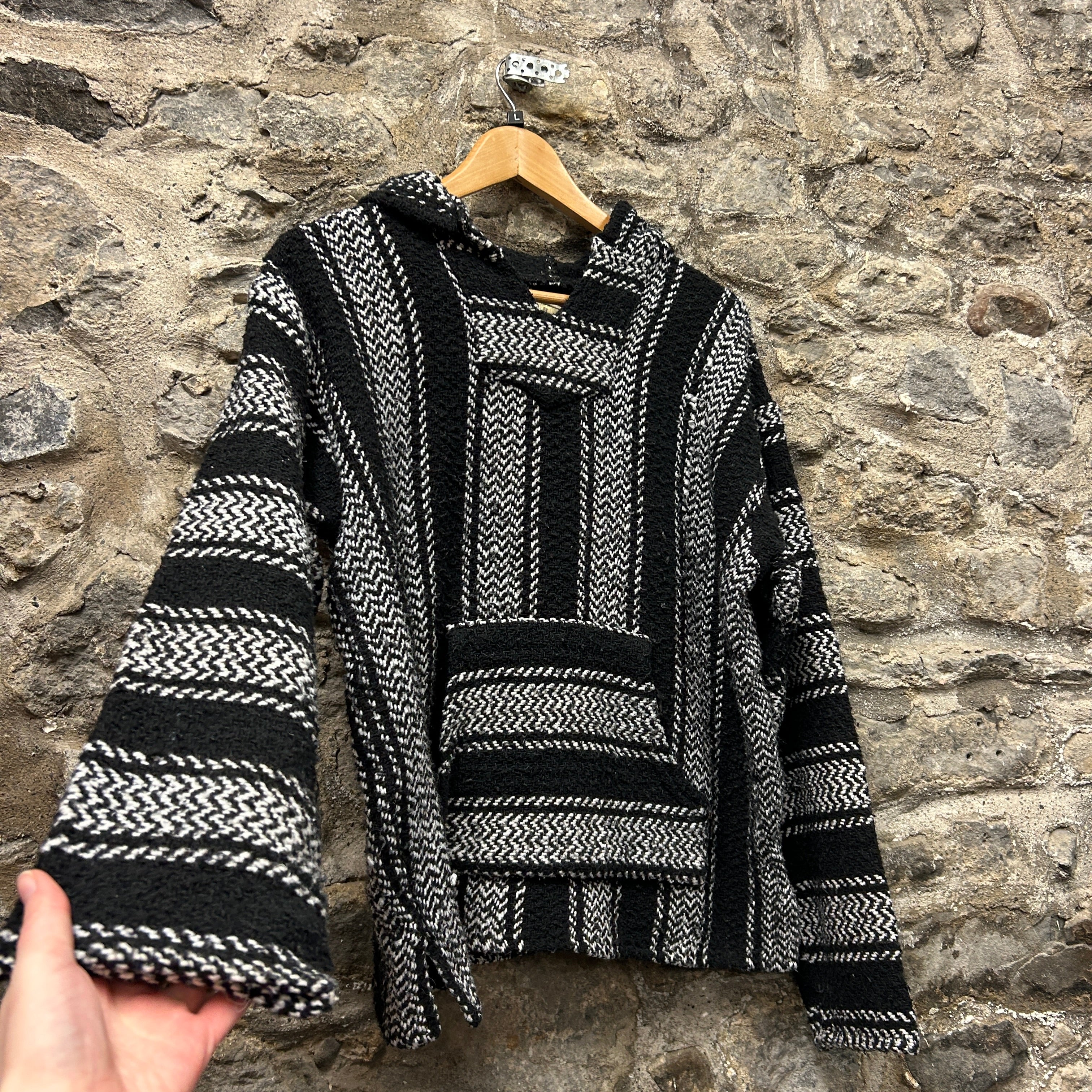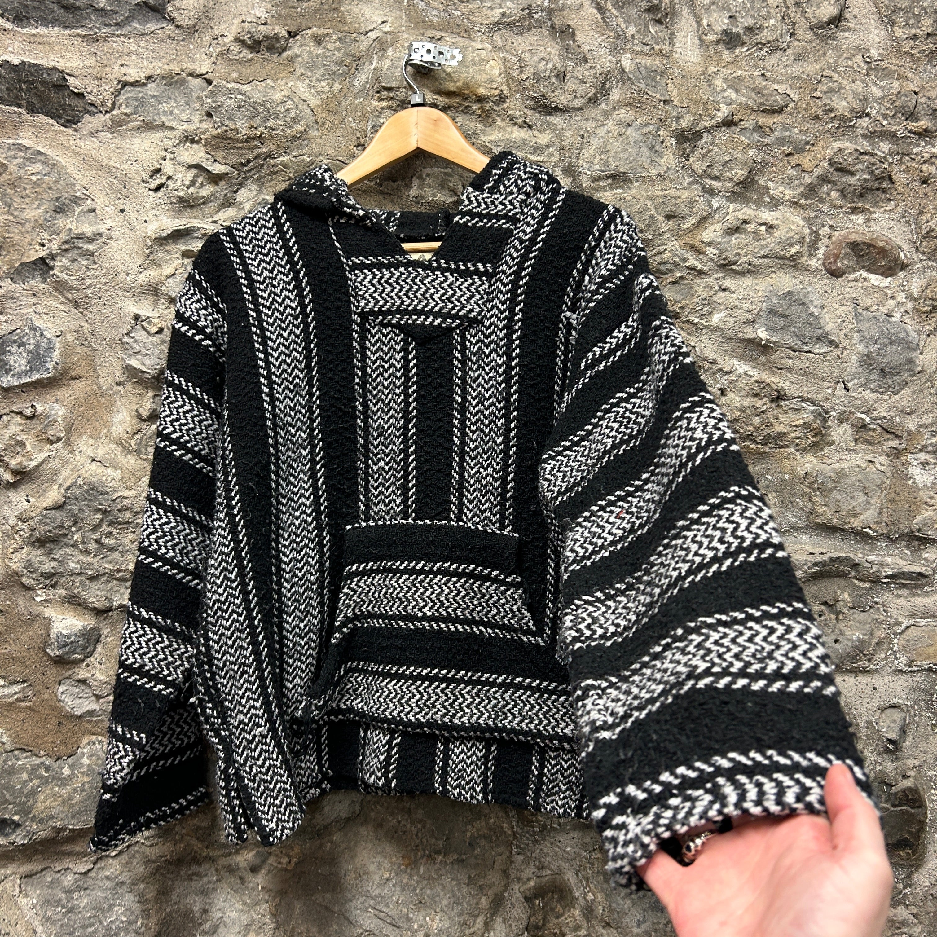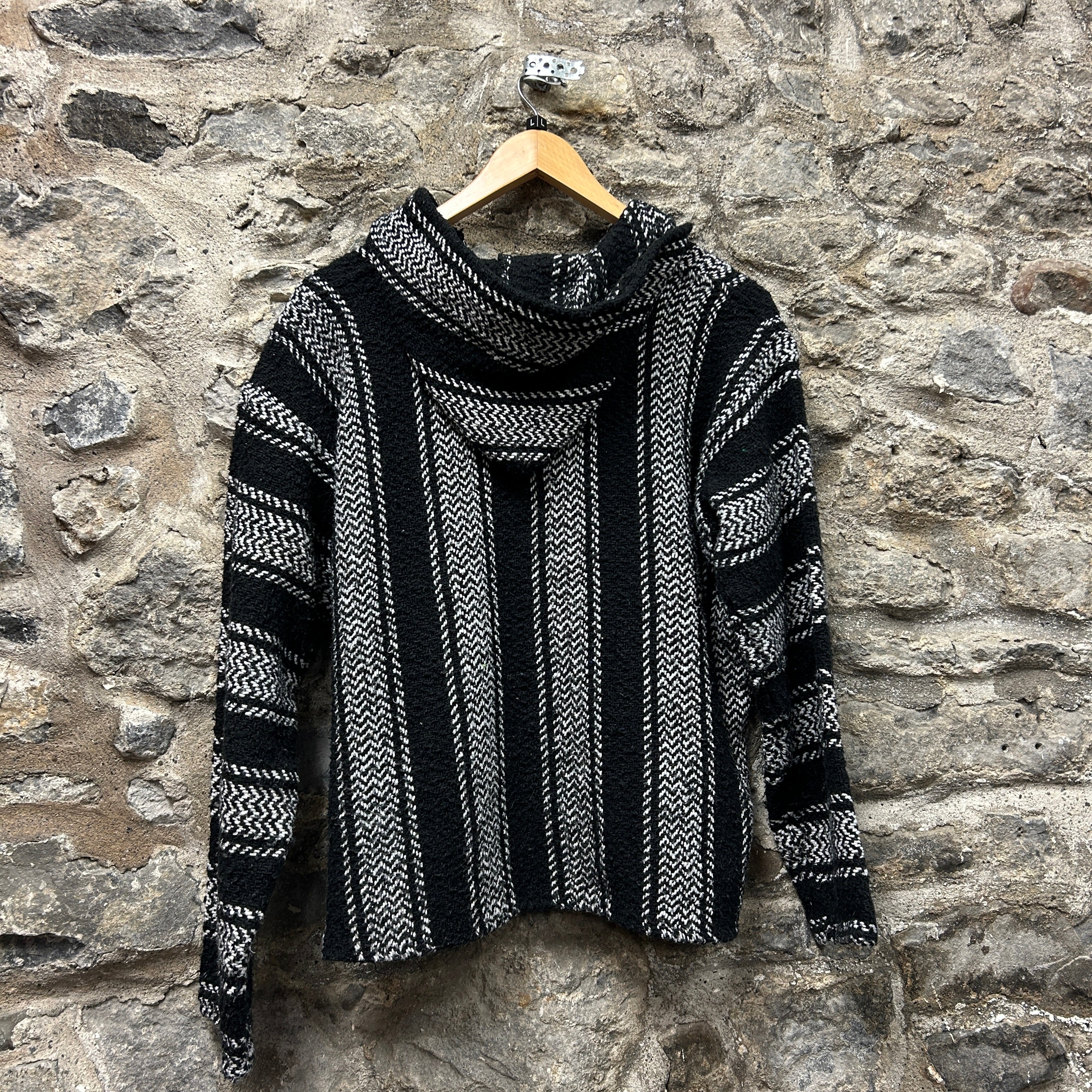 Product details: Classic Baja (drug rug) pullover hoodie in black with white woven stripe pattern and herringbone-textured knit. Features a roomy hood, V-notch neckline, long sleeves, and a front kangaroo pocket with horizontal stripe placement. Thick, nubby woven feel typical of Baja hoodies. Brand: Baja Joe.| Label Size | |