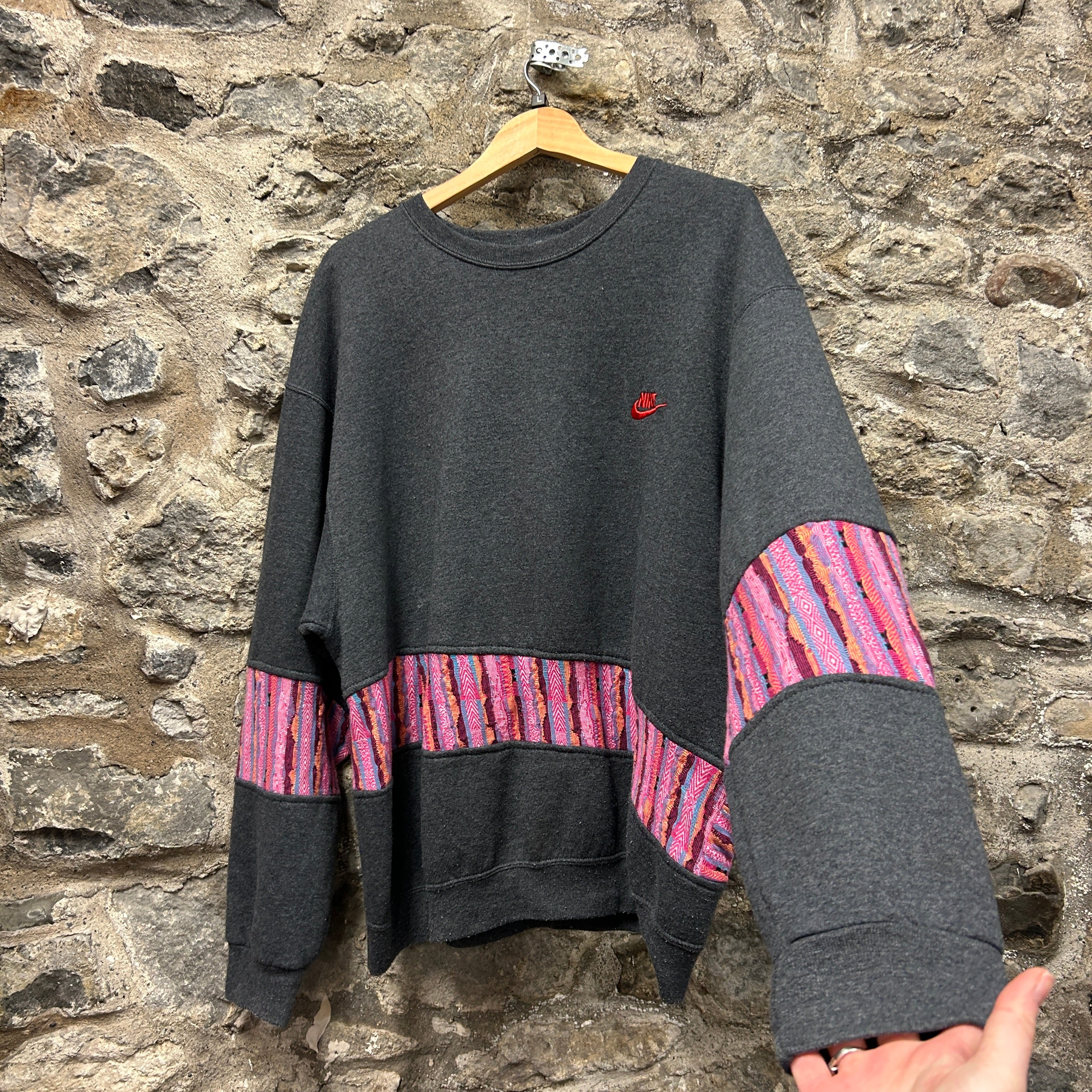 Product details: Charcoal grey Nike crewneck sweatshirt with small red embroidered Nike/Swoosh logo on the chest. Reworked/custom look with bold pink/purple woven patterned textile paneling across the mid-body and around the sleeves, plus ribbed collar/cuffs/hem and a relaxed drop-shoulder fit. Brand: Nike.| Label Size | |