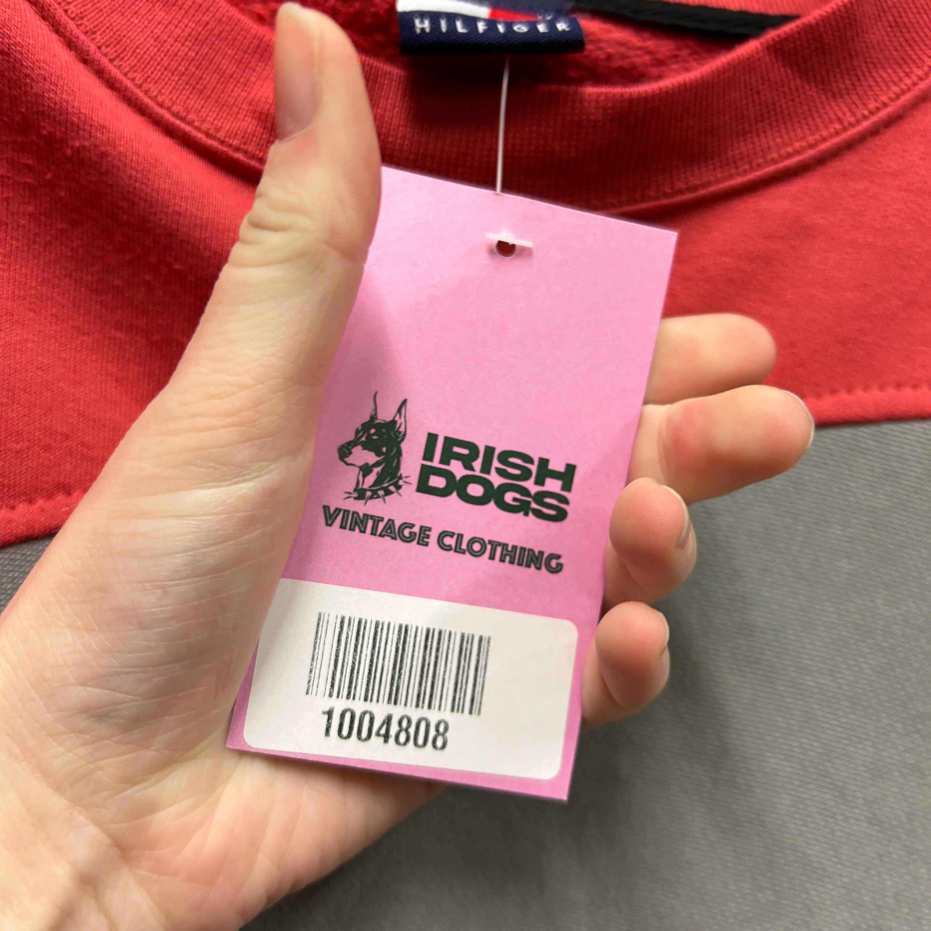 Product details: Vintage Tommy Hilfiger crewneck sweatshirt in red with oversized grey curved color-block panel across the front and matching grey sleeve bands; small embroidered Hilfiger flag logo on chest; ribbed collar, cuffs and hem; relaxed fit. Brand: Tommy Hilfiger.