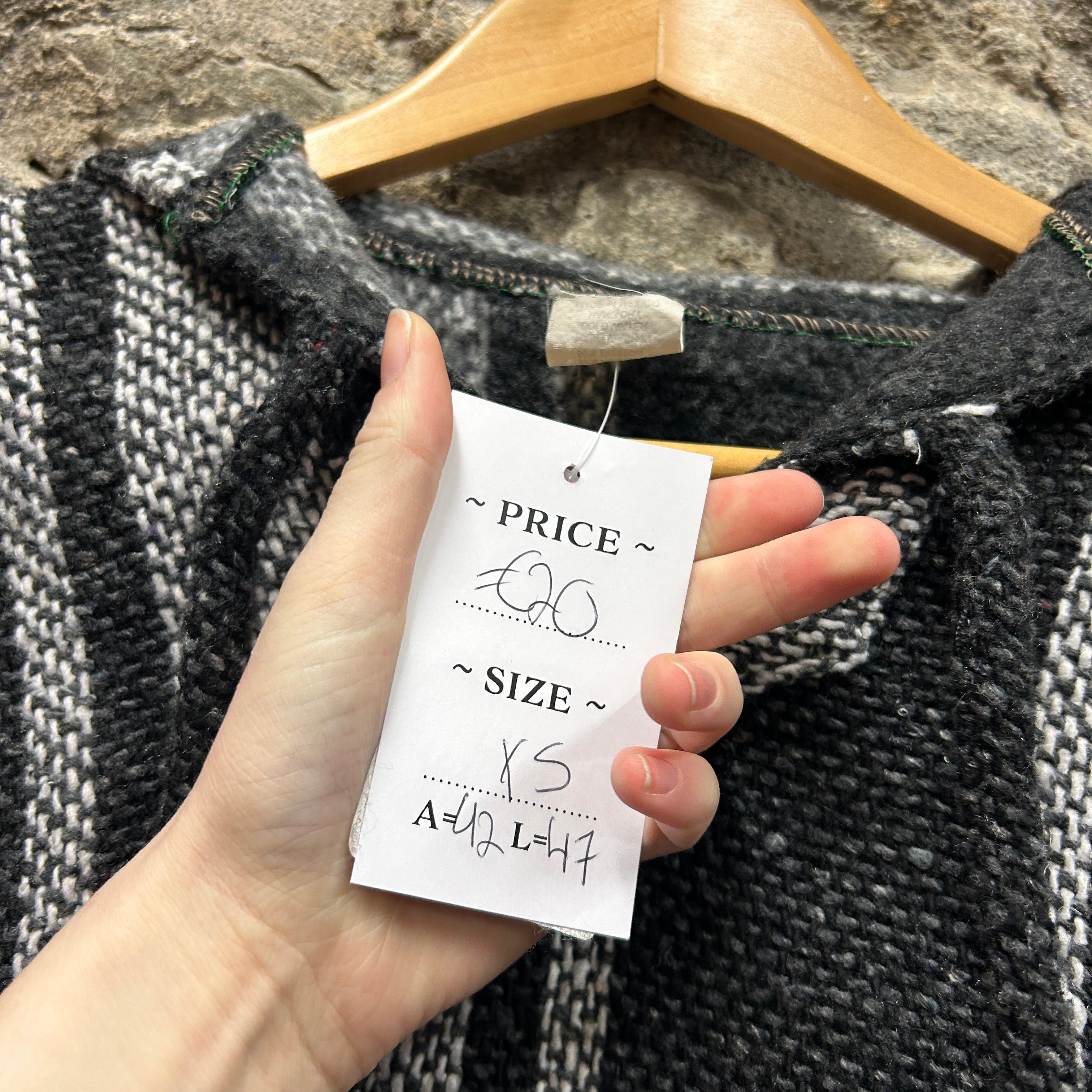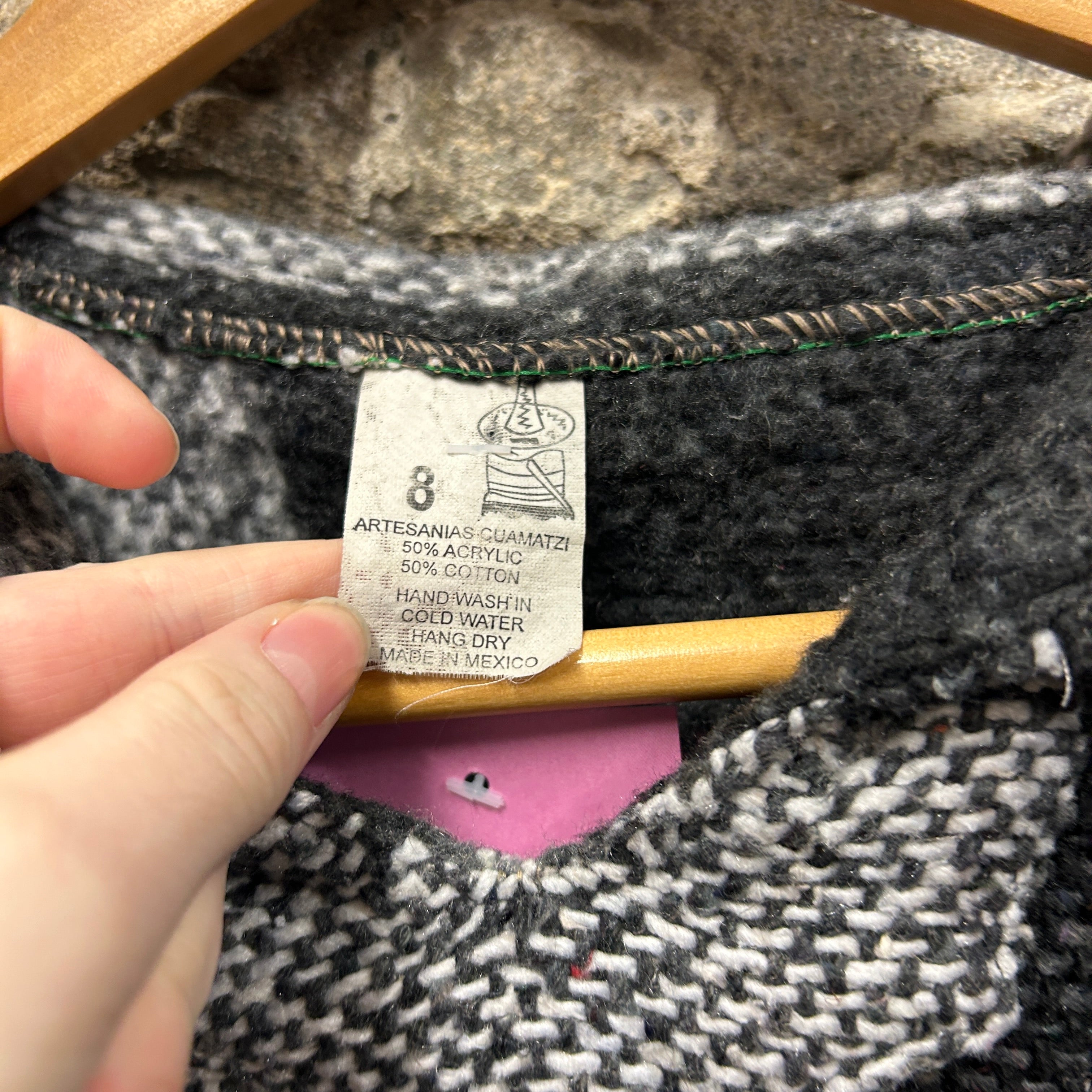 Product details: Mexican Baja pullover hoodie in black/white/grey striped weave with brushed interior, roomy hood, and front kangaroo pocket; cropped/boxy cut. Label shows 50% acrylic / 50% cotton, made in Mexico (Artesanias Cuamatzi). Brand: Artesanias Cuamatzi.| Label Size | |