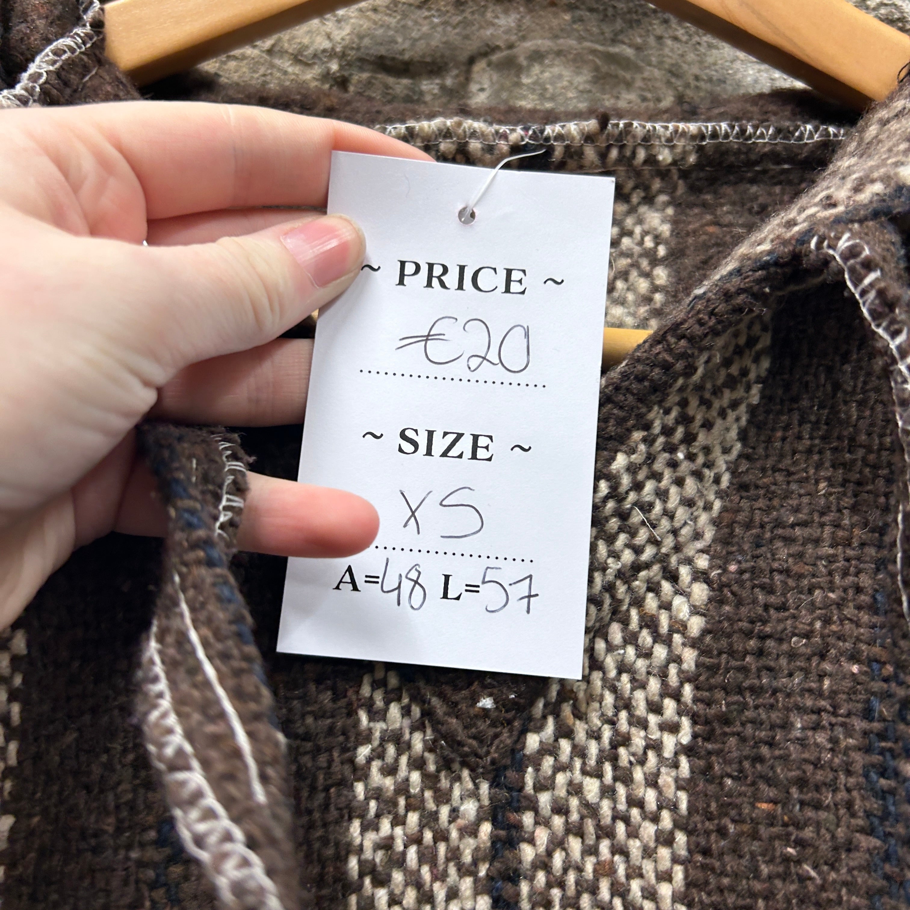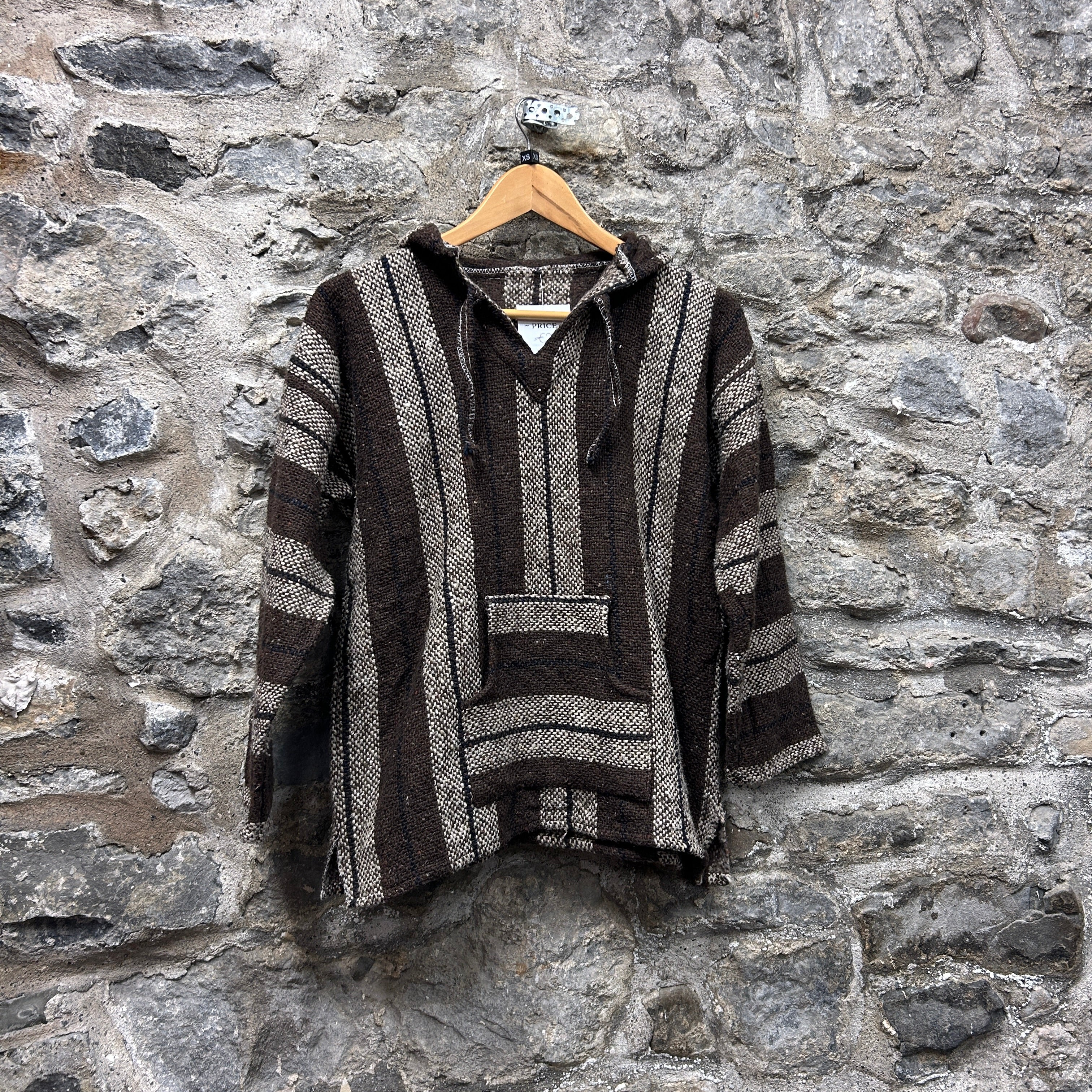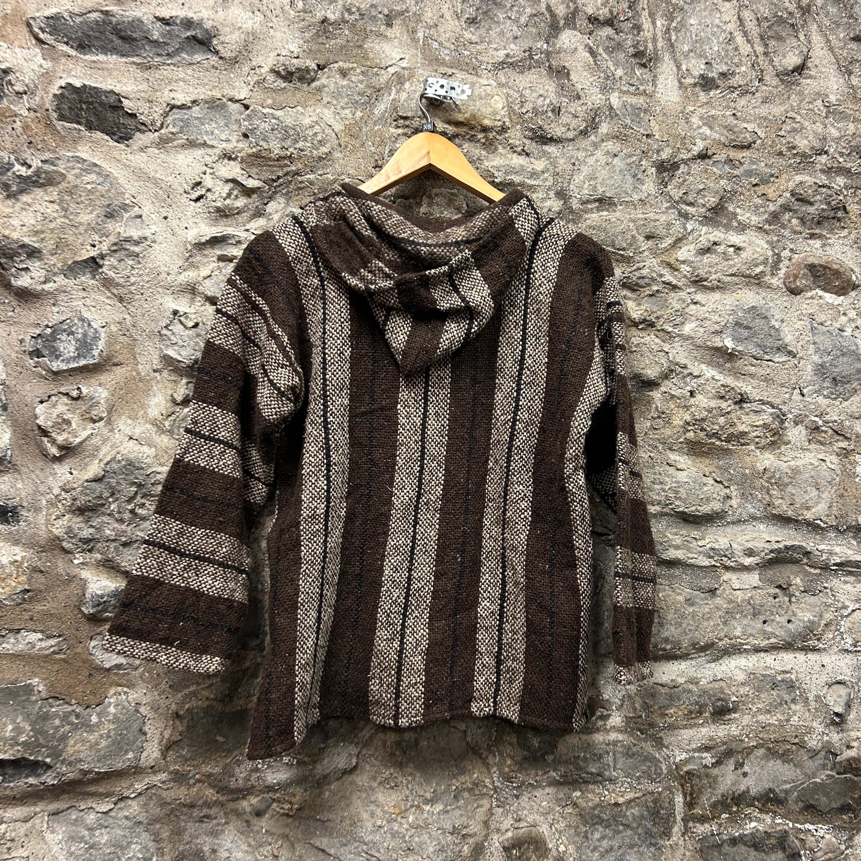 Product details: Woven Baja/jerga-style pullover hoodie in dark brown with beige vertical stripe pattern and subtle navy accent lines. Features V-notch neckline with drawstring hood, kangaroo pocket, and raw/overlocked seam finishing at edges for a rustic look. Brand: .| Label Size | |