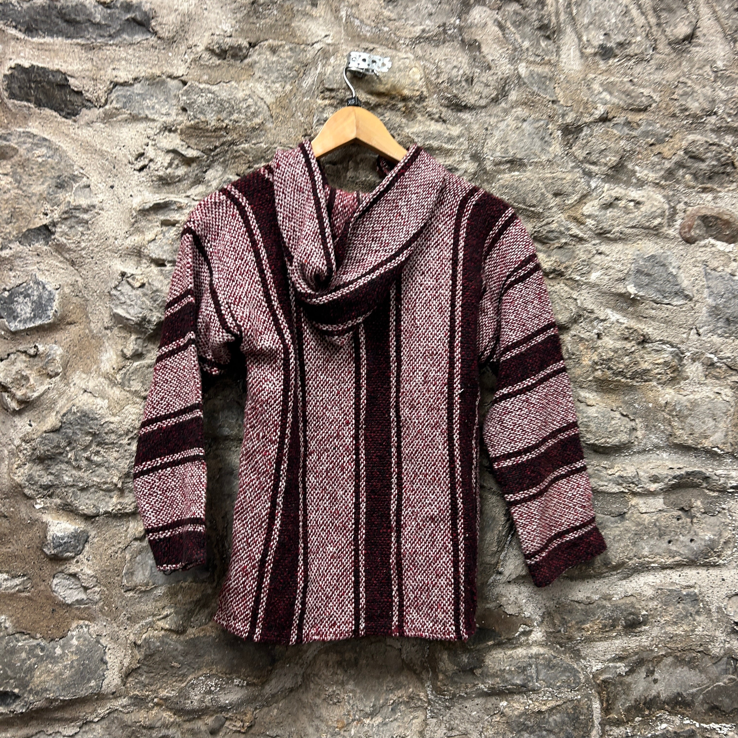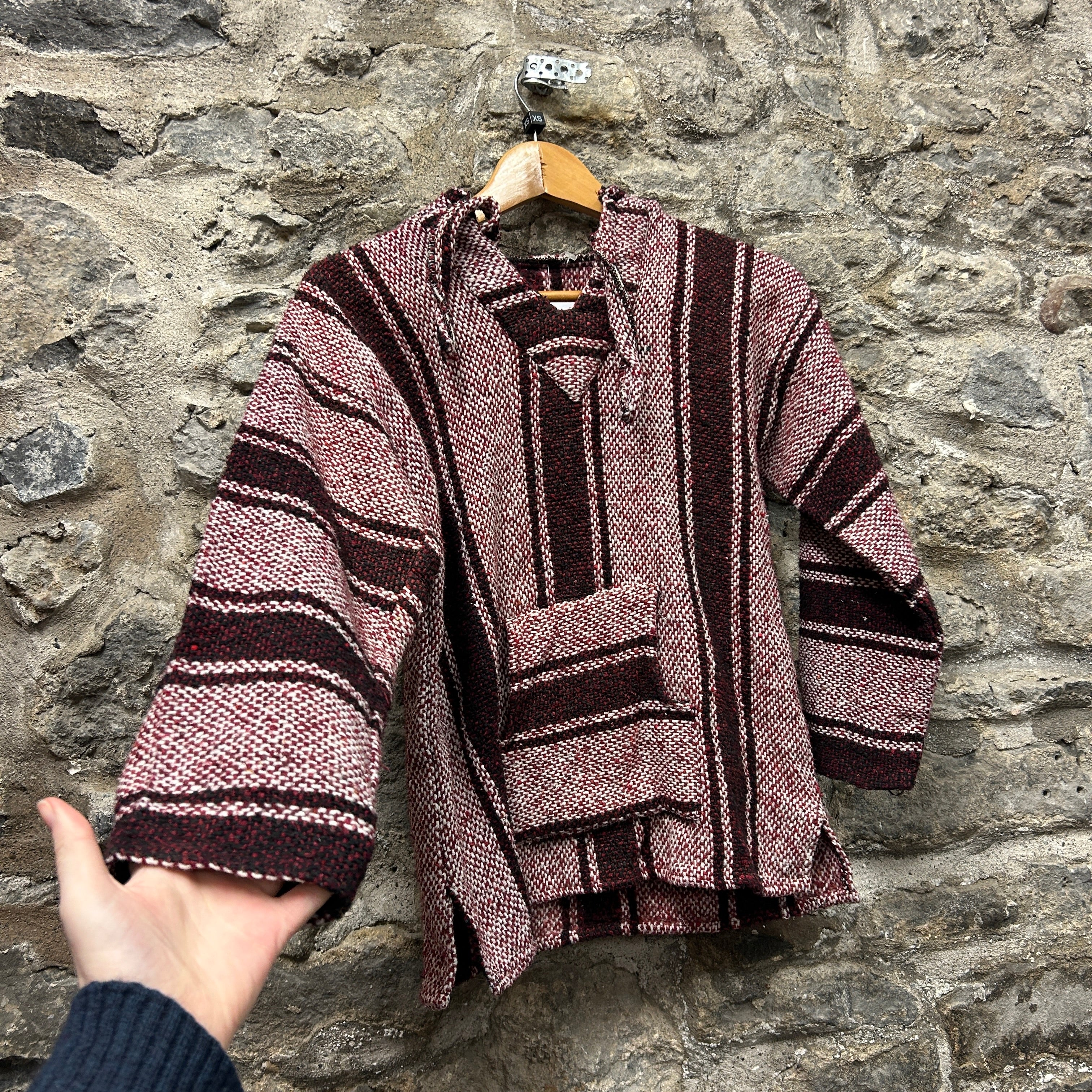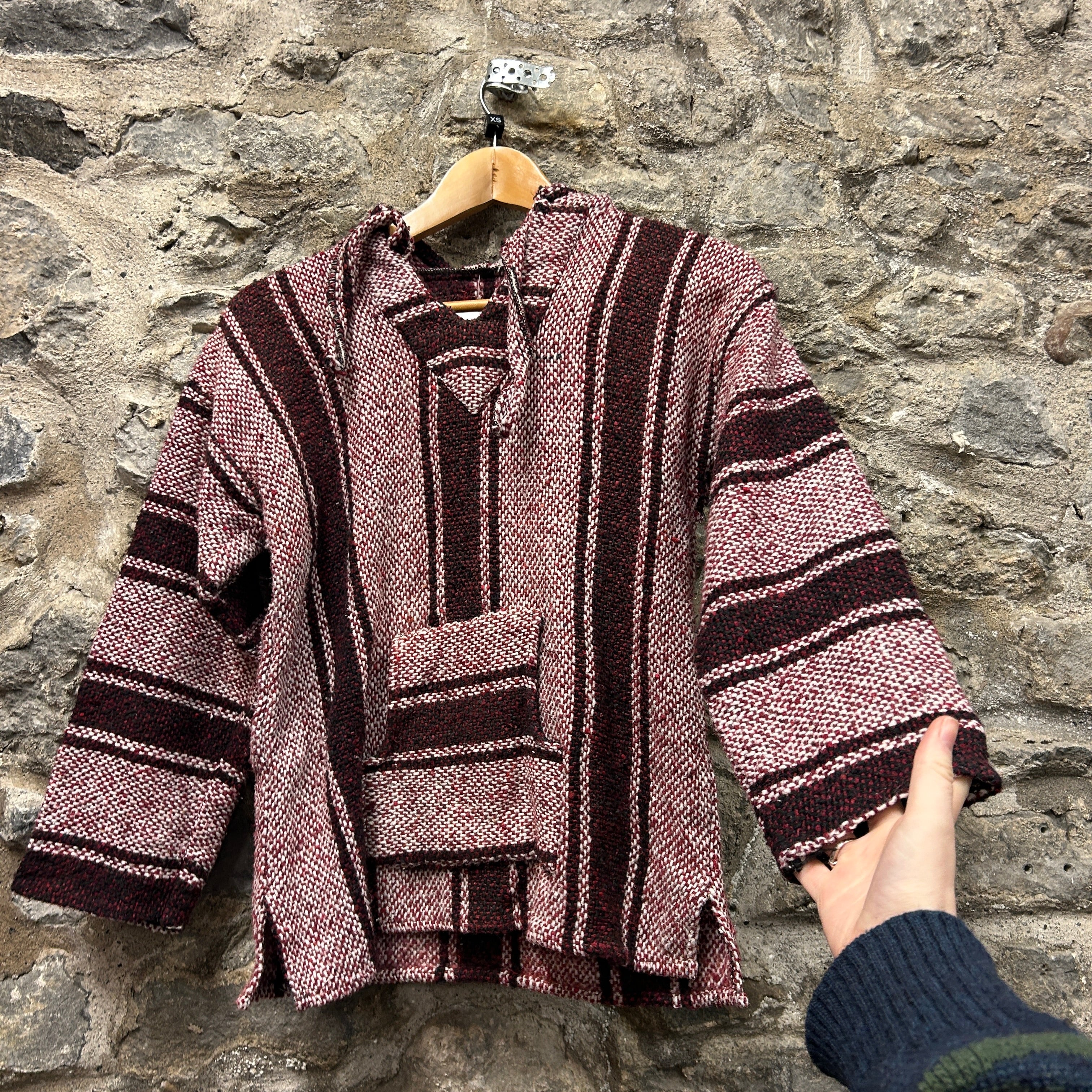 Product details: Woven baja/jerga-style hoodie in burgundy, cream and black vertical stripe pattern. Features a deep V-neck with lace-up tie detail, fixed hood, and a classic front kangaroo pouch pocket. Heavy textured weave with raw/overlocked seam finish; tagged size XS on shop tag. Brand: .| Label Size | |