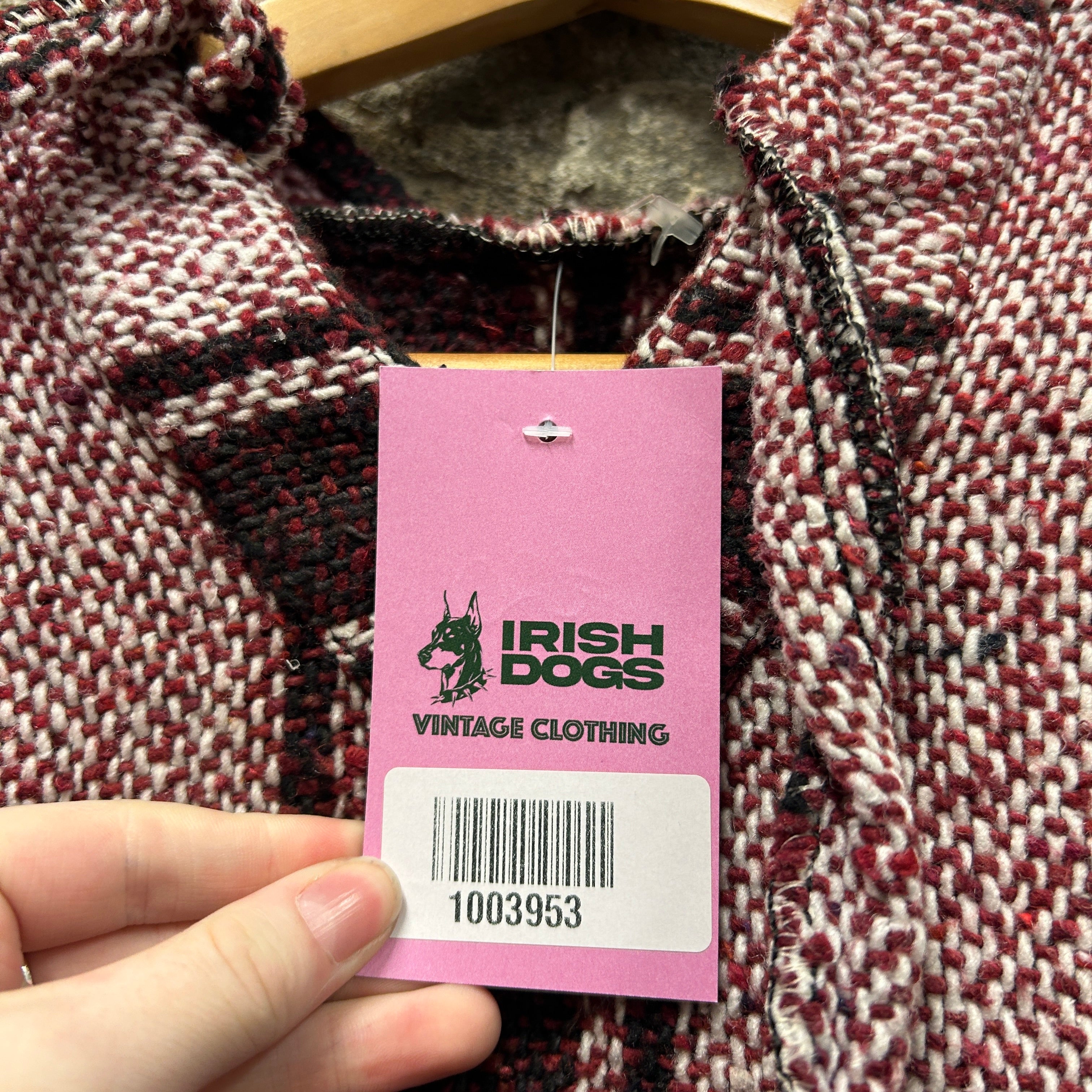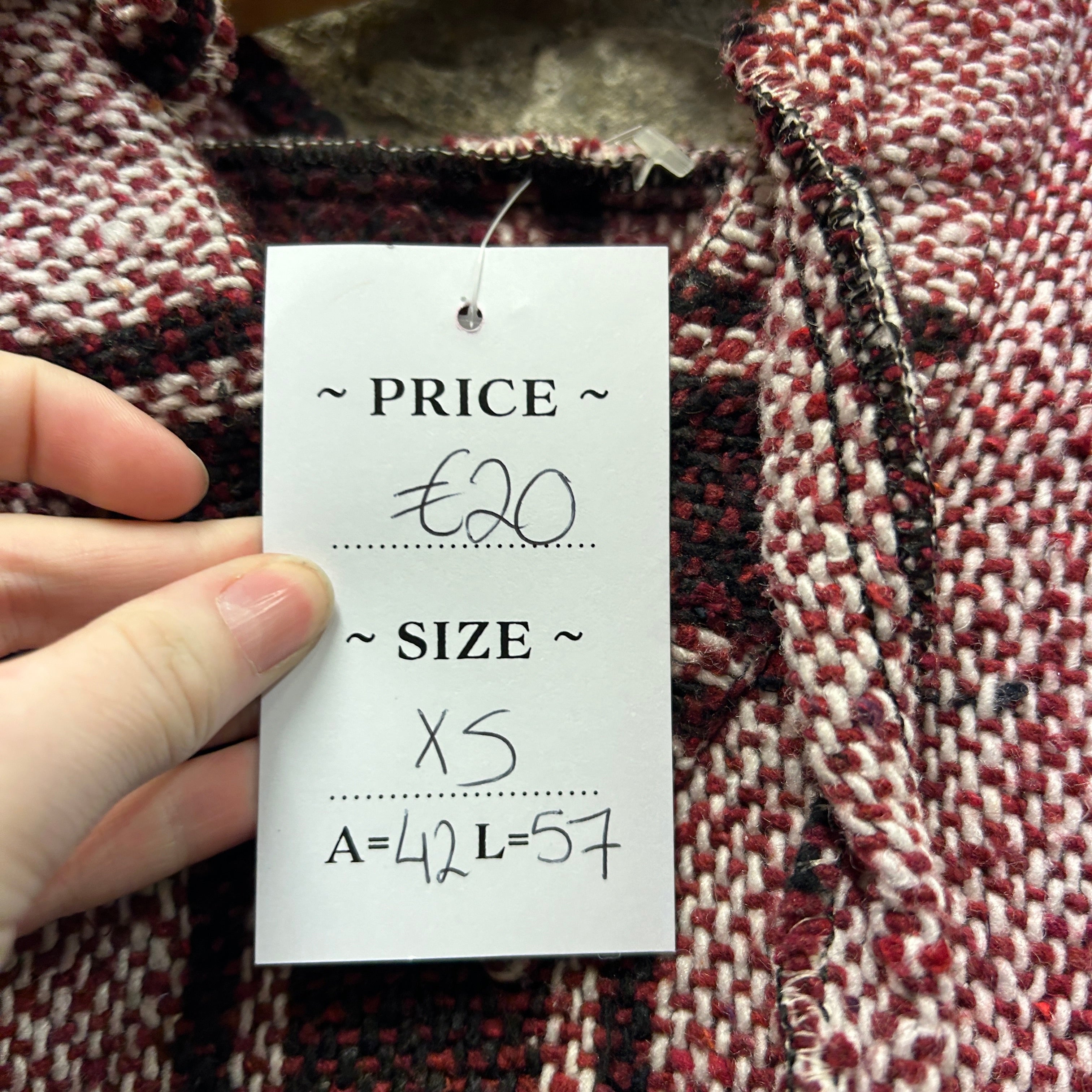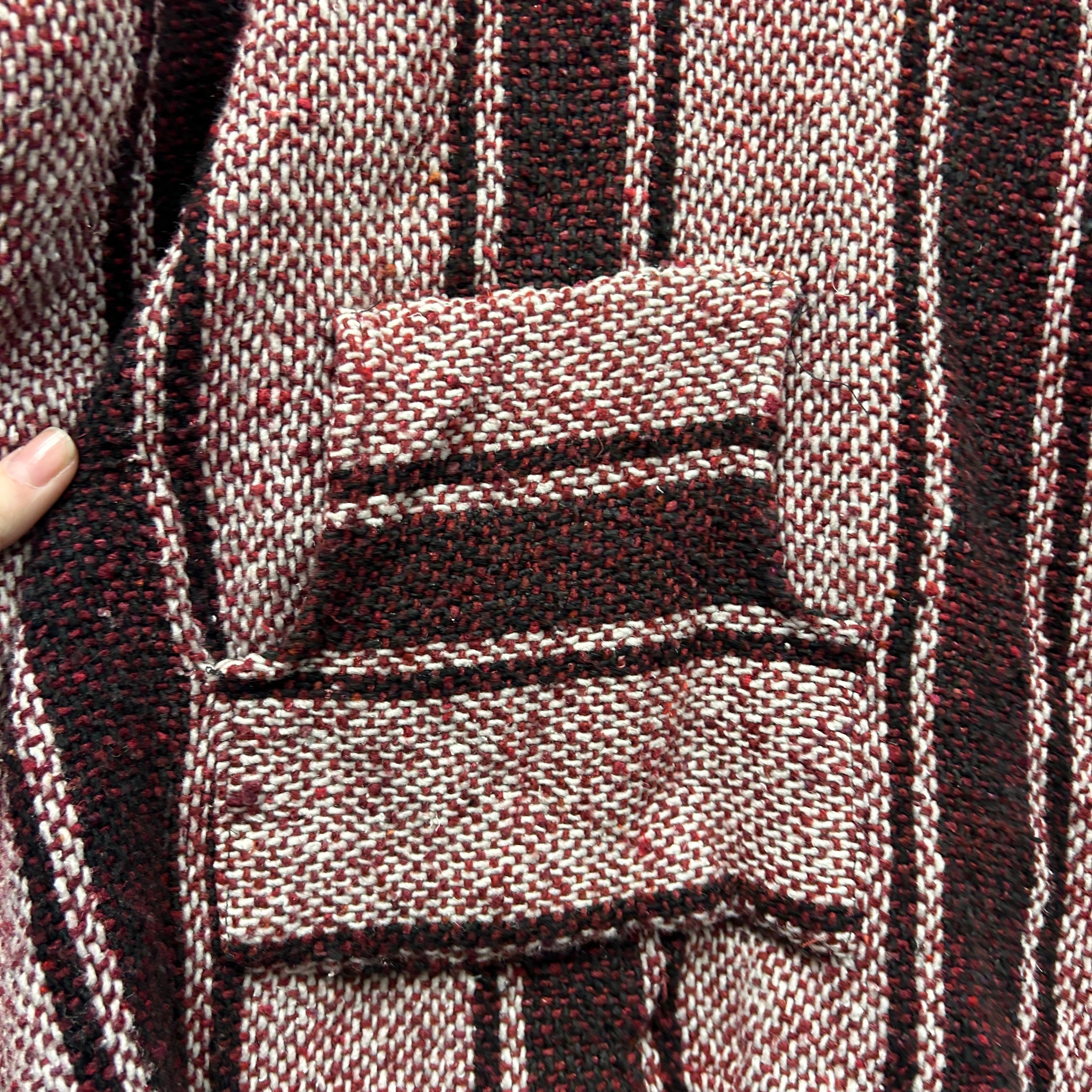 Product details: Woven baja/jerga-style hoodie in burgundy, cream and black vertical stripe pattern. Features a deep V-neck with lace-up tie detail, fixed hood, and a classic front kangaroo pouch pocket. Heavy textured weave with raw/overlocked seam finish; tagged size XS on shop tag. Brand: .| Label Size | |