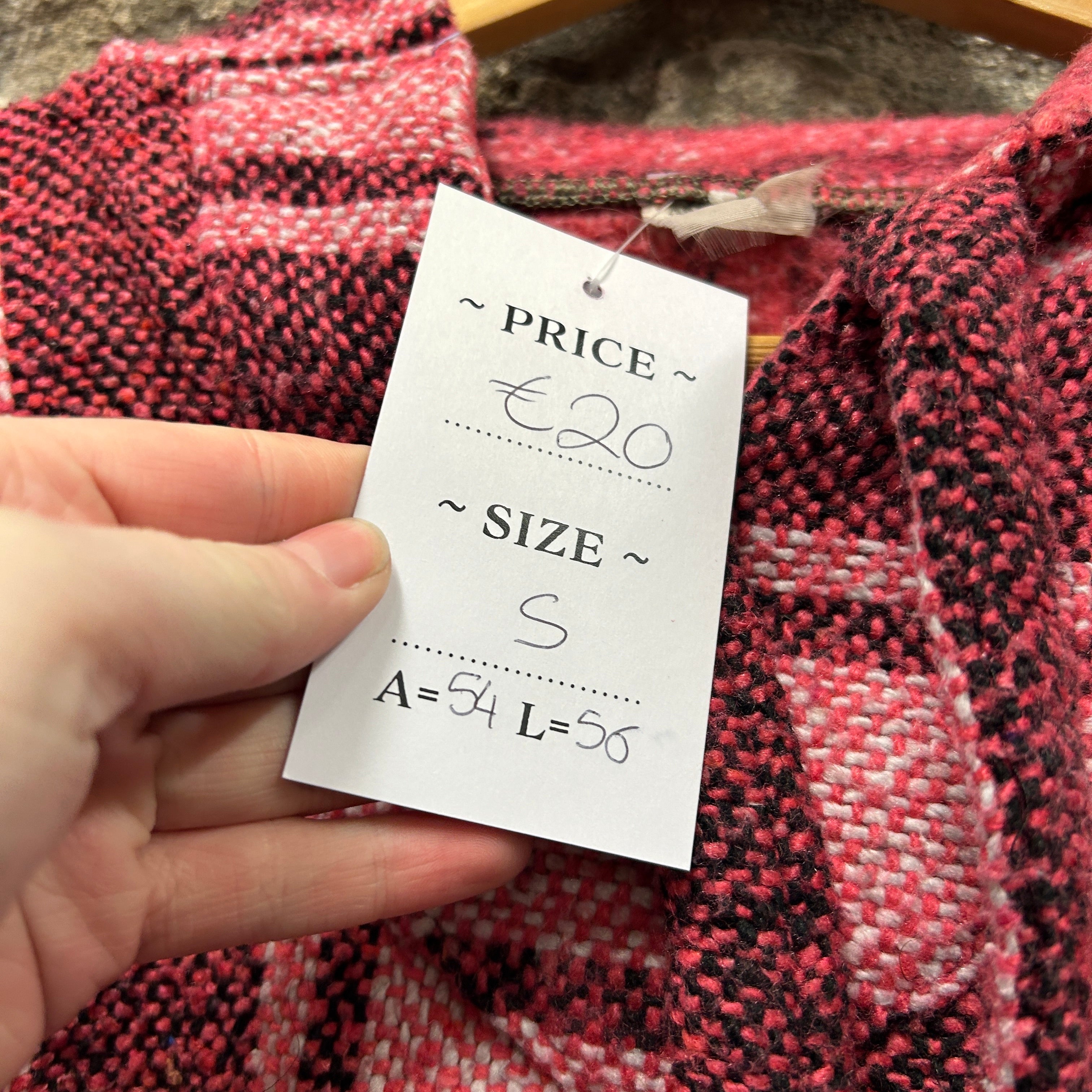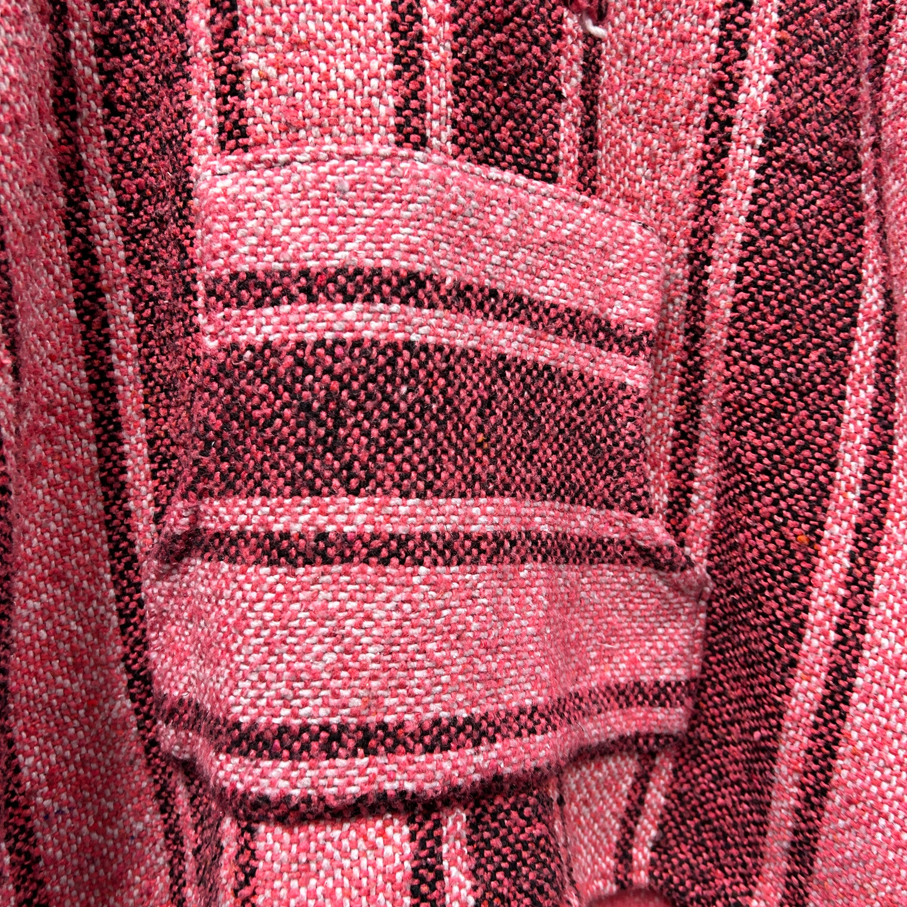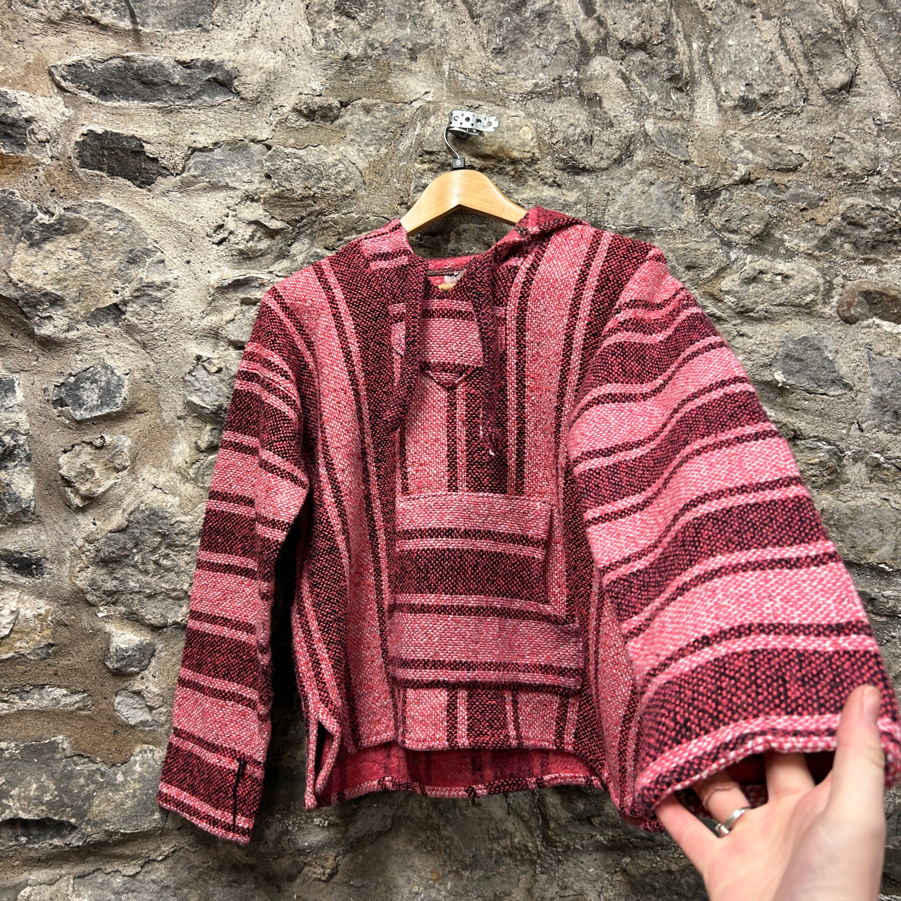 Product details: Woven Baja pullover hoodie in a red/burgundy, pink and black stripe pattern. Features a short V-slit neckline with a small hood, long sleeves, and a cropped/boxy fit. Textured blanket-weave fabric typical of Baja hoodies; no visible kangaroo pocket in photos. Brand: .| Label Size | |