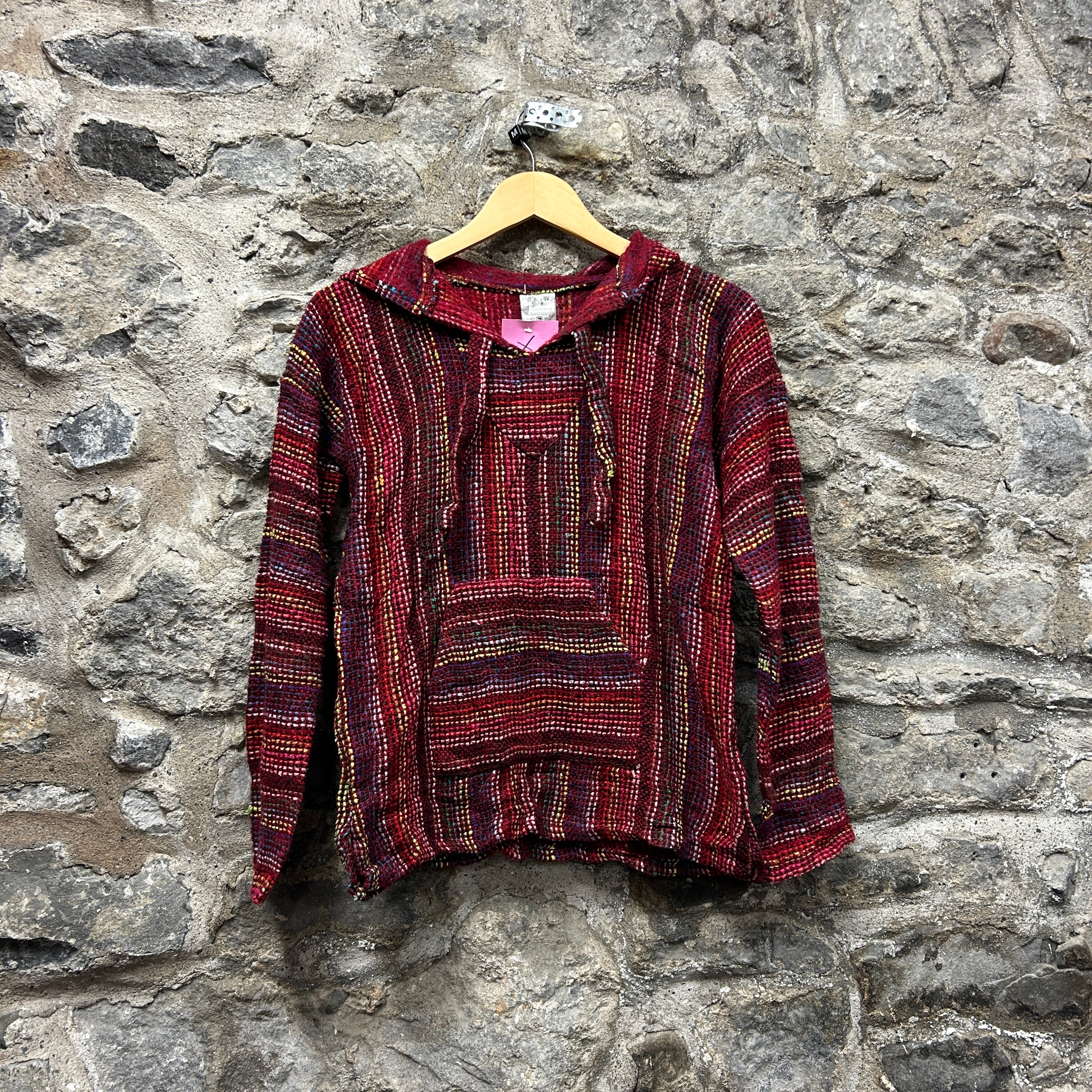 Product details: Woven Baja/jerga-style pullover hoodie in a rich red base with multicolor stripe weave (yellow/green/blue/white flecks). Features a relaxed hood with drawstrings, classic front kangaroo pocket, and slightly boxy fit with straight hem and cuffs; textured, nubby woven fabric typical of surf/skater Baja hoodies. Brand: .