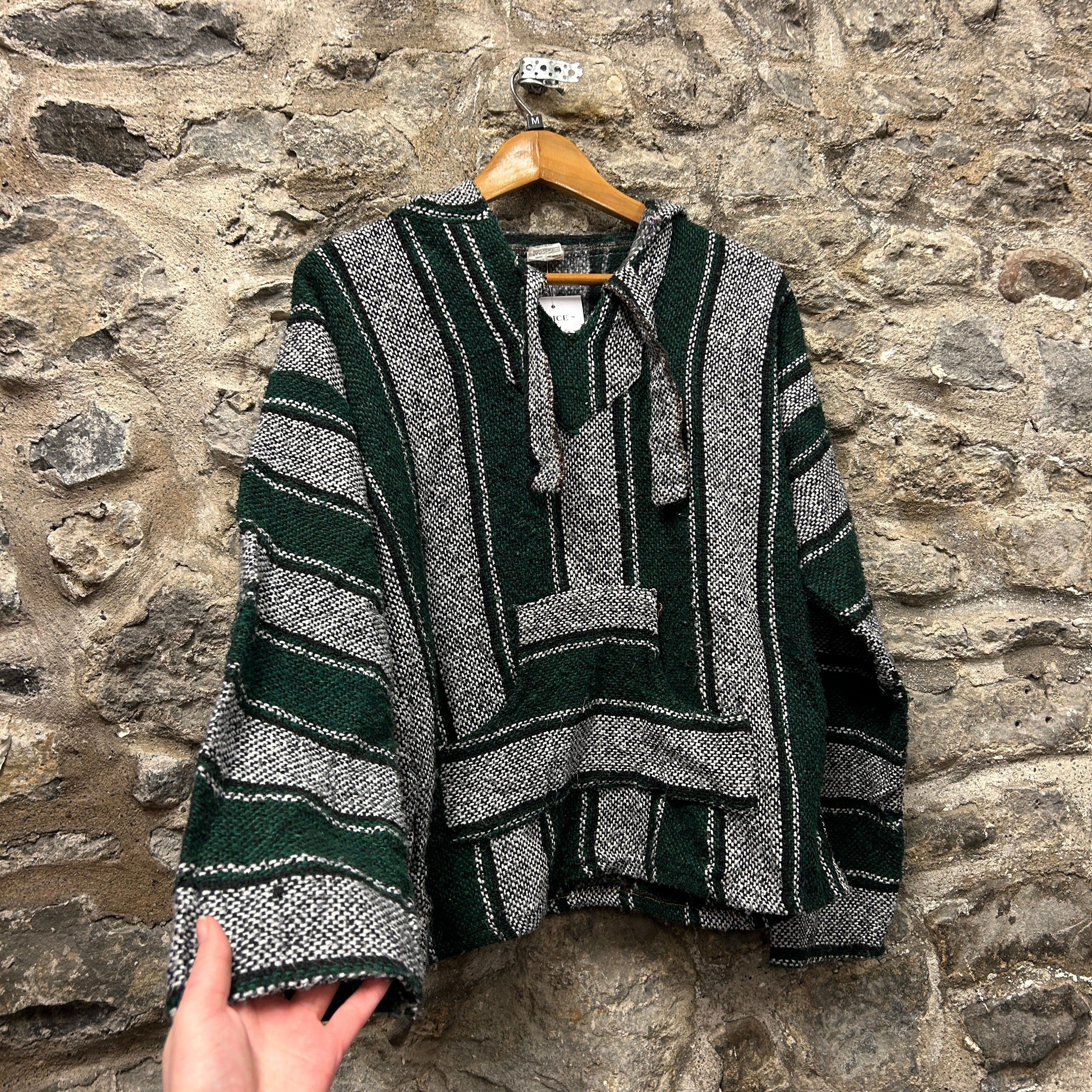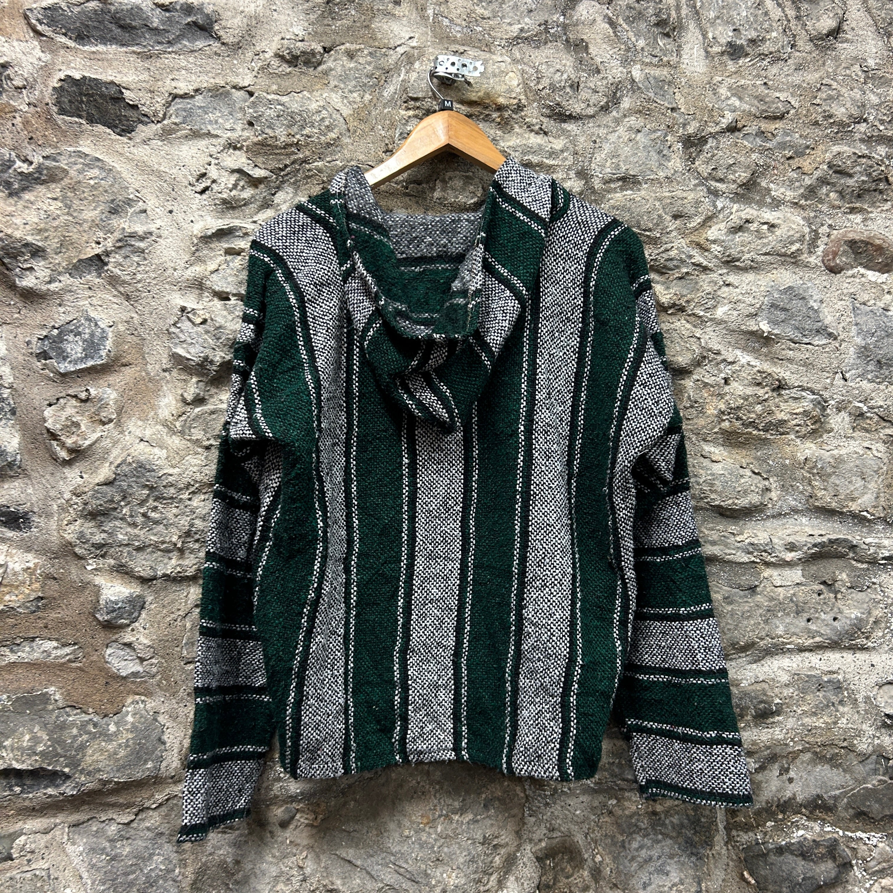 Product details: Classic Baja/jerga pullover hoodie in dark forest green, heather grey and black striped woven fabric. Features a loose V-notch neckline with braided drawstrings, roomy fit, and a front kangaroo pocket with contrast flap detail; raw/overlocked seam finishing typical of Baja hoodies. Brand: .| Label Size | |