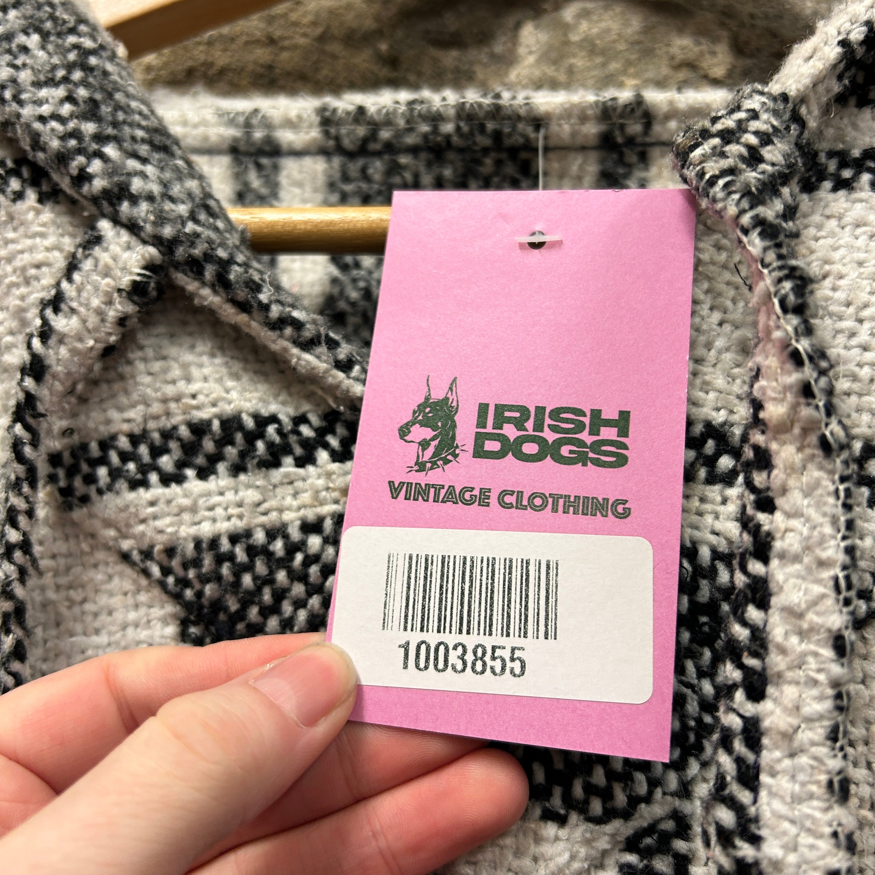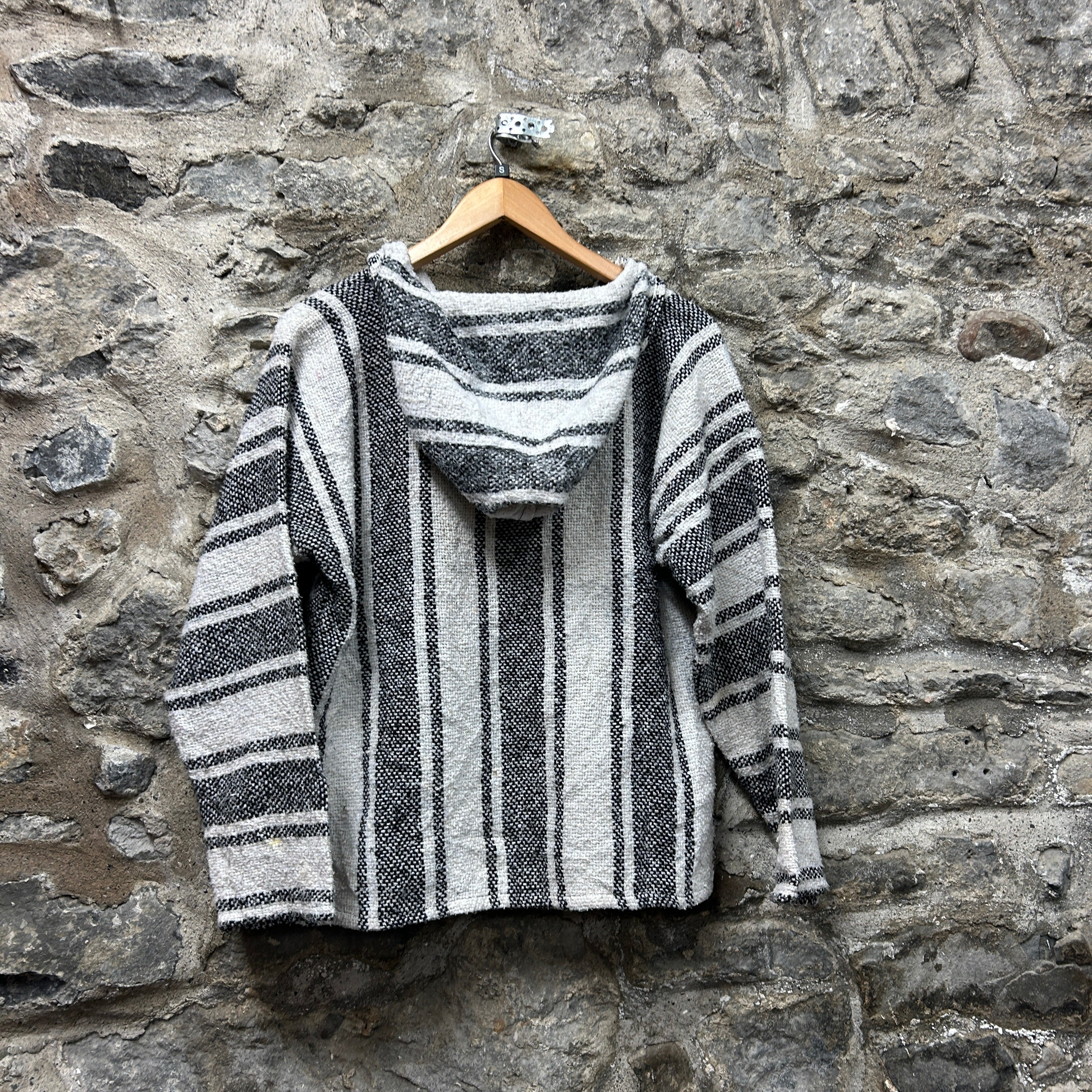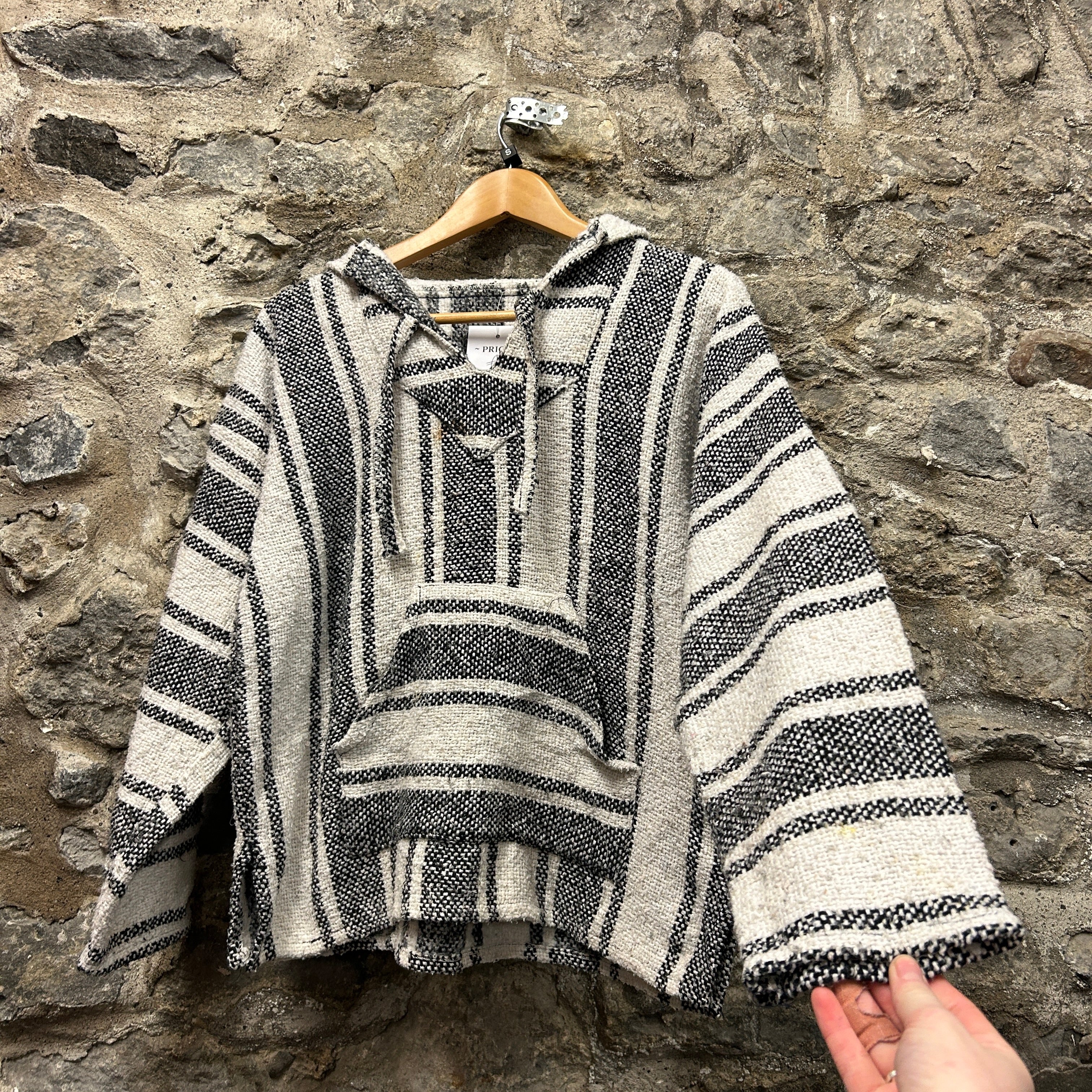 Product details: Woven baja/jerga-style pullover hoodie in black/cream/grey striped pattern with kangaroo pocket, v-notch split neckline and drawstring hood. Boxy fit with wide sleeves and textured, blanket-like weave. Brand: .| Label Size | |