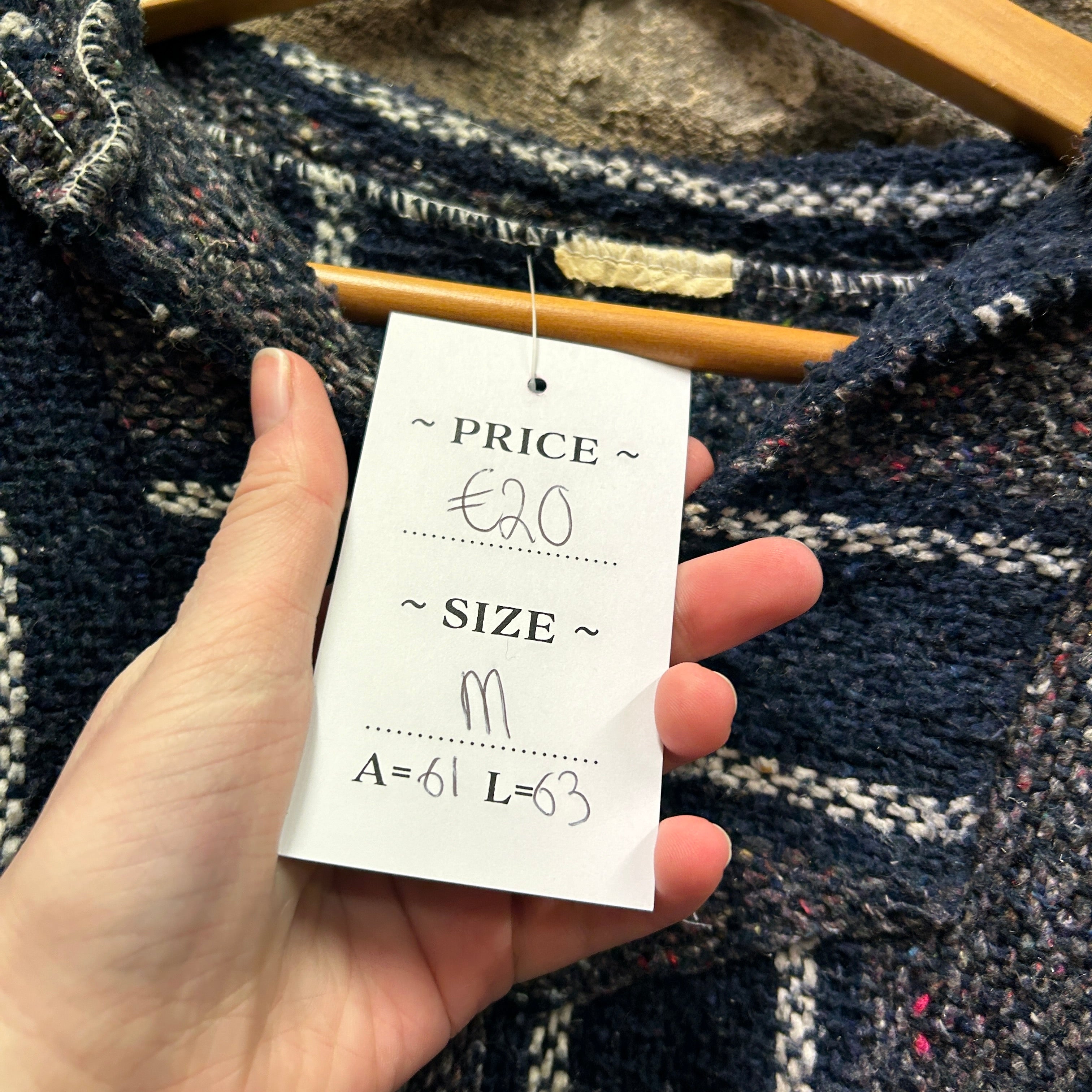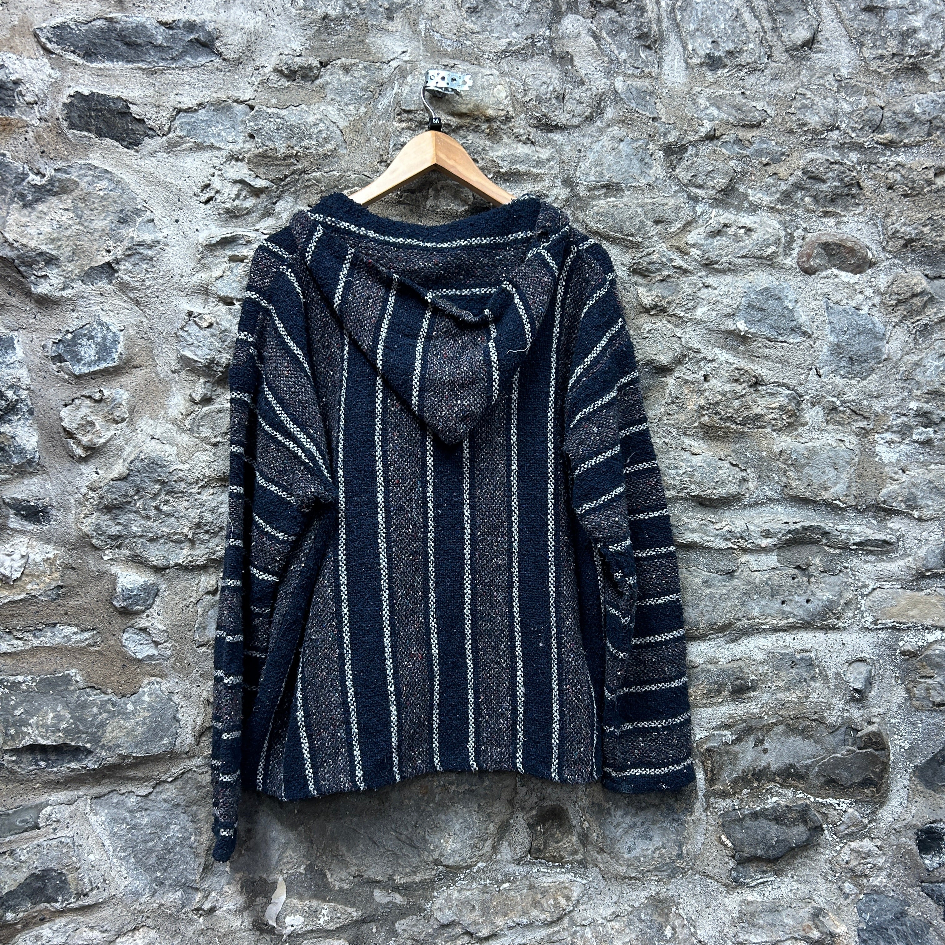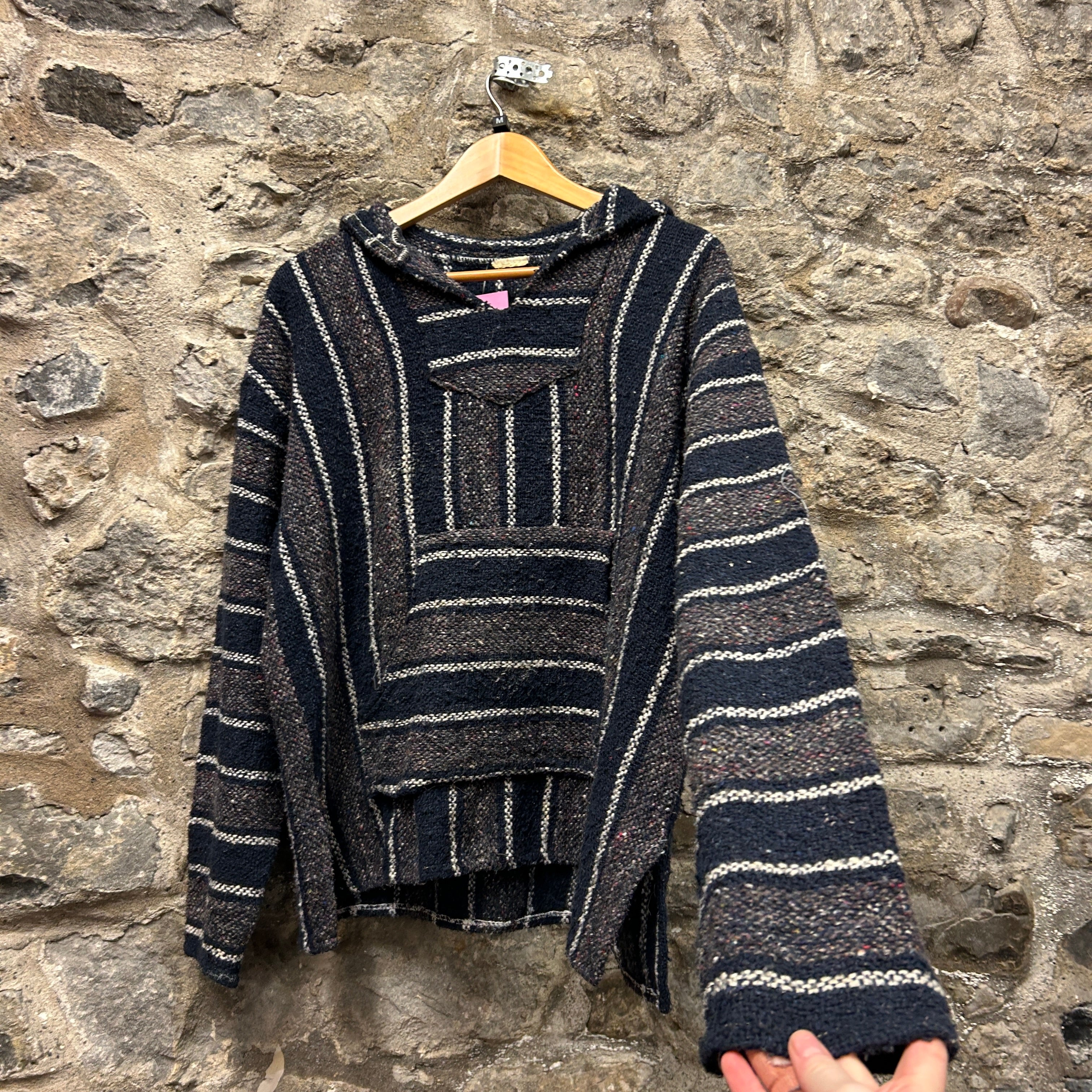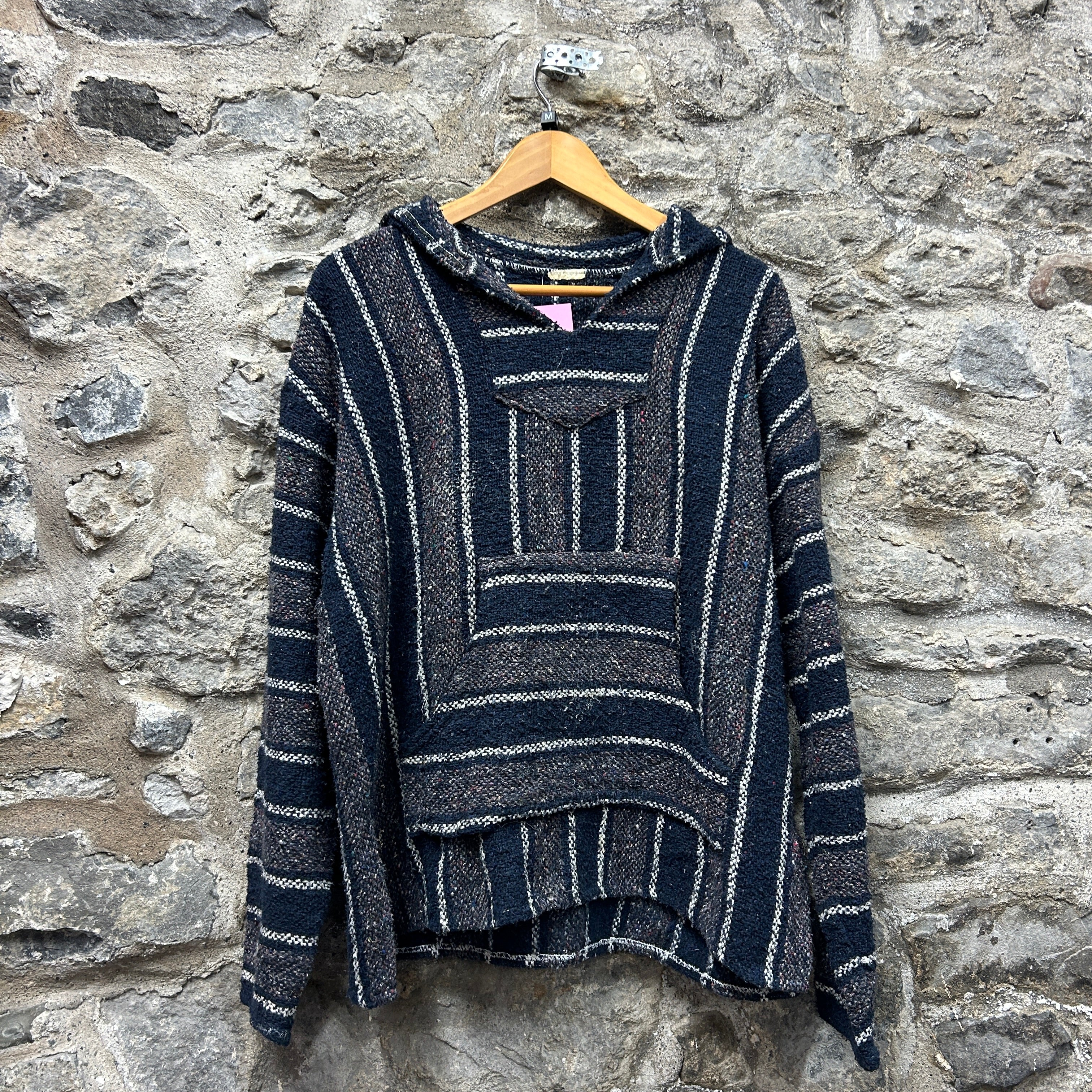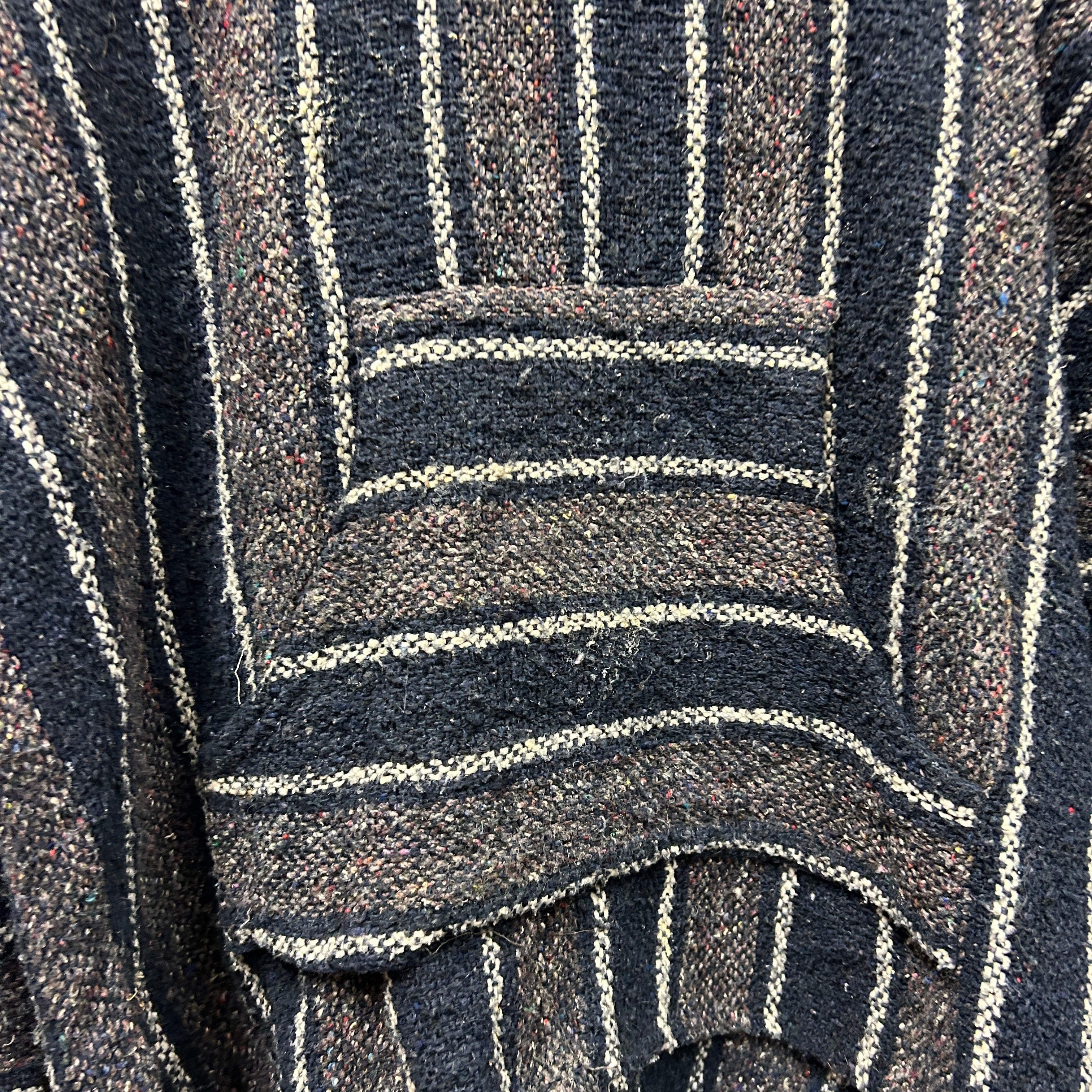 Product details: Woven Baja-style pullover hoodie in dark navy/charcoal with cream vertical and horizontal stripe pattern and subtle multicolor flecking. Features a roomy hood, V-notch neck opening, and large front kangaroo pocket; textured, blanket-like fabric with raw/serged seam finishing visible at neckline. Brand: .| Label Size | |