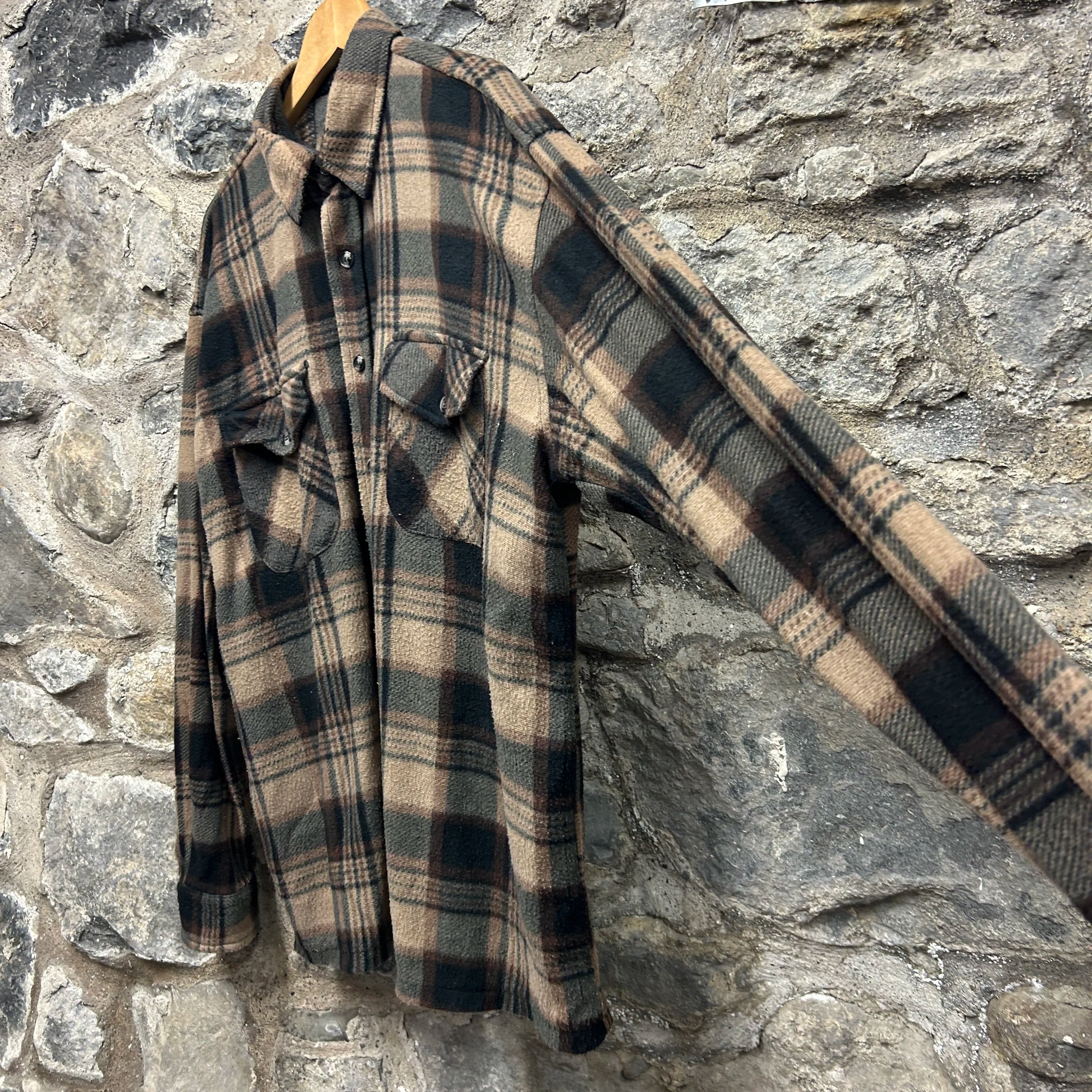 Product details: Brown and black plaid with tan highlights, metal snap buttons, twin chest flap pockets, classic collar. Fabric has a textured brushed flannel appearance and exhibits some minor natural wear consistent with vintage pieces. Brand: Bill Gates.| Label Size | |