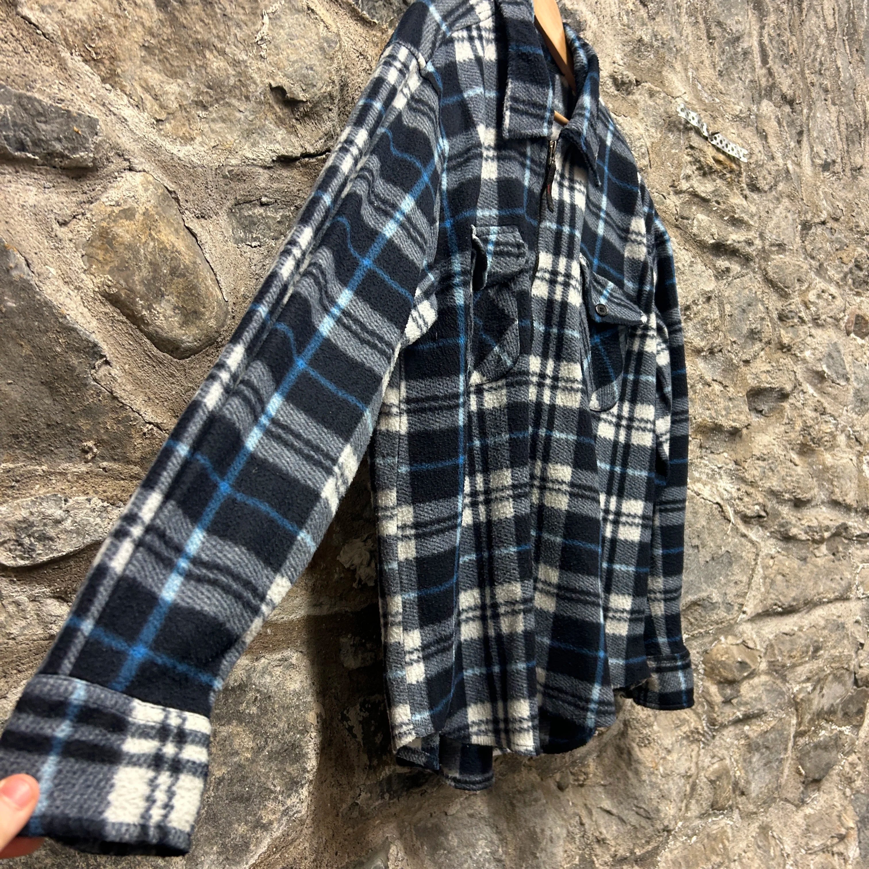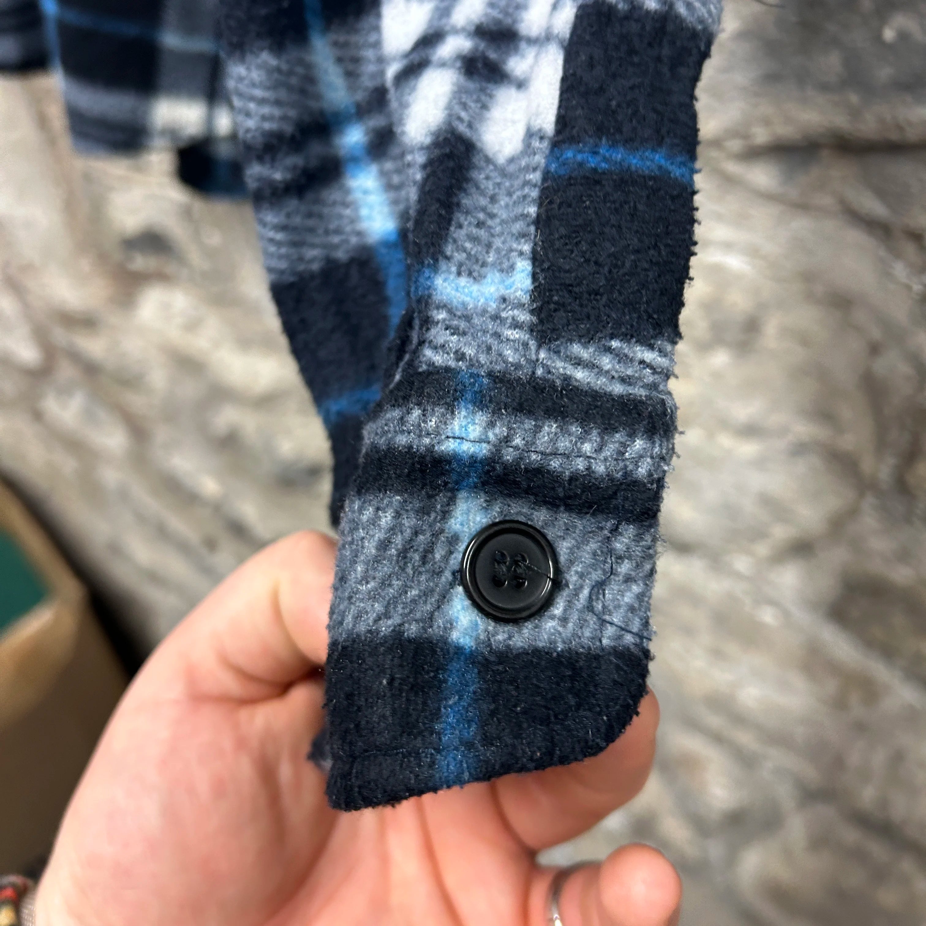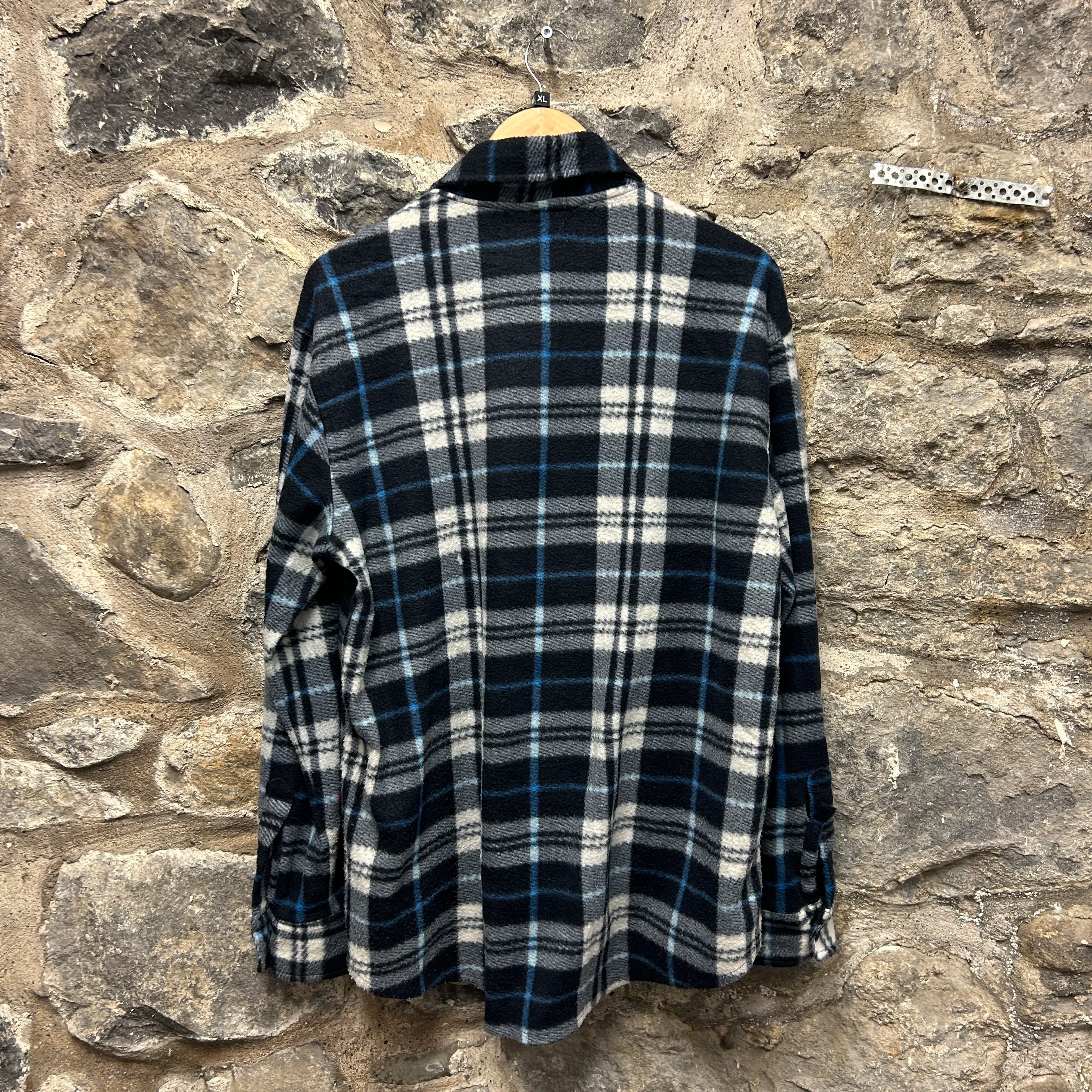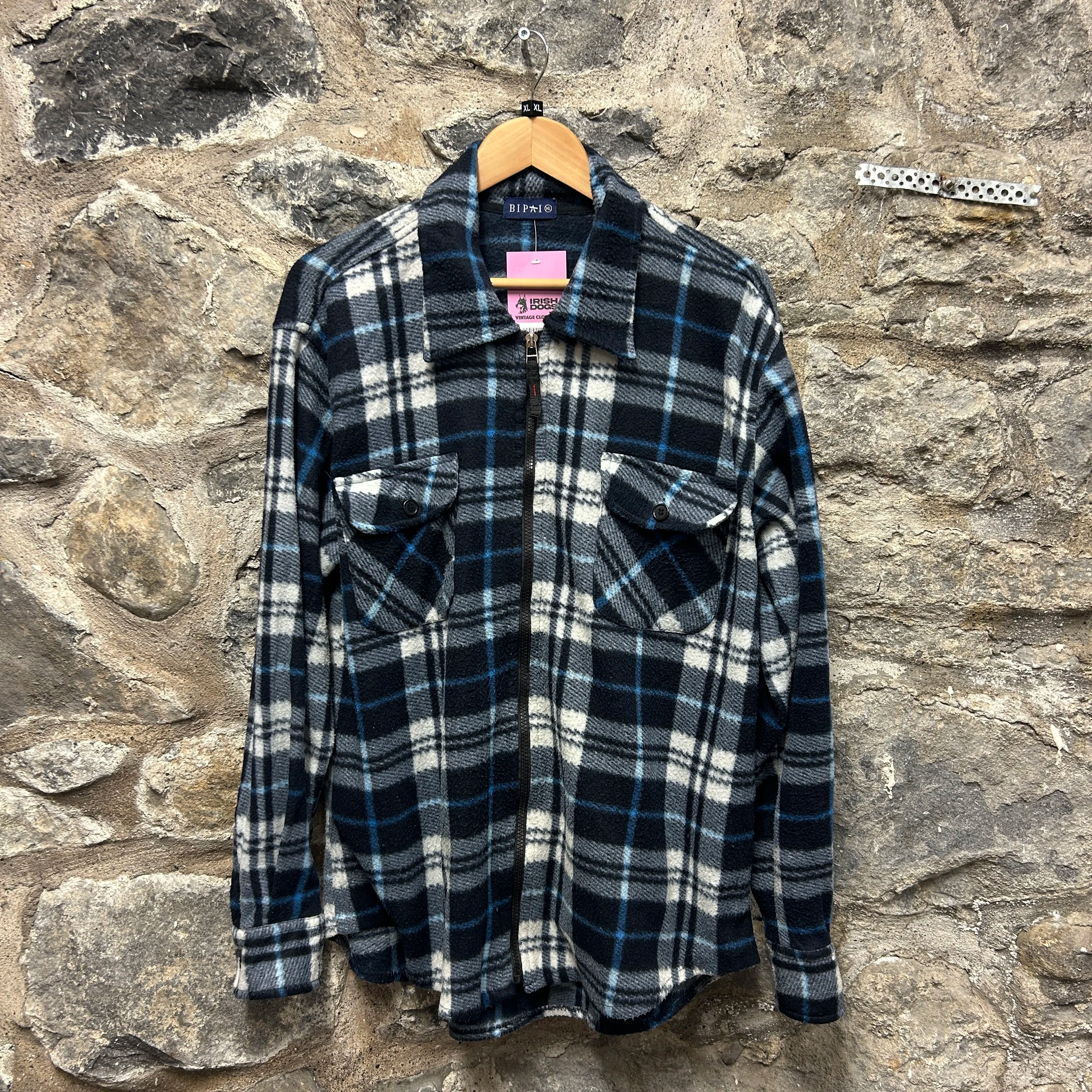 Product details: Black, white, and blue tartan plaid, full zip front, buttoned cuffs, two chest flap pockets, made from soft brushed flannel. Size XL. Brand: Bipai.| Label Size | |