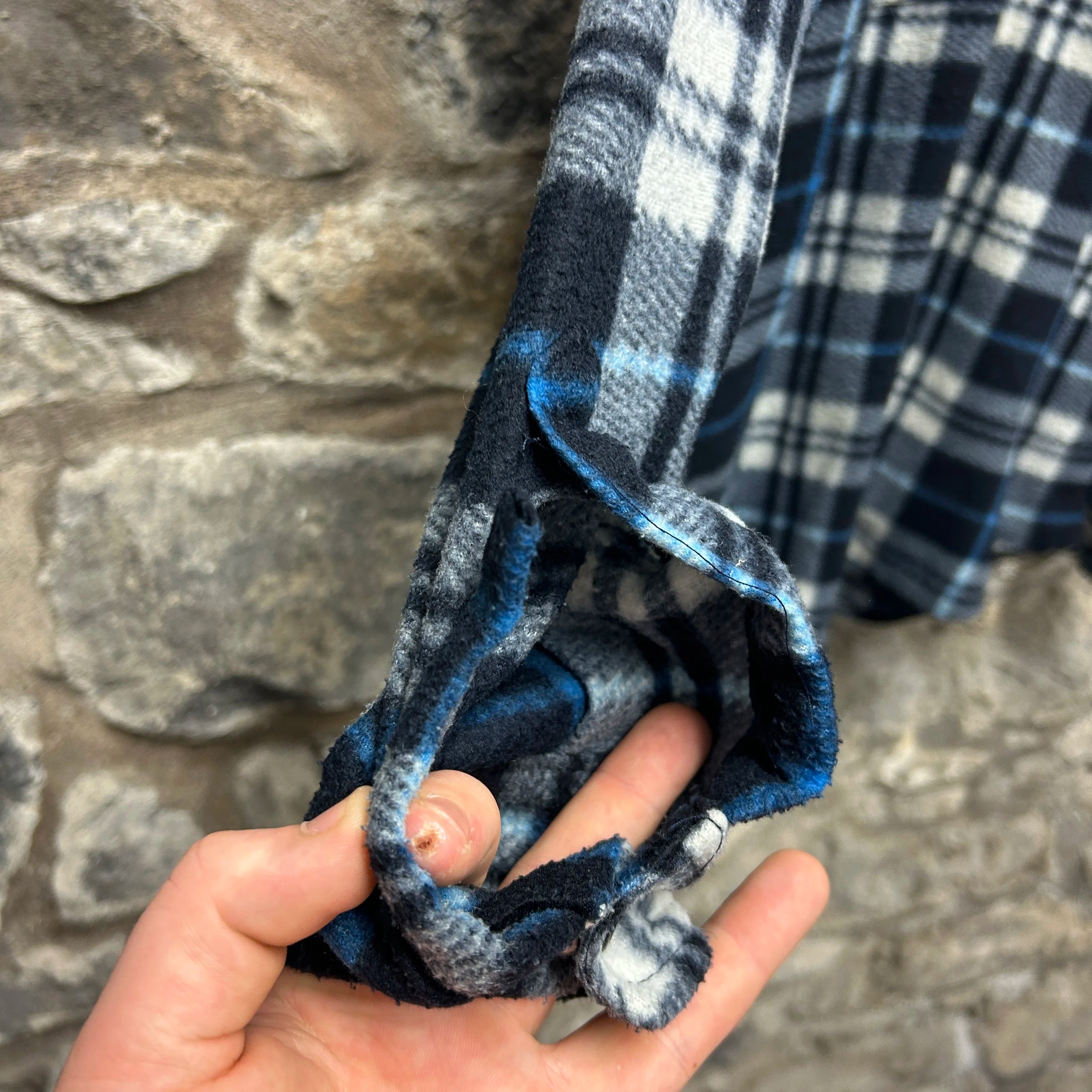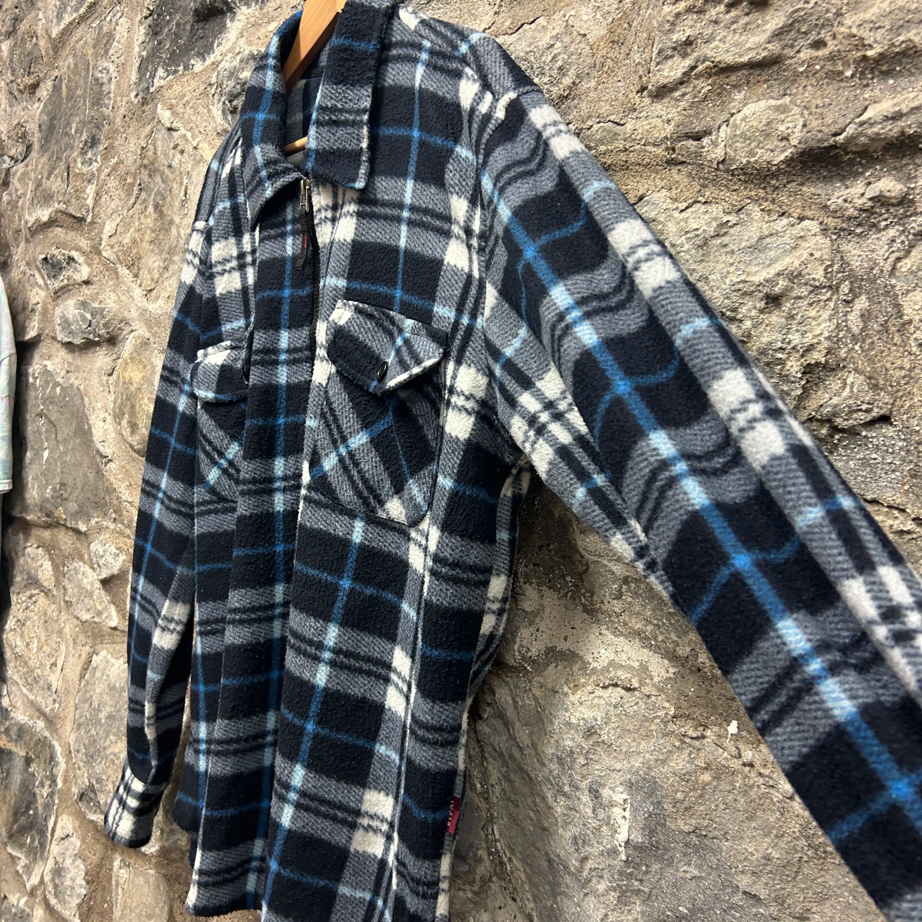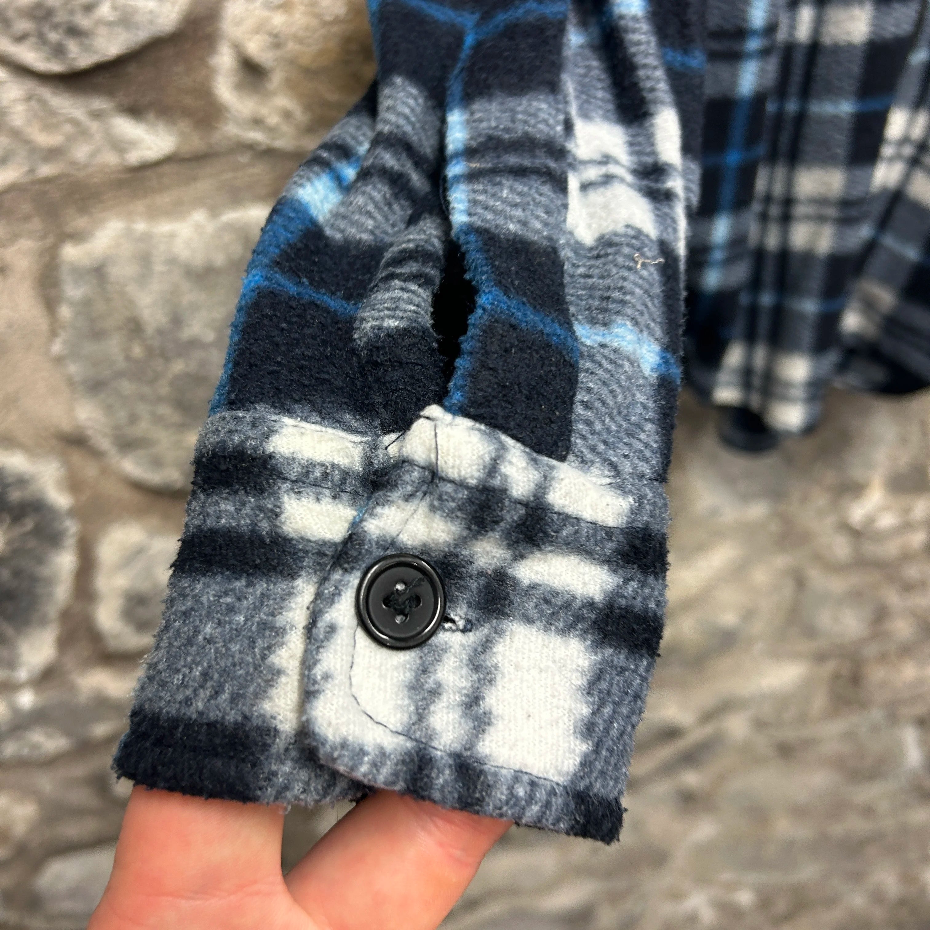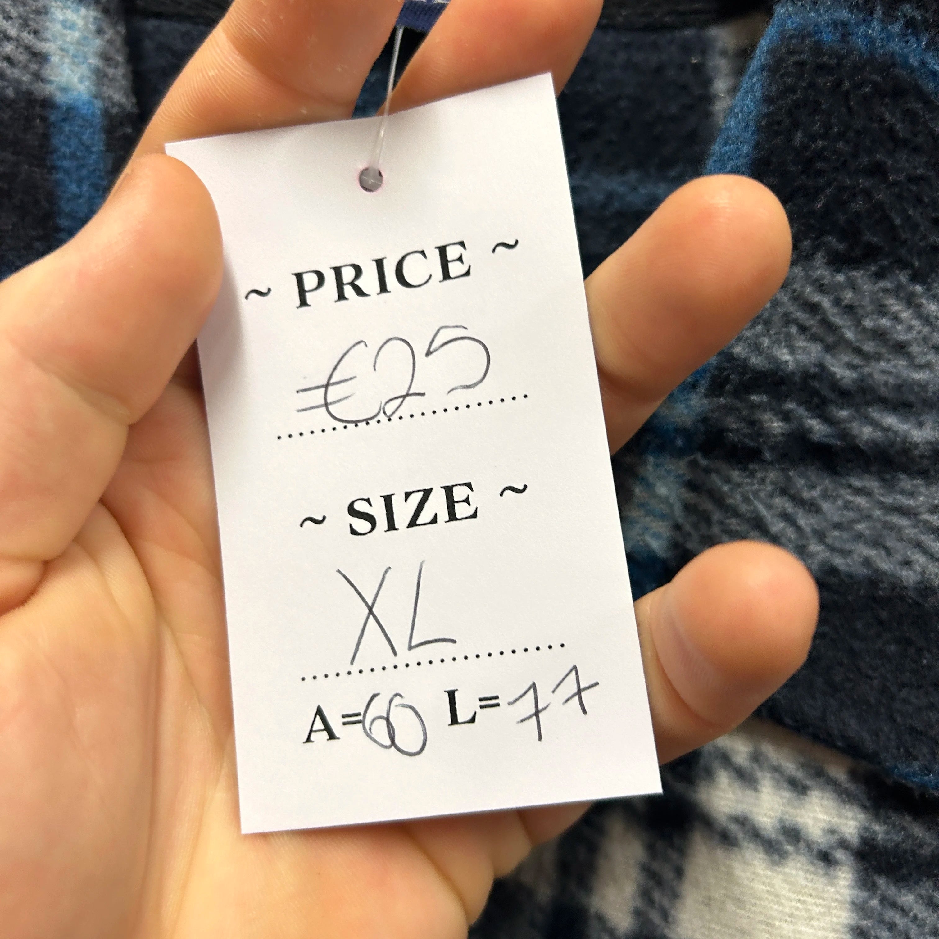Product details: Black, white, and blue tartan plaid, full zip front, buttoned cuffs, two chest flap pockets, made from soft brushed flannel. Size XL. Brand: Bipai.| Label Size | |