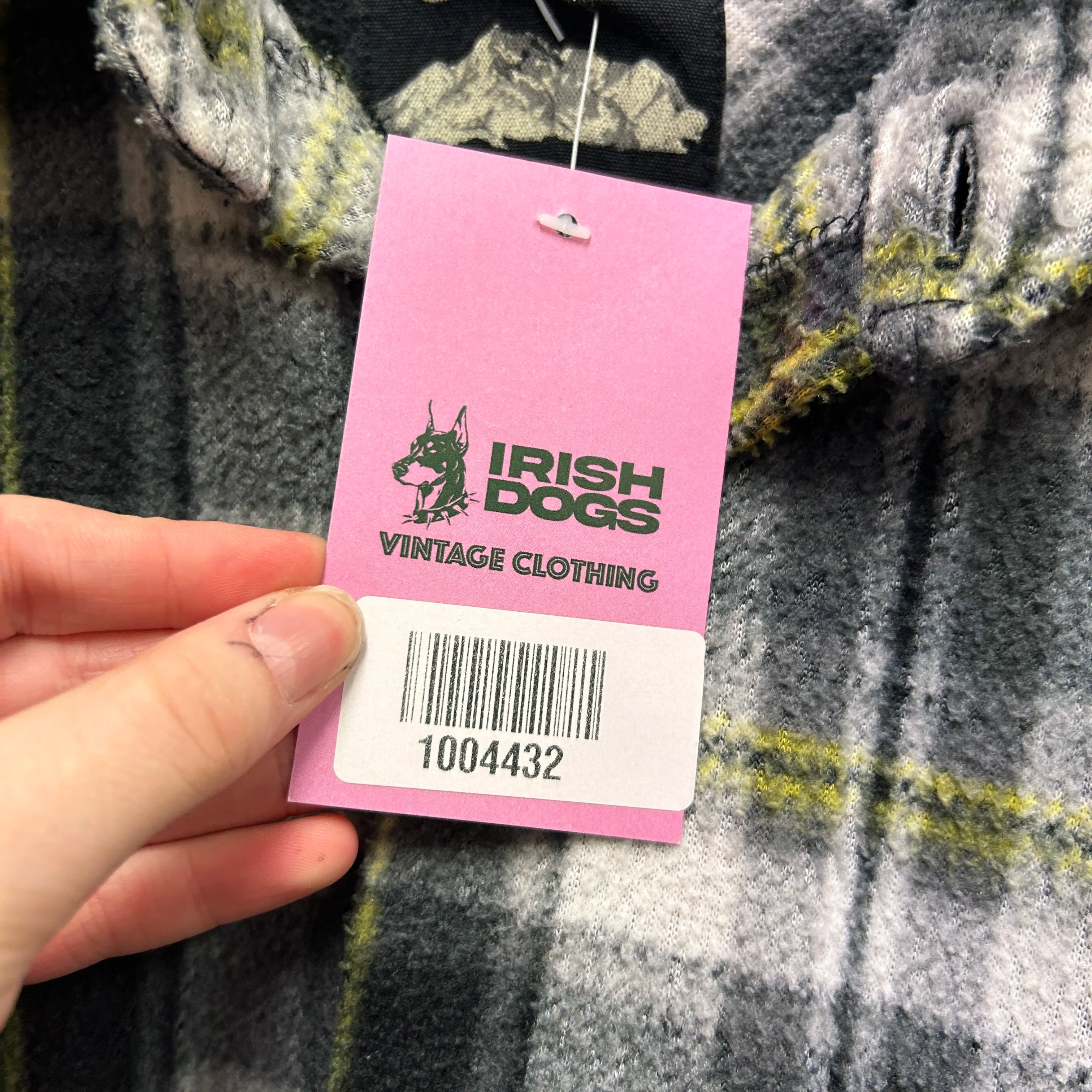 Product details: Green, white, and yellow plaid flannel; two front flap pockets with buttons; buttoned cuffs; classic shirt collar; black buttons; soft brushed texture. Brand: Eward.| Label Size | |