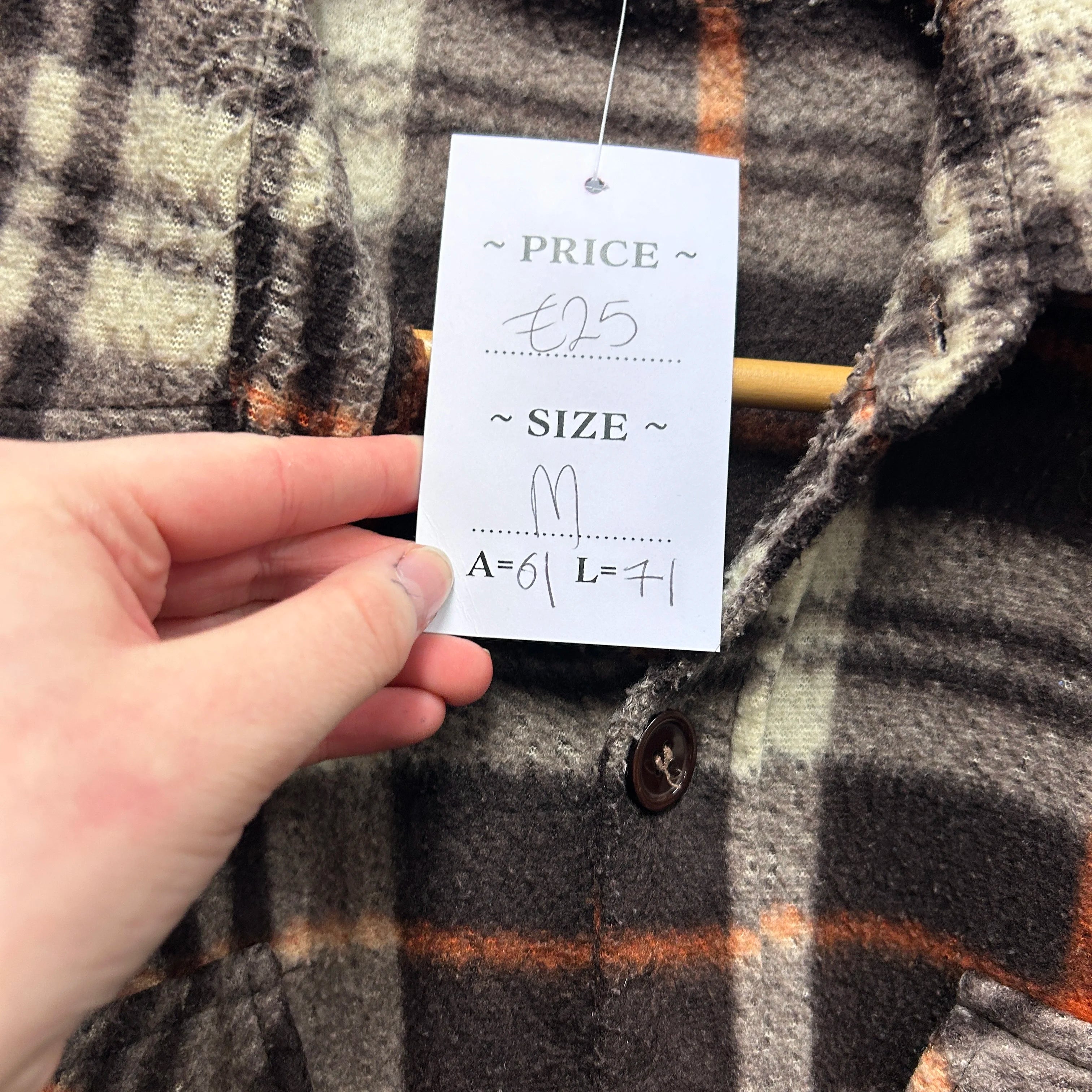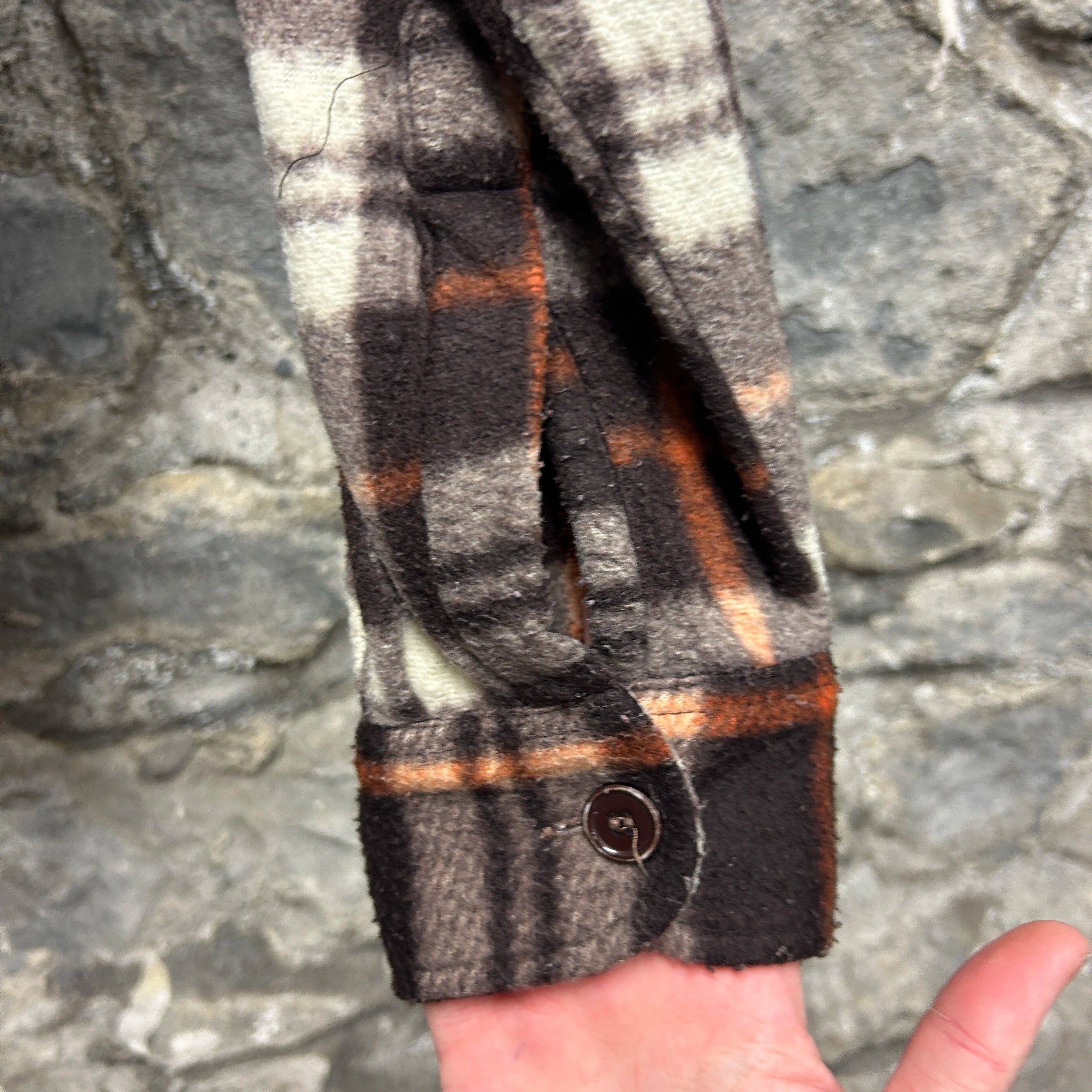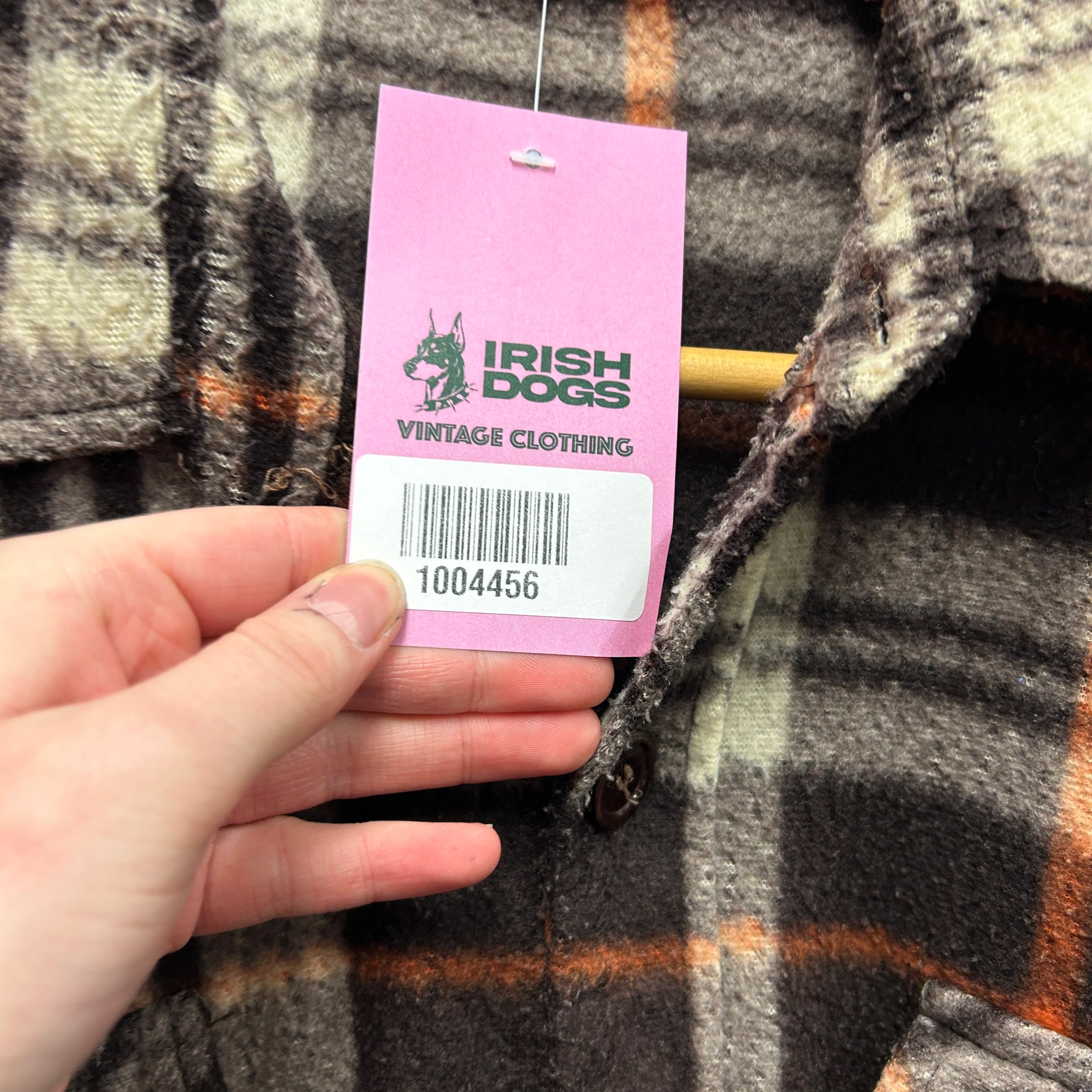 Product details: Brown plaid flannel shirt with orange and cream stripes, button-front, two chest flap pockets, buttoned cuffs. Material has a soft, brushed feel. Tag from Irish Dogs Vintage Clothing. Size M (A=61/L=71 as per tag). Brand: Irish Dogs Vintage Clothing.| Label Size | |