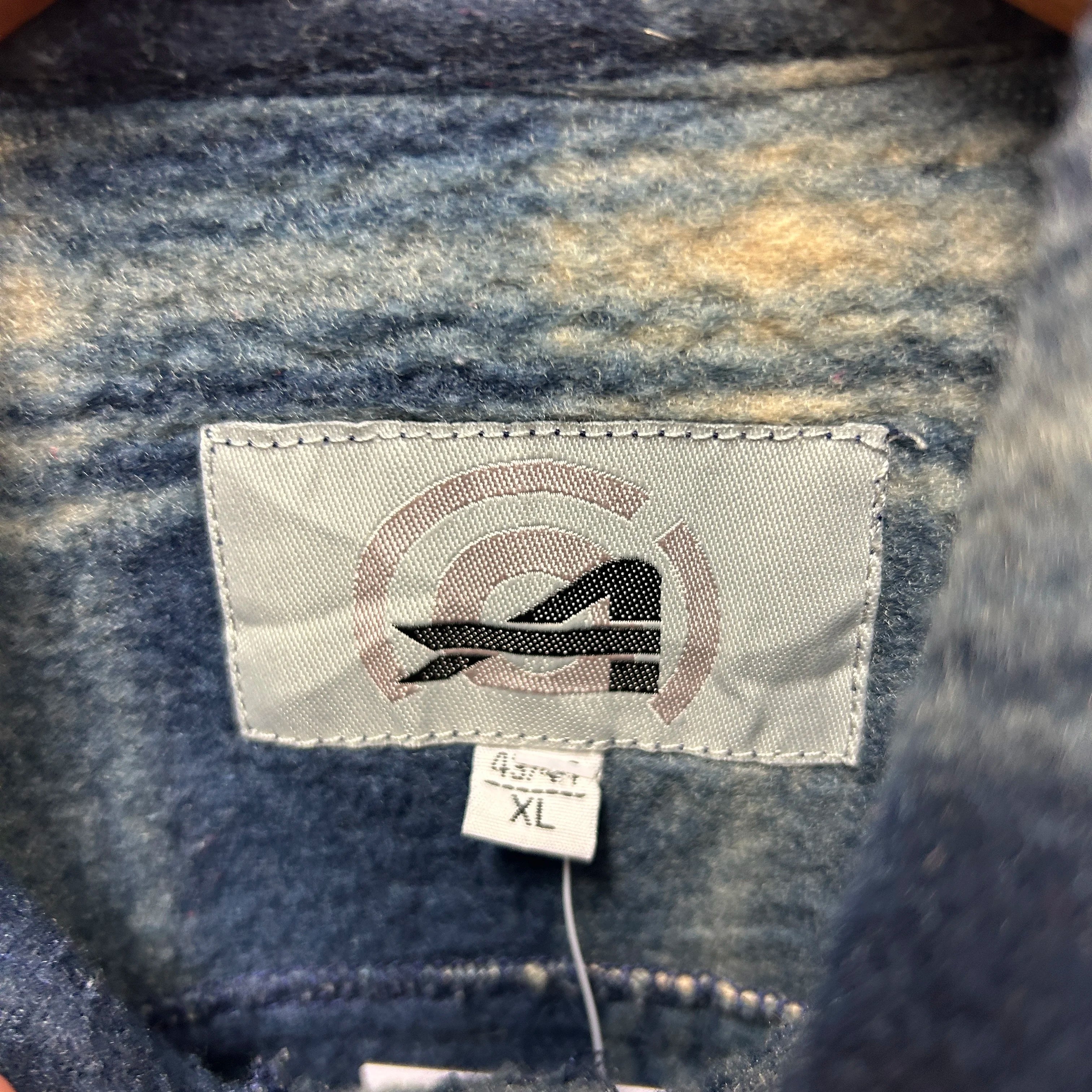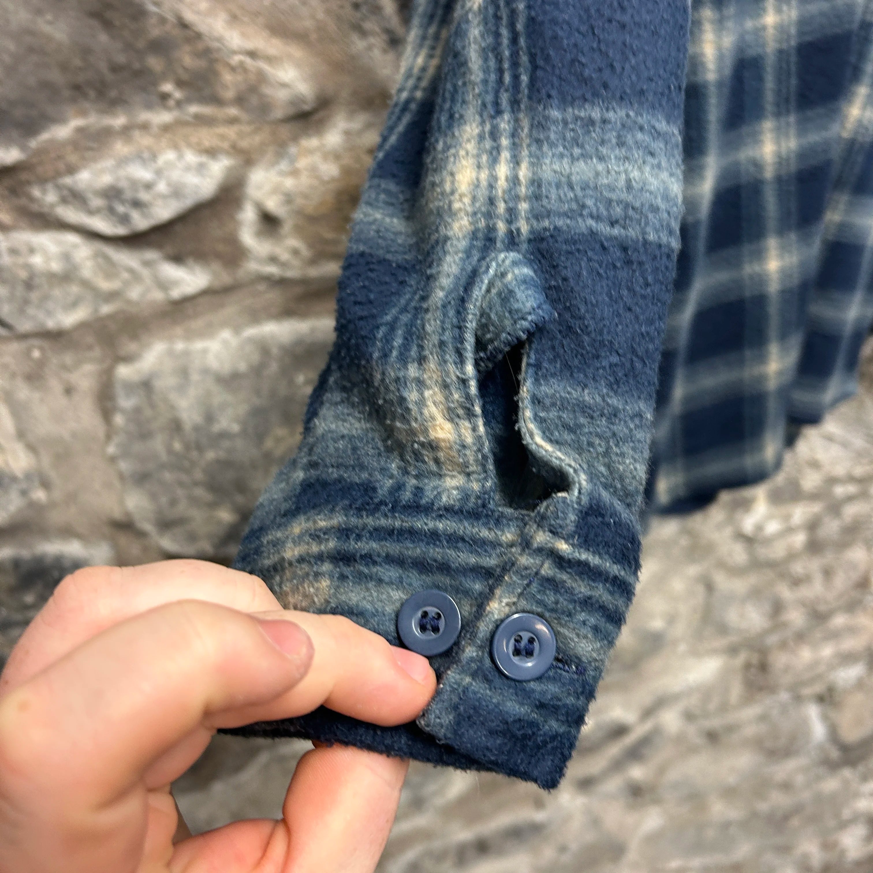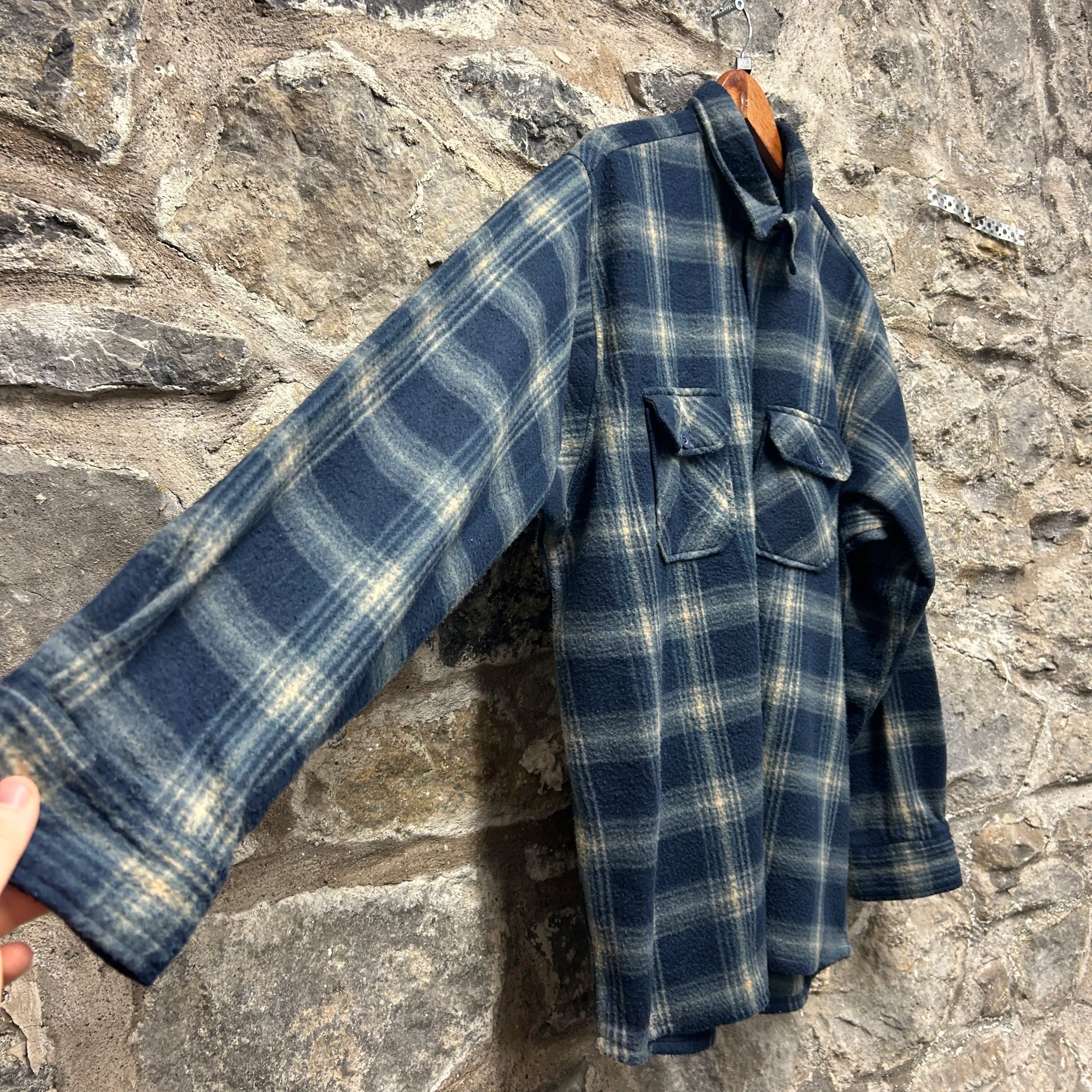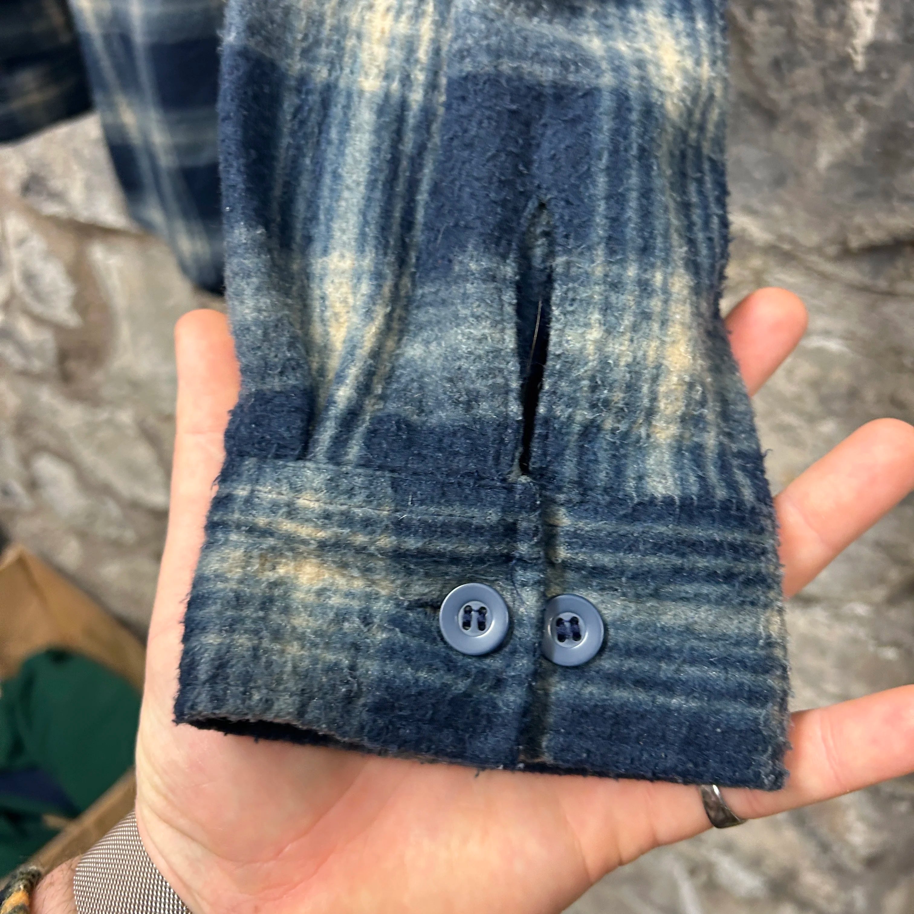 Product details: Navy and beige check pattern, button front, dual flap chest pockets, adjustable button cuffs, brushed flannel texture. Irish Dogs vintage tag, XL size. Brand: Irish Dogs Vintage Clothing.| Label Size | |