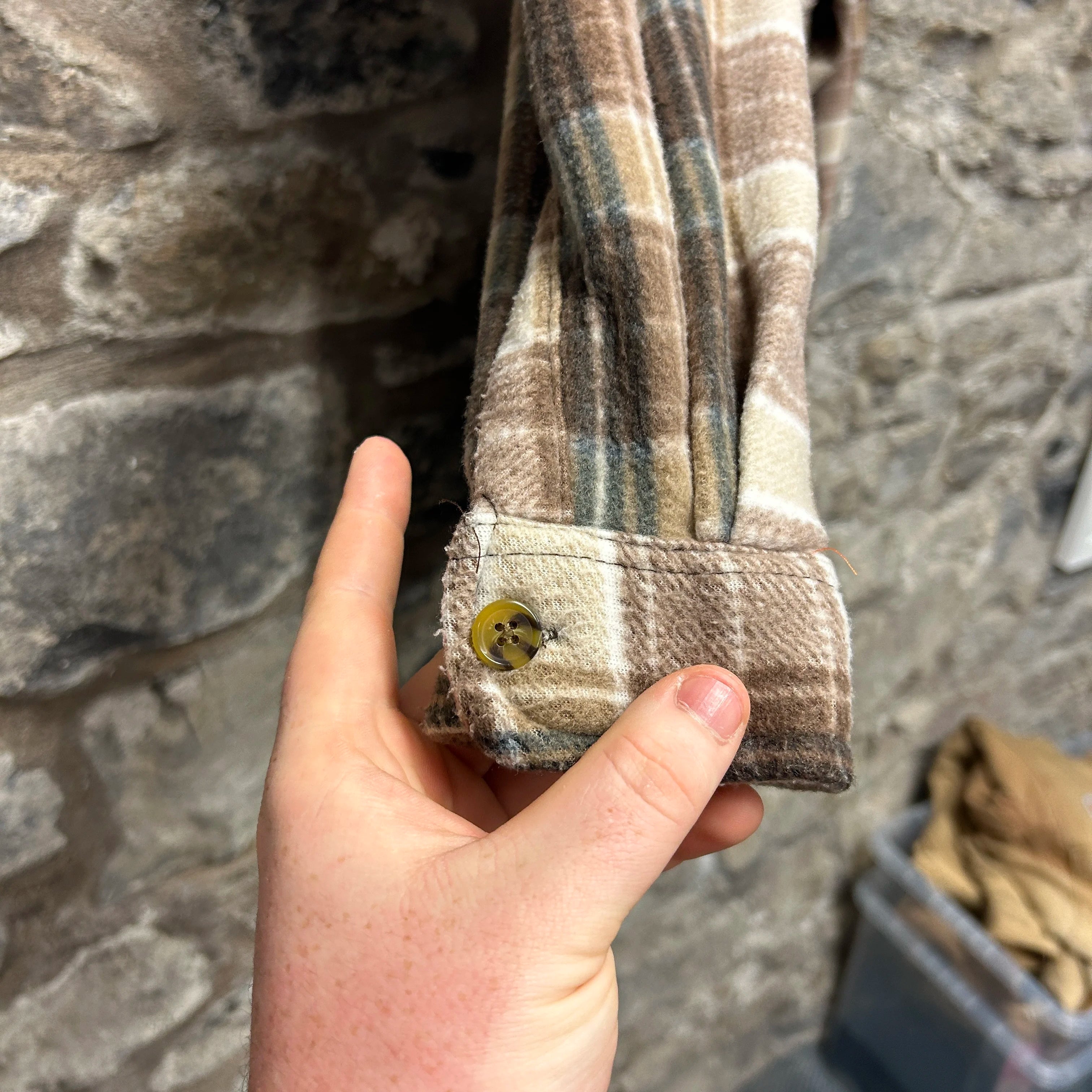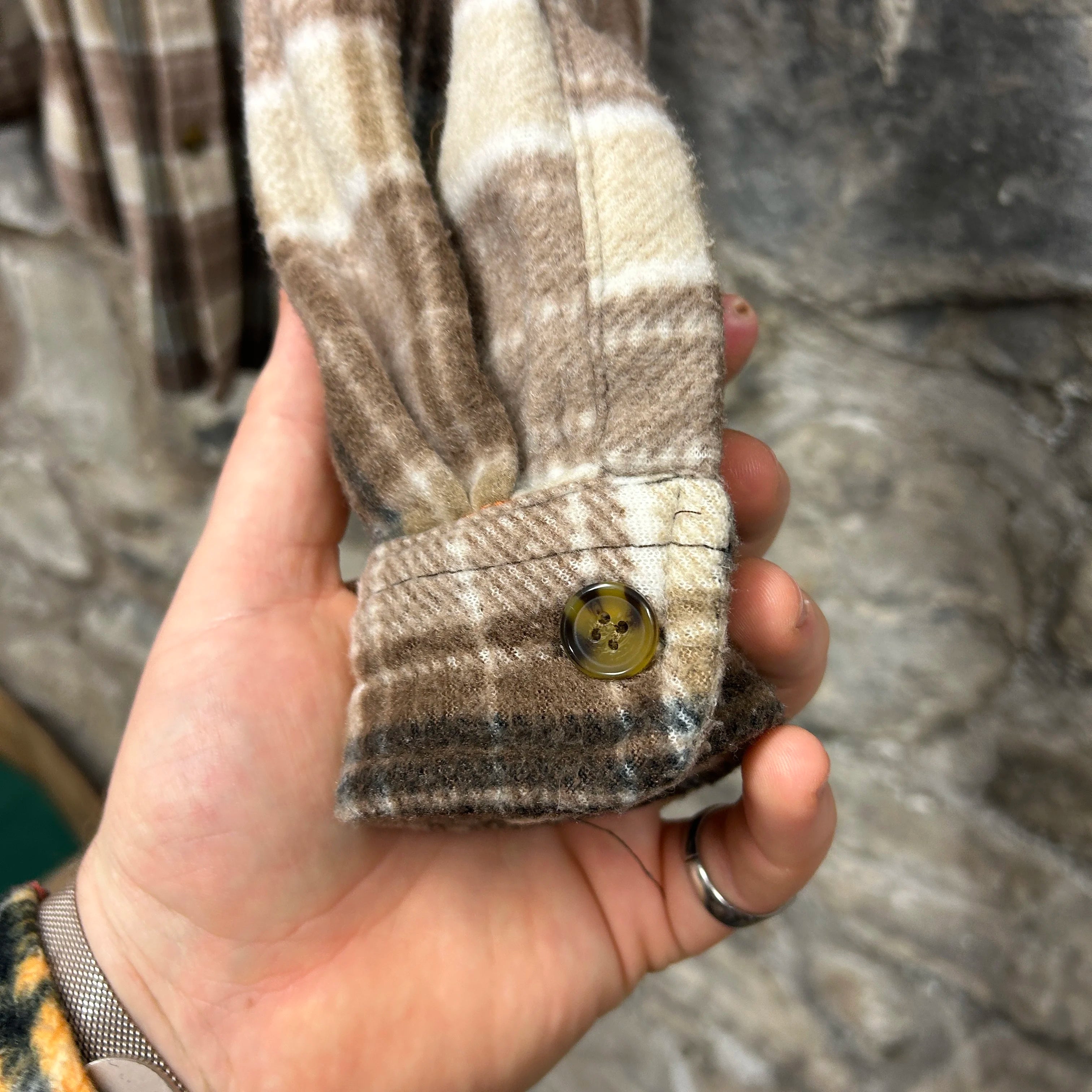 Product details: Button-down front, single chest pocket with button closure, plaid pattern with brown, beige, and cream tones, tortoiseshell buttons, buttoned cuffs, tag from 'Lowes Basics', brushed/flannel fleece texture. Brand: Lowes Basics.| Label Size | |
