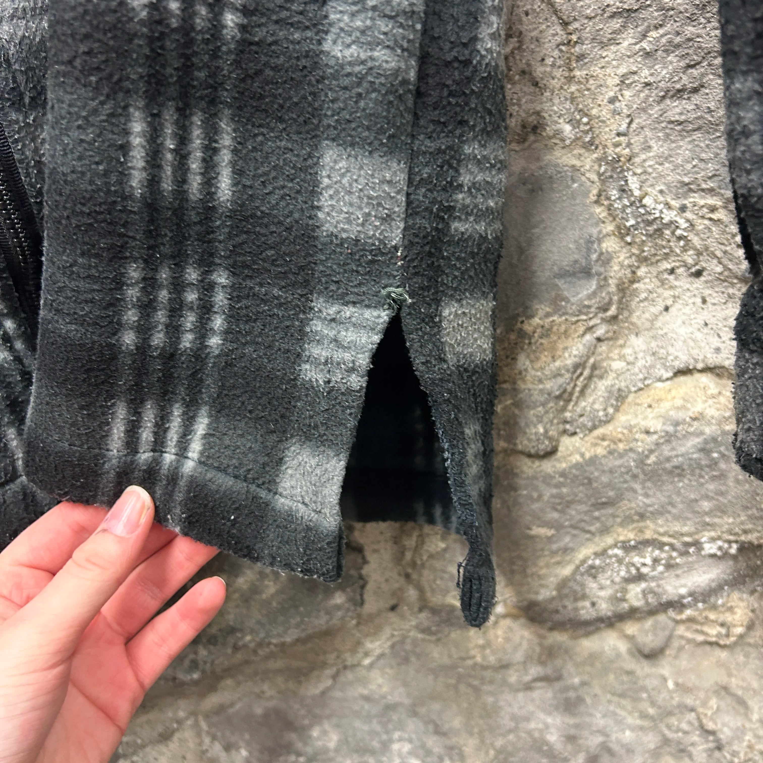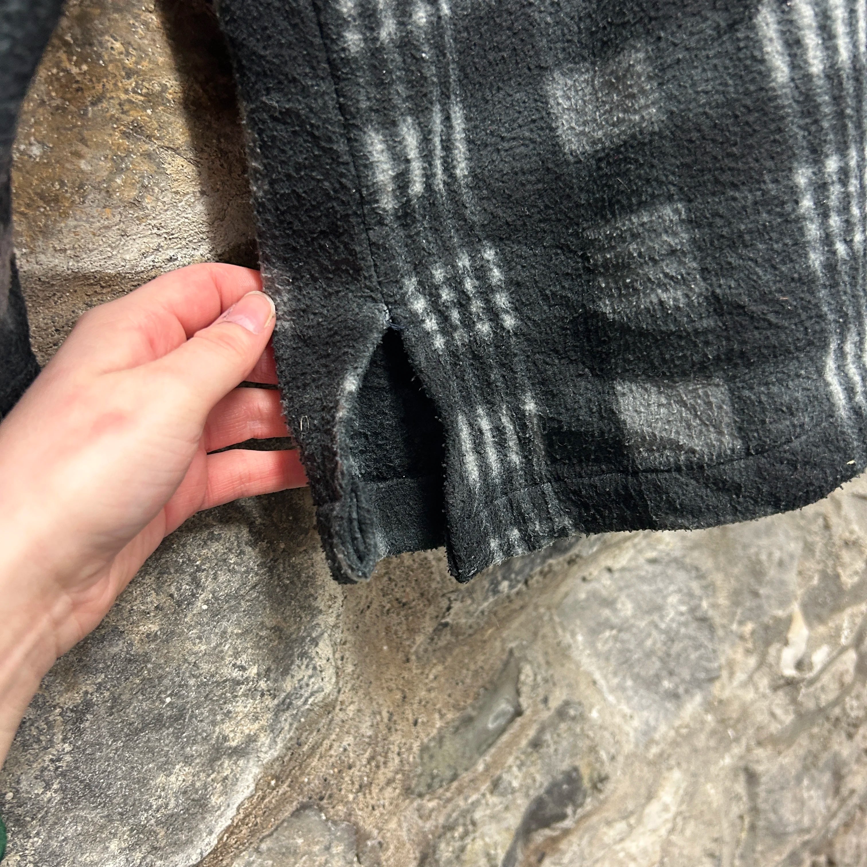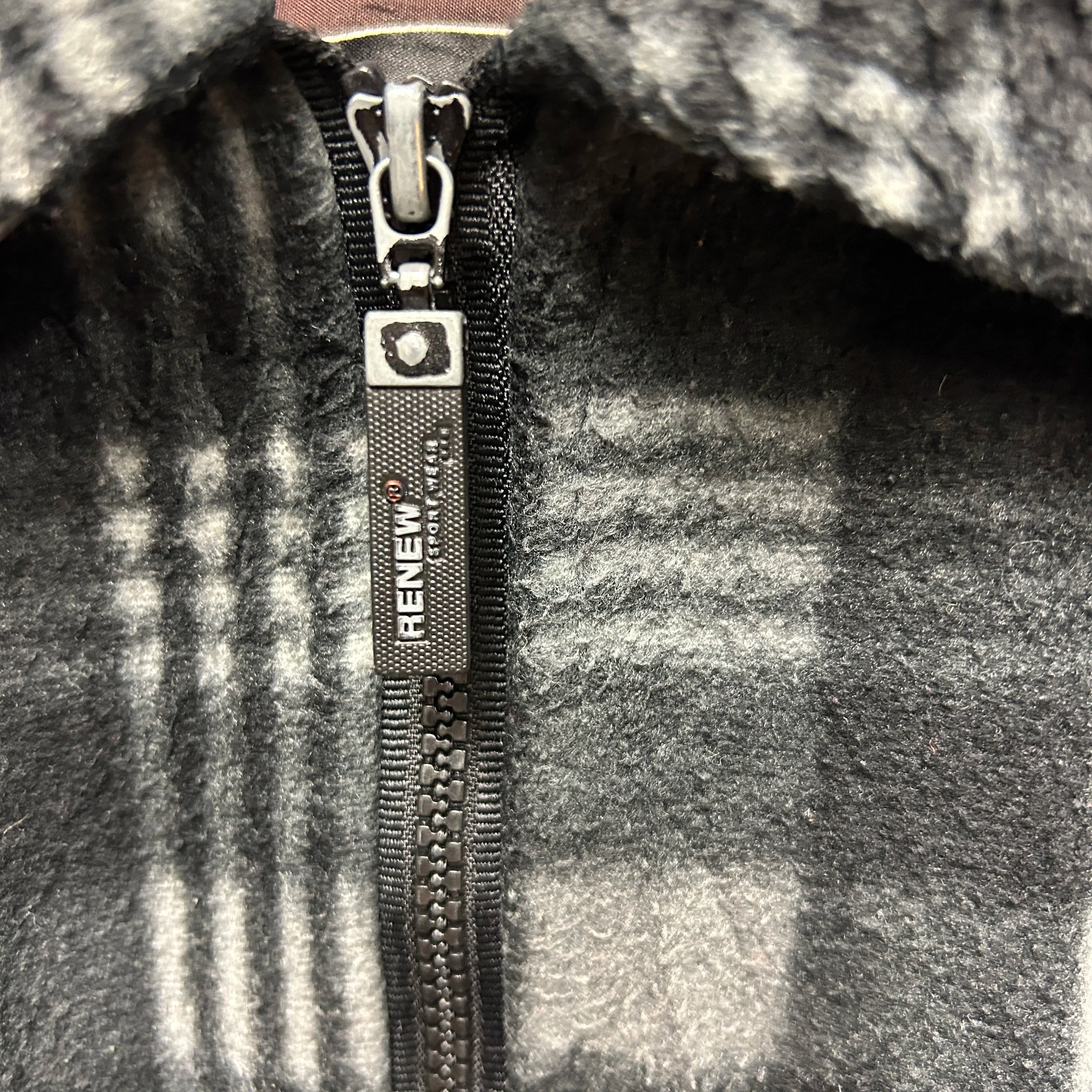 Product details: Black and gray plaid, fleece fabric, full zip front, two buttoned chest pockets, button cuffs, side hem slits, large collar, relaxed fit. Brand: Renew.