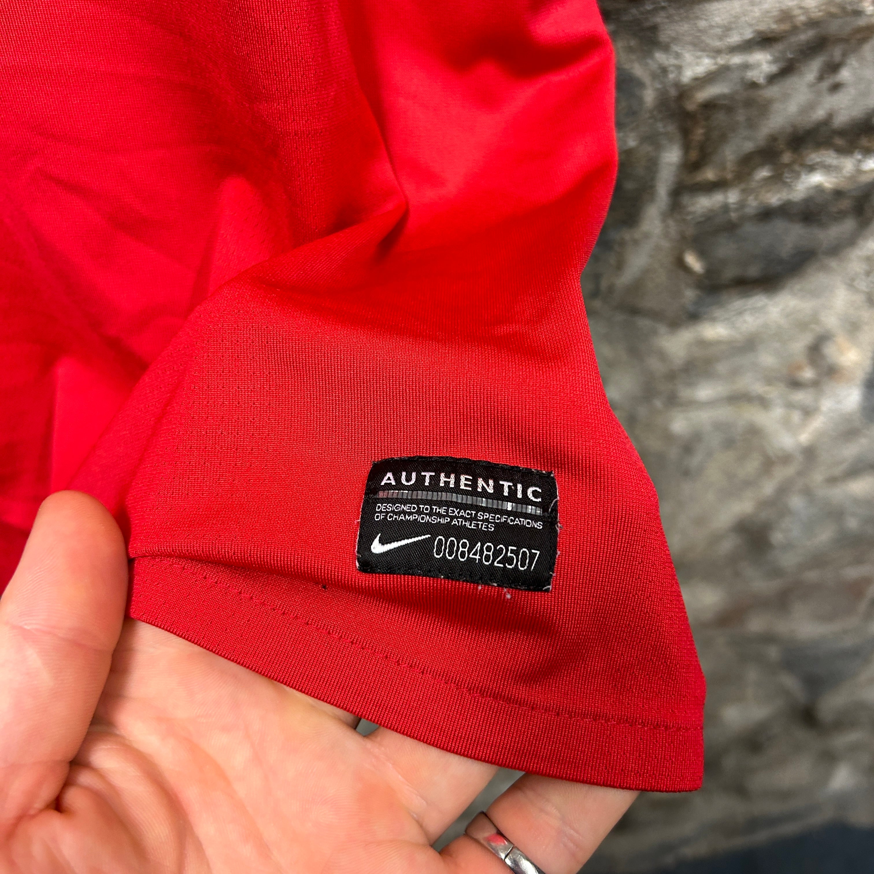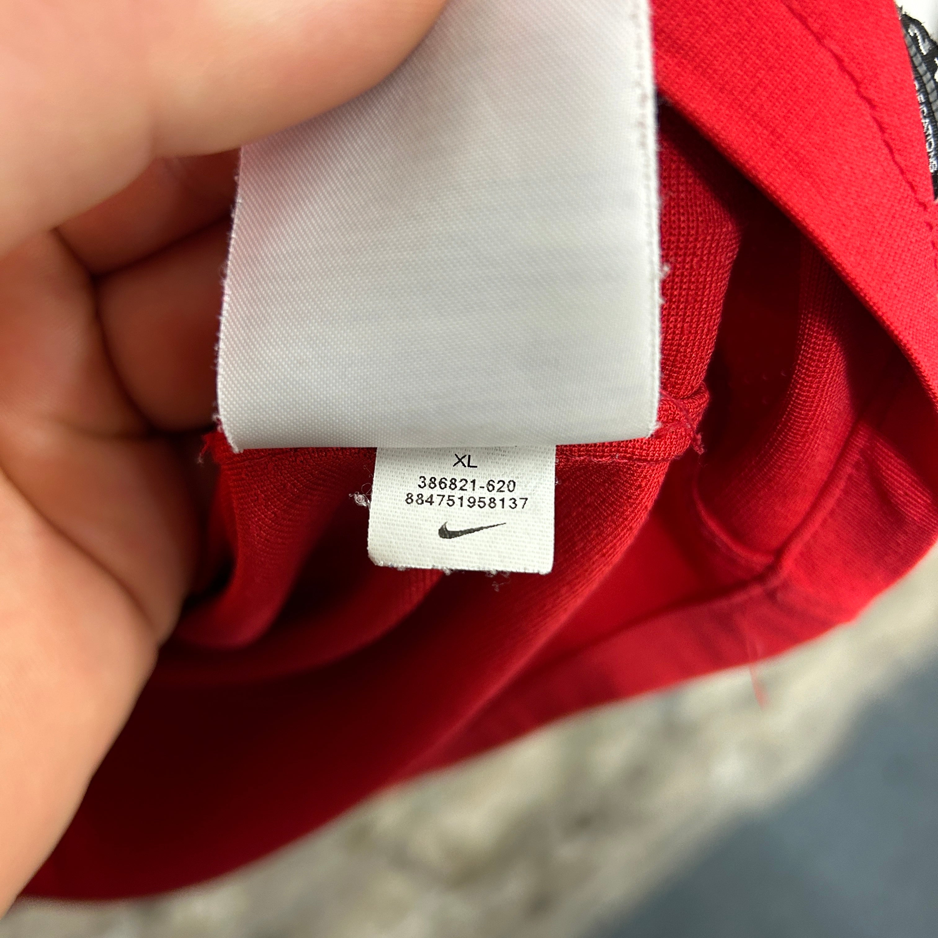 Product details: Nike Arsenal home football shirt in classic red with white sleeves and white ribbed crewneck. Features embroidered Nike Swoosh on chest, embroidered Arsenal crest, tonal 'Fly Emirates' sponsor print across front, and 'Dri-FIT' embroidery near hem. Black Nike 'AUTHENTIC' jock tag at lower front with code 008482507; back neck has 'ARSENAL' text. Lightweight performance knit typical of early 2010s era kits. Brand: Nike.| Label Size | |