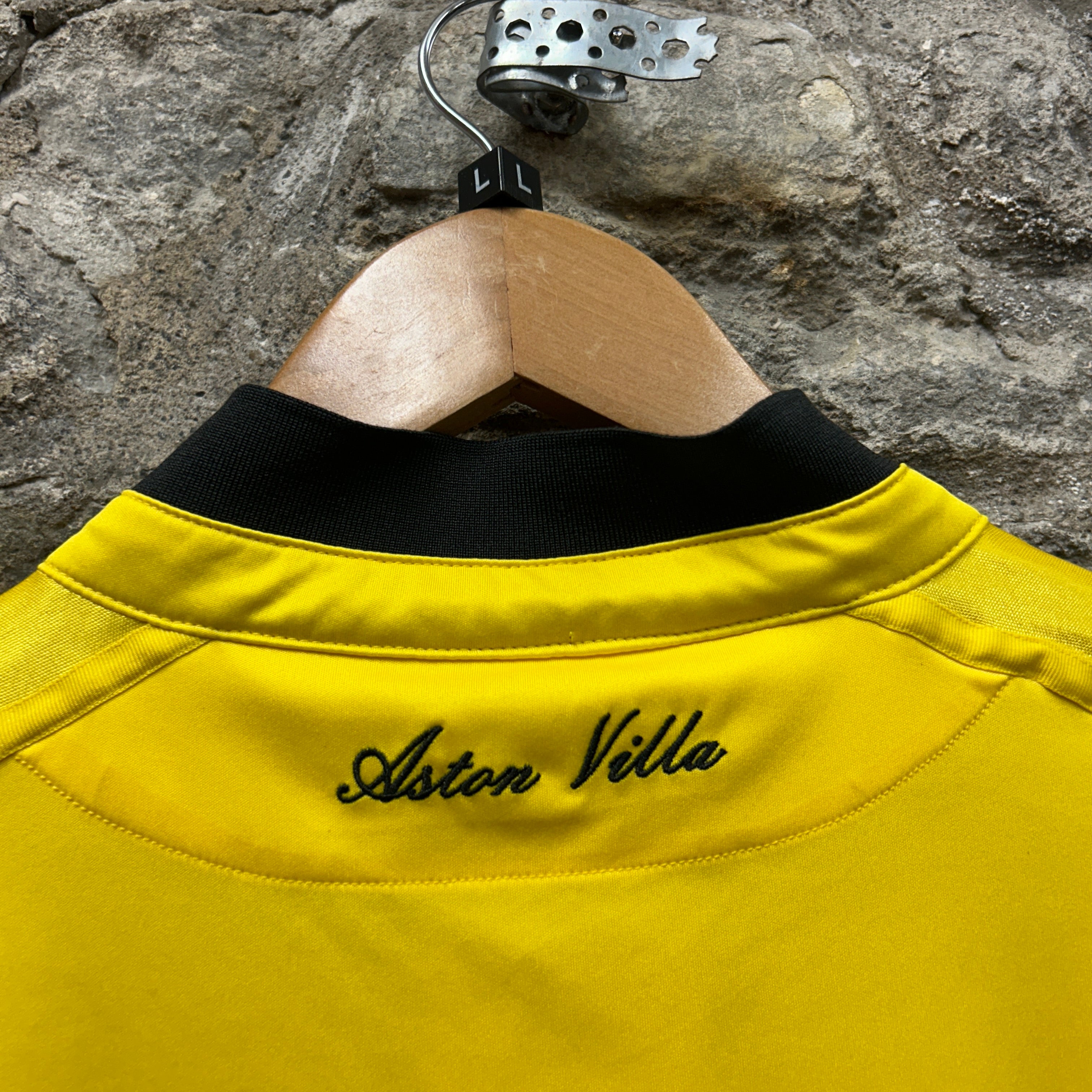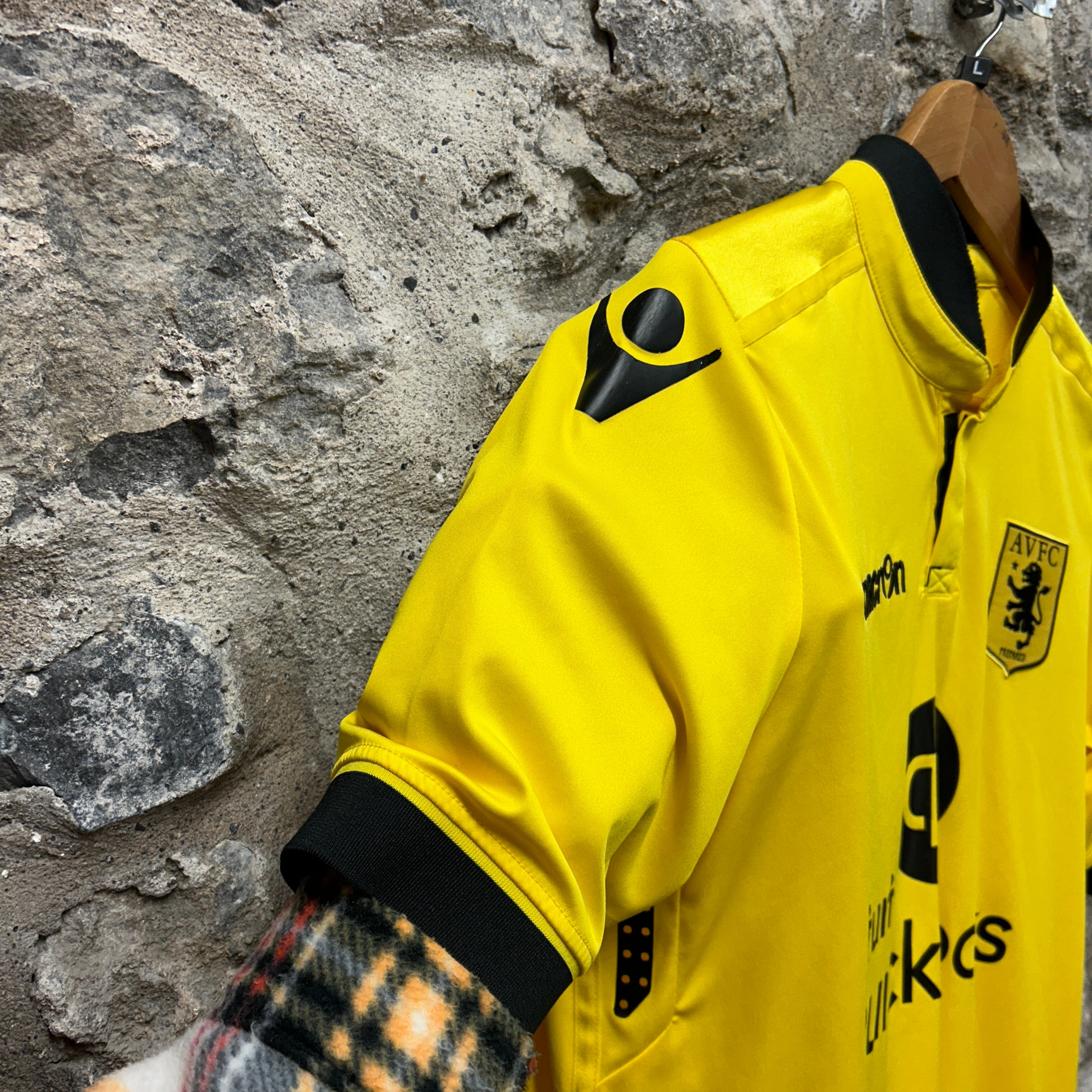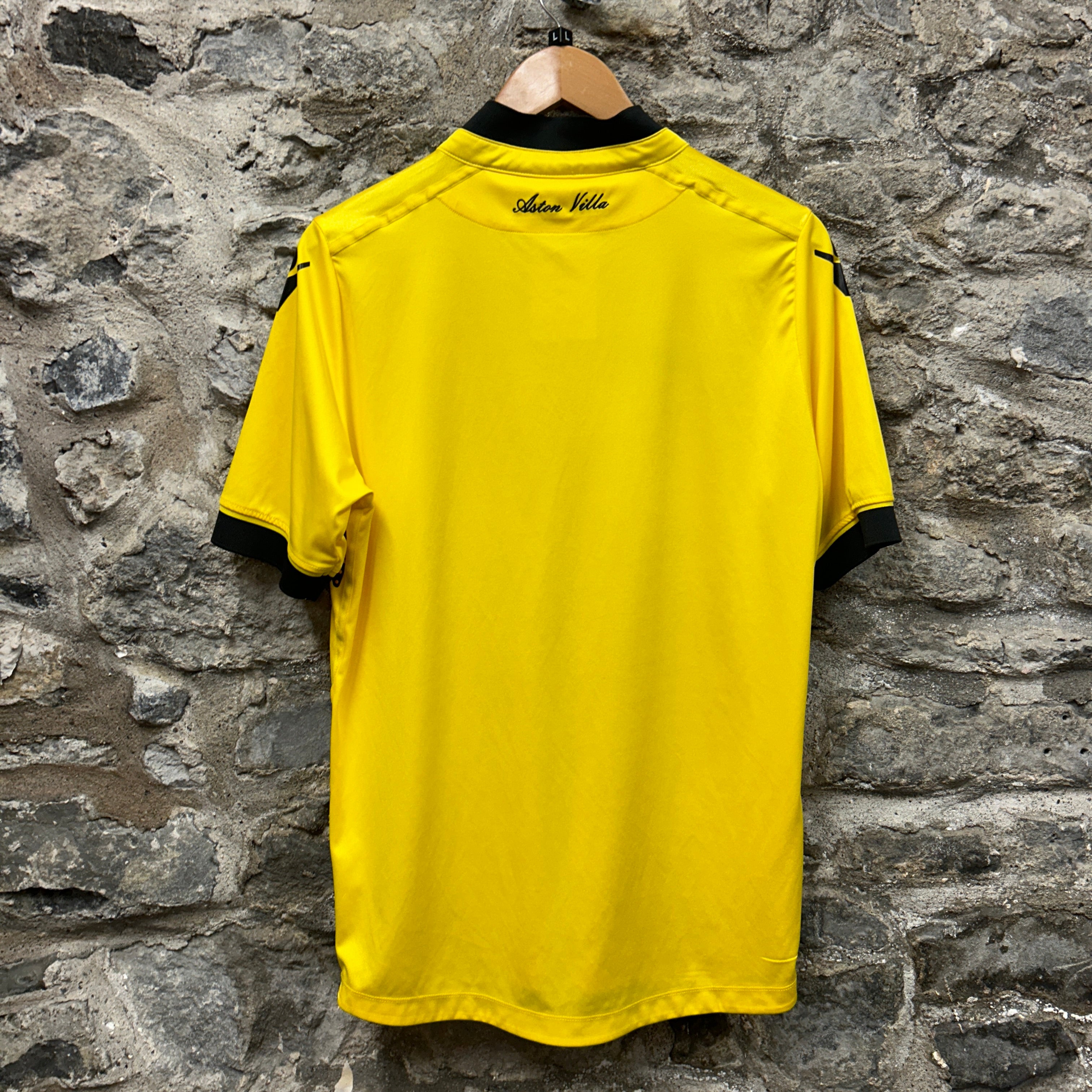 Product details: Aston Villa (AVFC) Macron football shirt in bright yellow with black ribbed collar and sleeve cuffs. Embroidered Macron logo at chest, stitched AVFC crest patch with "PREPARED" text, and large Intuit QuickBooks sponsor print on front. Shoulder Macron motif in black and "Aston Villa" script embroidery at back neck; short placket/henley-style neckline. Smooth performance fabric typical of mid-2010s kits. Brand: Macron.| Label Size | |