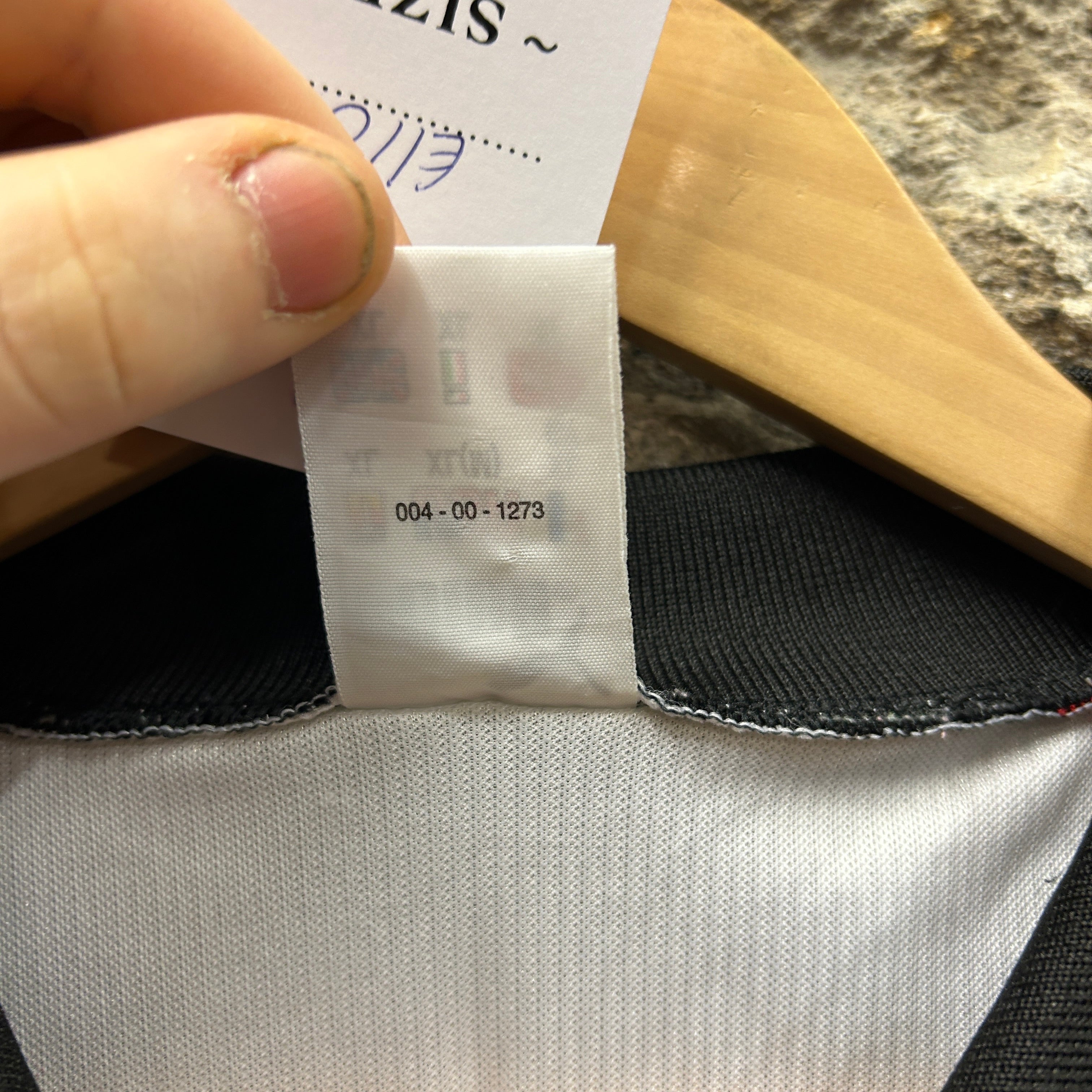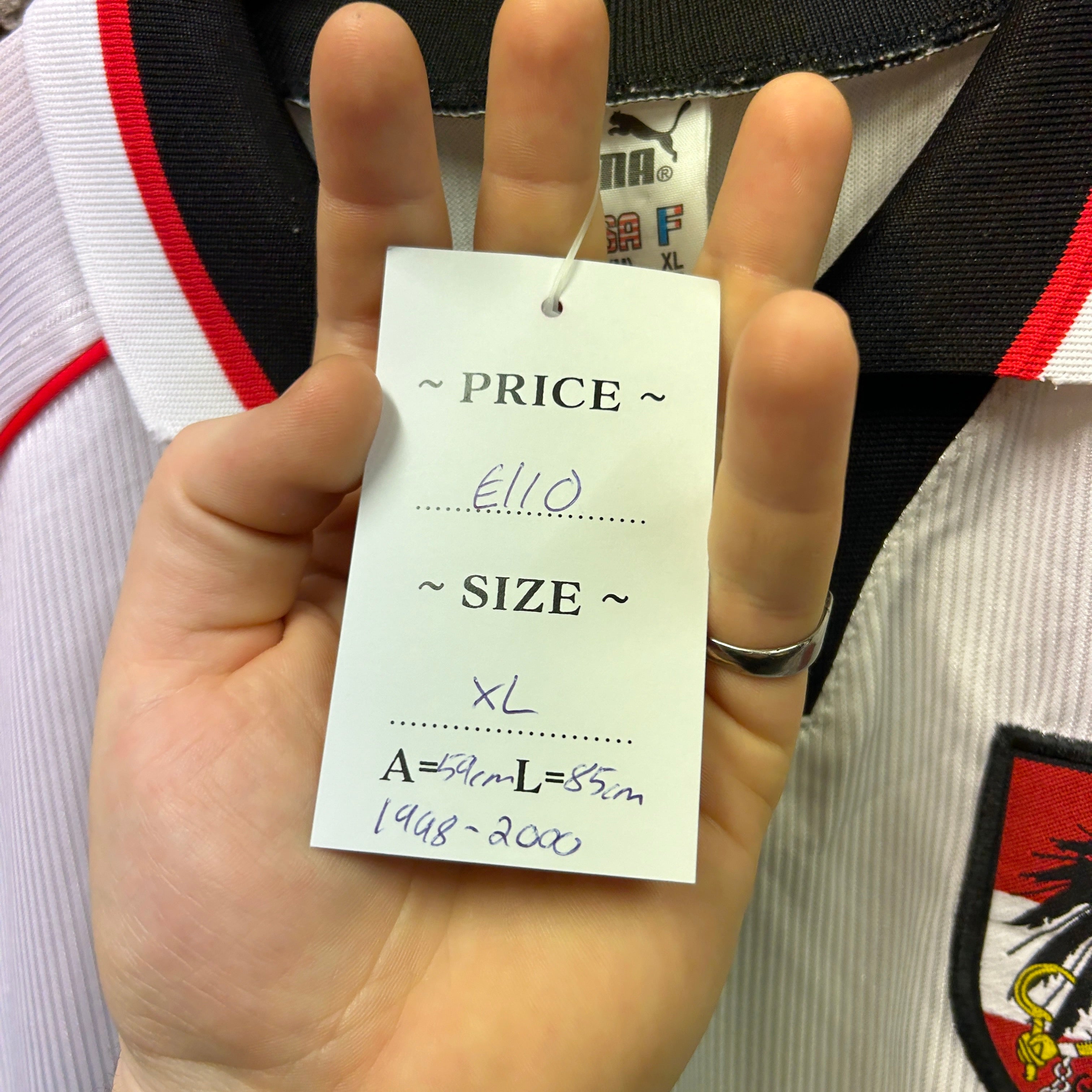 Product details: Vintage Puma Austria football shirt in white with black side panels and red piping. Ribbed/shiny polyester-style performance fabric, black polo collar with red/white tipping and a short V-insert placket. Embroidered Puma cat on chest, embroidered Austria crest patch, and woven "PUMA Official Merchandise" hem badge. Austria flag detail at sleeve cuff; raglan-style seams. Note: shop swing tag and stone-wall backdrop visible in photos. Brand: Puma.| Label Size | |