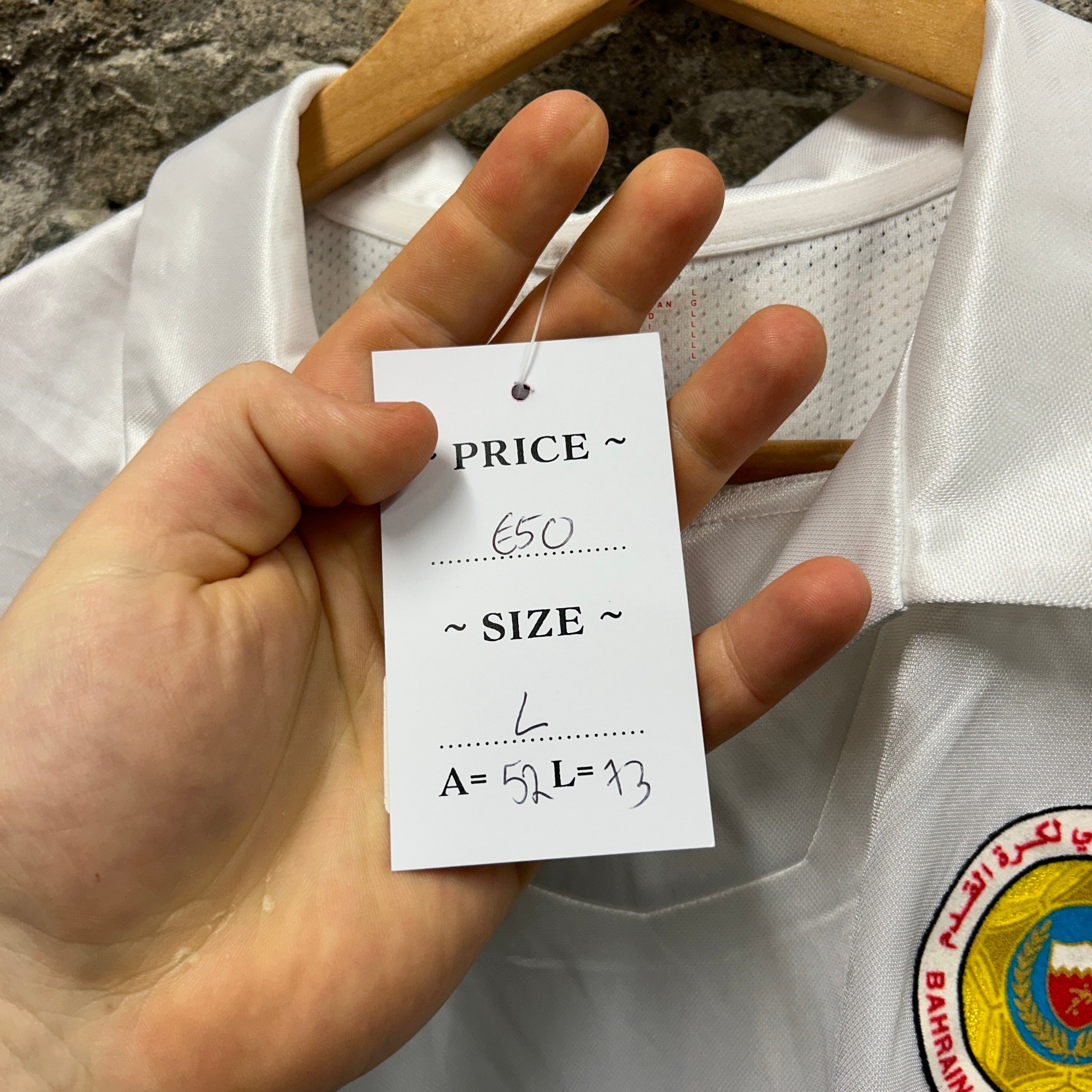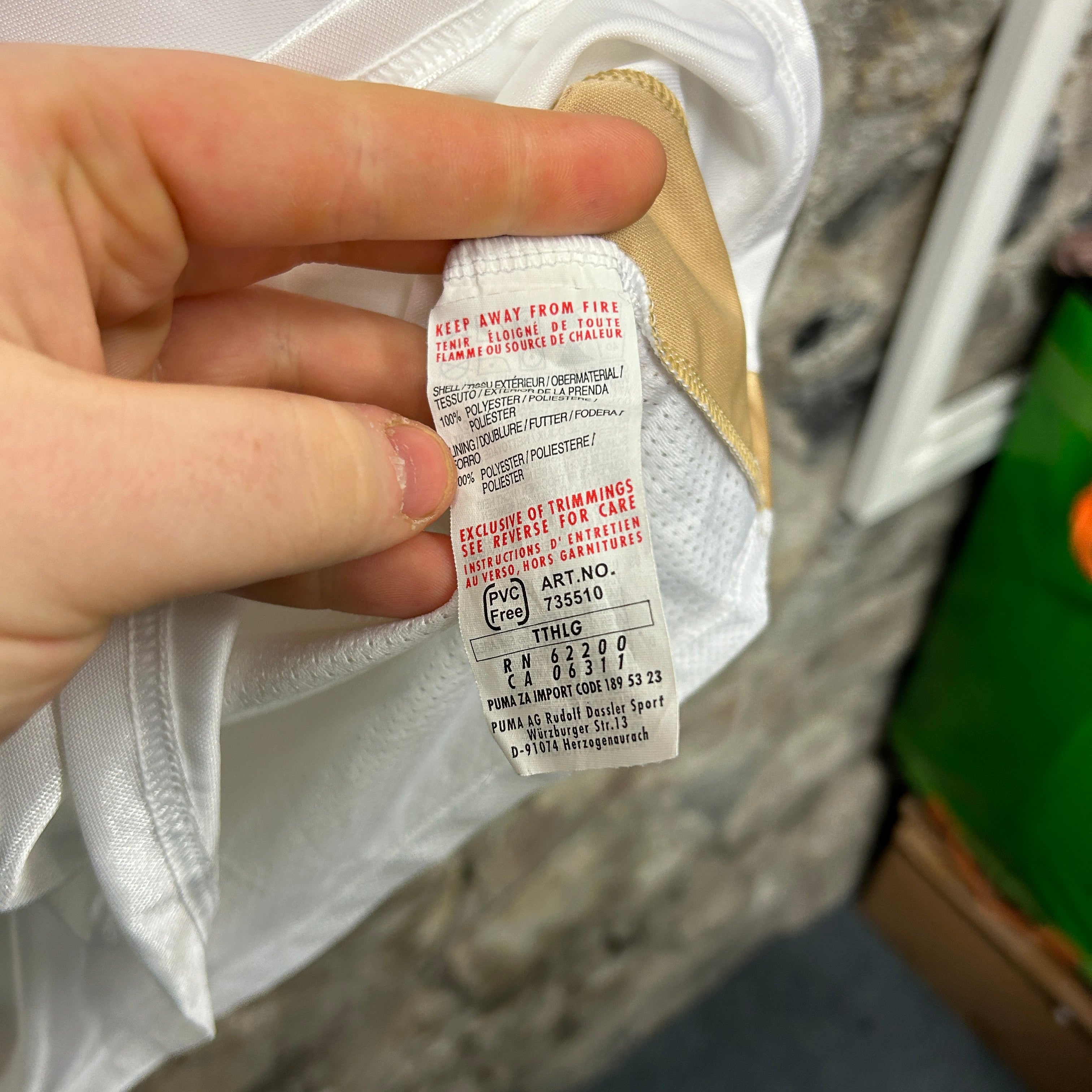Product details: Puma Bahrain Football Association shirt in white with metallic gold contrast side panels and sleeve cuff trim. Features embroidered BFA crest patch with Arabic text and "Bahrain Football Association" on chest plus red Puma cat logo. Collared V-placket front; lightweight performance fabric with mesh ventilation panels (raglan-style back/side inserts). Size L shown on inner print label; care tag indicates 100% polyester, made in Thailand, PVC free, art. no. 735510. Brand: Puma.| Label Size | |