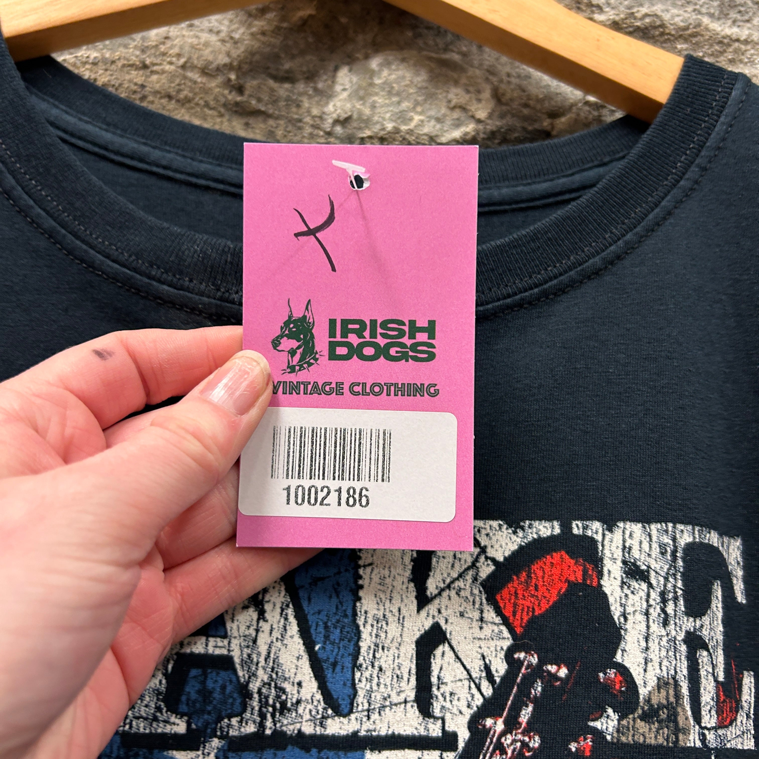 Product details: Black crewneck tour T-shirt with large distressed front graphic reading "BLAKE SHELTON" over an Americana flag-style backdrop and guitar illustration; back print lists "Well Lit & Amplified Tour 2012" dates/cities in red/blue/white. Visible light/bleached-looking marks on upper chest/shoulder areas; standard short sleeves and straight hem. Brand: .| Label Size | |