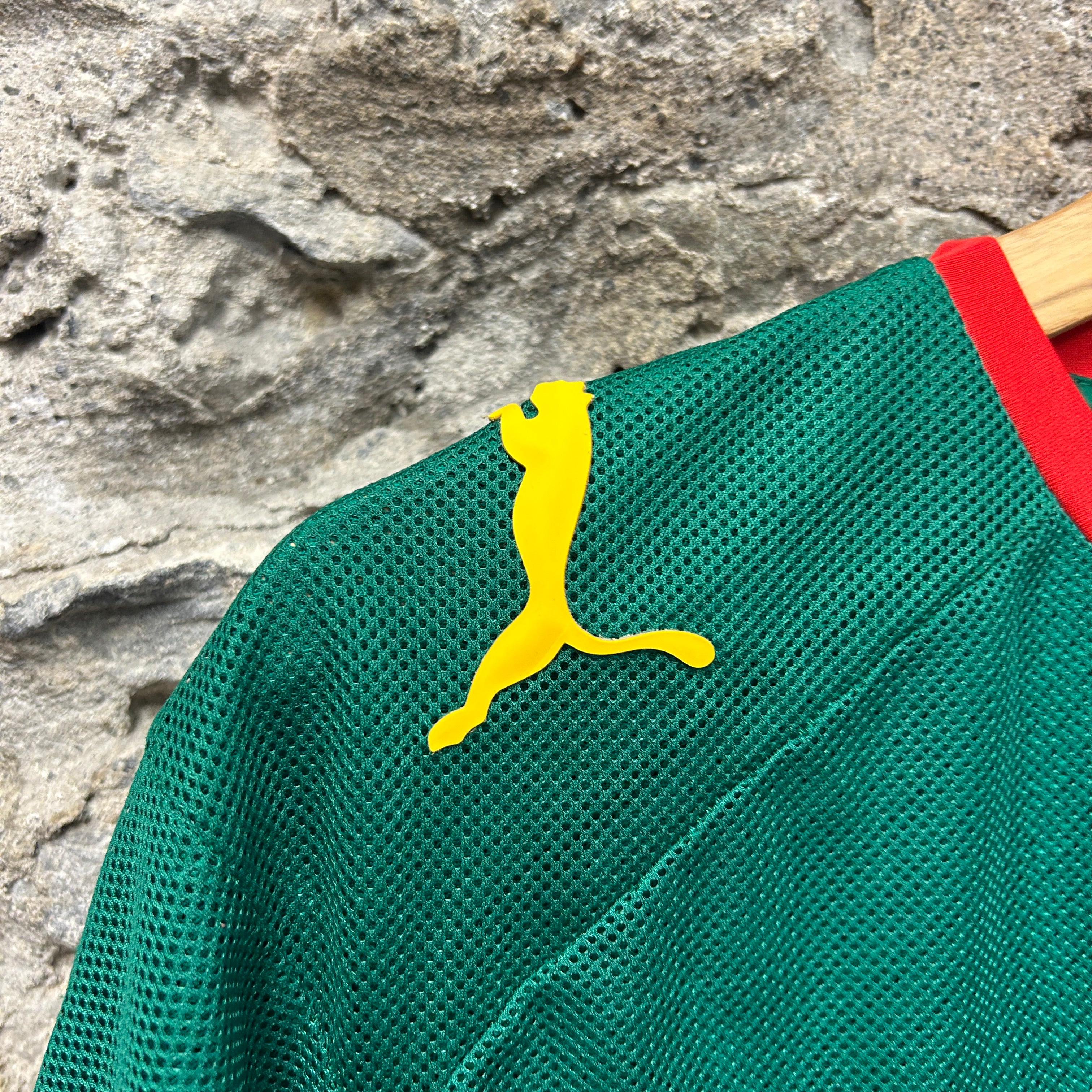 Product details: Puma Cameroon national team football shirt in green breathable mesh with red V-neck and sleeve trim, yellow Puma cat logos on shoulders/chest, embroidered Cameroon FA crest and large embroidered lion head badge; red side panels; small graphic tab near hem. Minor faint marks/pulls visible on back/shoulder area in close-ups. Brand: Puma.| Label Size | |